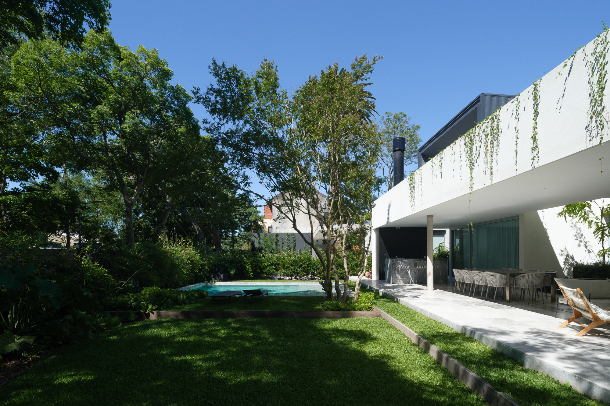 A diferencia de lo que suele suceder con los retiros laterales obligatorios —que muchas veces devienen espacios residuales—, se opta por integrarlos a la vida de la casa. A través de aperturas y un diseño paisajístico cuidadosamente trabajado, la vegetación penetra y rodea la vivienda, reforzando la conexión con el entorno inmediato.