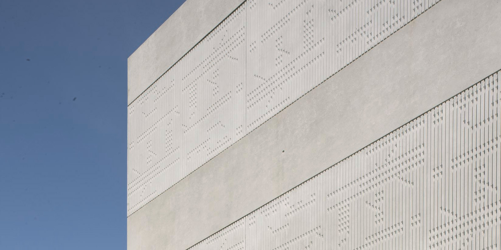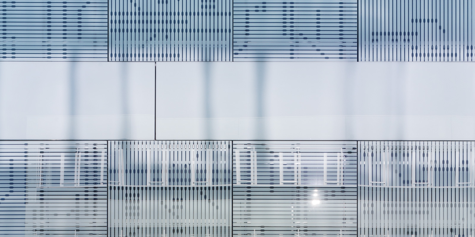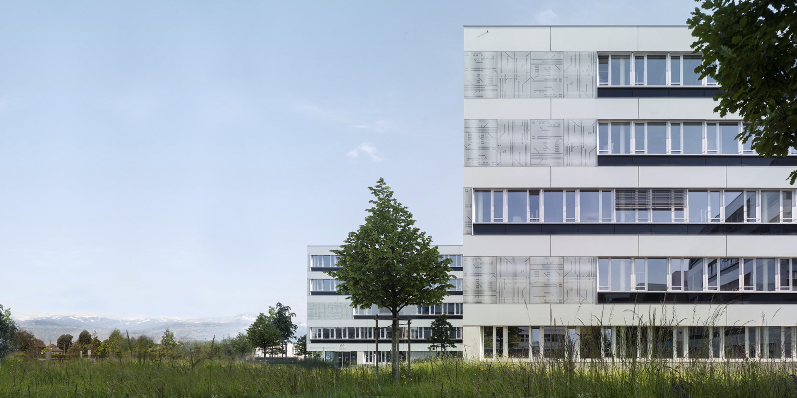 The buildings evoke an atmosphere appropriate to technological research in a convivial atmosphere and at a human scale. The utilisation of white enamelled glass, smooth or with a graphic motif on the inner face of the opaque surfaces, contributes to this. This white background heightens the green tinge typical of ordinary glass, which together with the natural landscaping elements foster a uniquely chromatic effect.