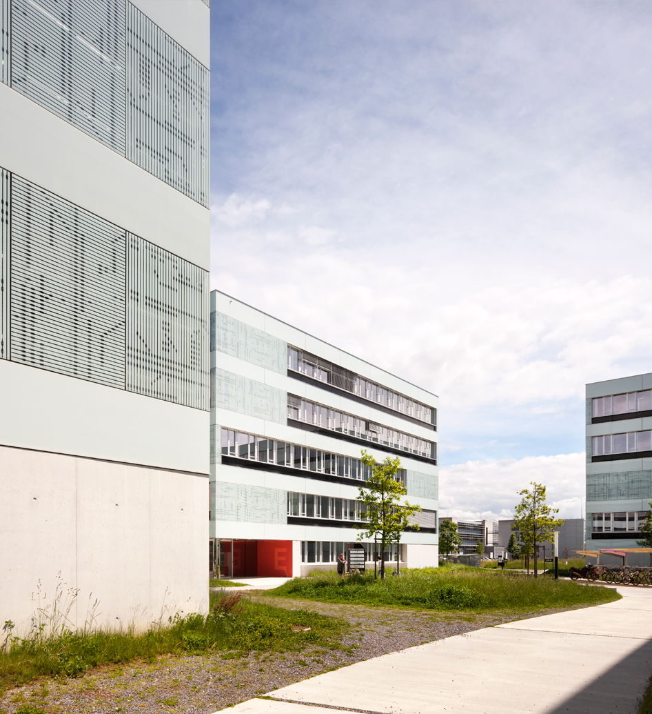Two of the buildings designed for this quarter were intended to house laboratories. They establish border at the western edge of the ensemble, and are distinguished from the rest by their facades, which combine bare concrete with details in anodised natural aluminium in the openings and the technical attics.