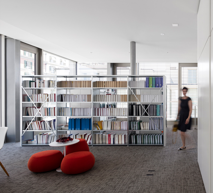 A single service core is located on the north façade, near the entrance. Its off-centre position optimises the use of space, while the load-bearing system, composed of prestressed slabs, frees up floor space with virtually no intermediate supports. The lighter structure of the attic is made of metal framing.