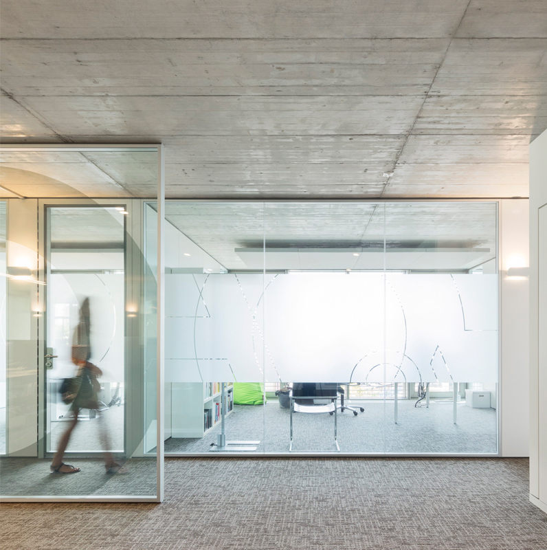 The technical choices made for the building, which meets the Minergie label, aim for energy efficiency that prioritises ease of use and economy of means. Heat is provided by district heating. The exposed reinforced concrete slabs have no false ceilings, improving energy efficiency thanks to their inertia. All technical distribution systems are concentrated in the floors. The hygienic air supply is mainly embedded in the slab, while a secondary distribution system in the raised floor provides additional supply for the conference rooms. The façade also features opening windows, which contribute to the well-being of users. The roof is devoid of the installations typically found in buildings that meet Minergie requirements. These have been deliberately housed in the basement in order to free up the roof for complete greening, out of consideration for the views from the buildings overlooking it.