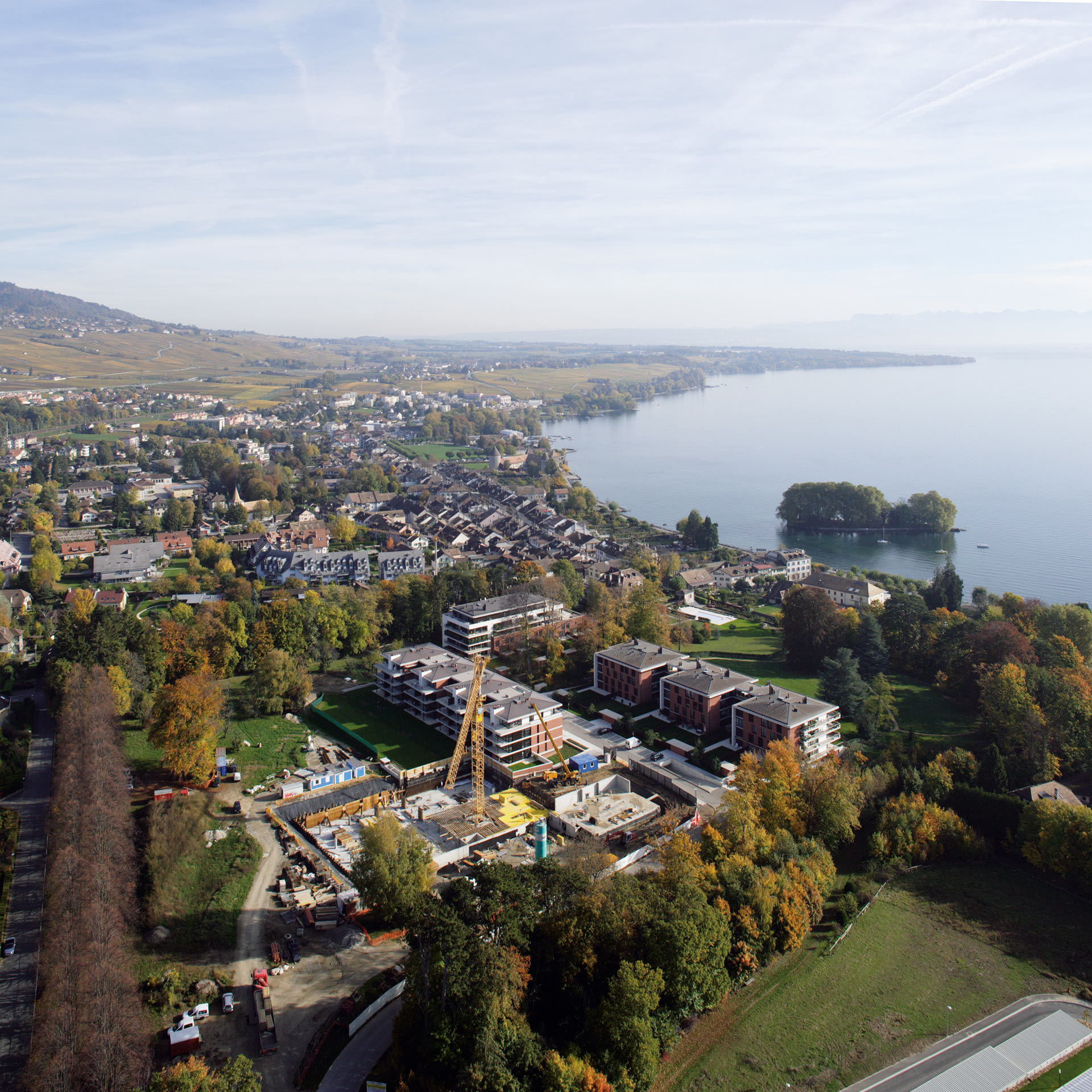 The Uttins Quarter occupies a large tree-lined plot located a stone's throw from the historic centre of the town of Rolle. In accordance with the rules of the neighbourhood plan legalised in 1996, the four residential buildings and three office buildings that make up the neighbourhood are located on the perimeter of the site and along the access road, freeing up two large communal green spaces. Built between 2000 and 2009, the buildings have different characteristics (size, shape, position on the site, use), but display their similarity thanks, in particular, to the unity of materials, dominated by red brick and grey or white concrete, and the consistency of the access systems. This sense of unity and consistency gives the neighbourhood a strong identity. In terms of access, the four residential buildings share a careful management of the transition between the public space of the street and the private space of the dwelling, through semi-public outdoor spaces - adapted to the topography - and semi-private distribution spaces, a kind of internal street. In terms of typology, these four buildings develop variations on the bar type, from the articulated bar in plan and section (E, G), through the cut-out, stepped bar (F, G), to the hybrid type of building D, whose three sections, connected by terraces, present a continuous façade on the park side, but which, on the street side, can be seen as the articulation of three blocks defining two open courtyards.