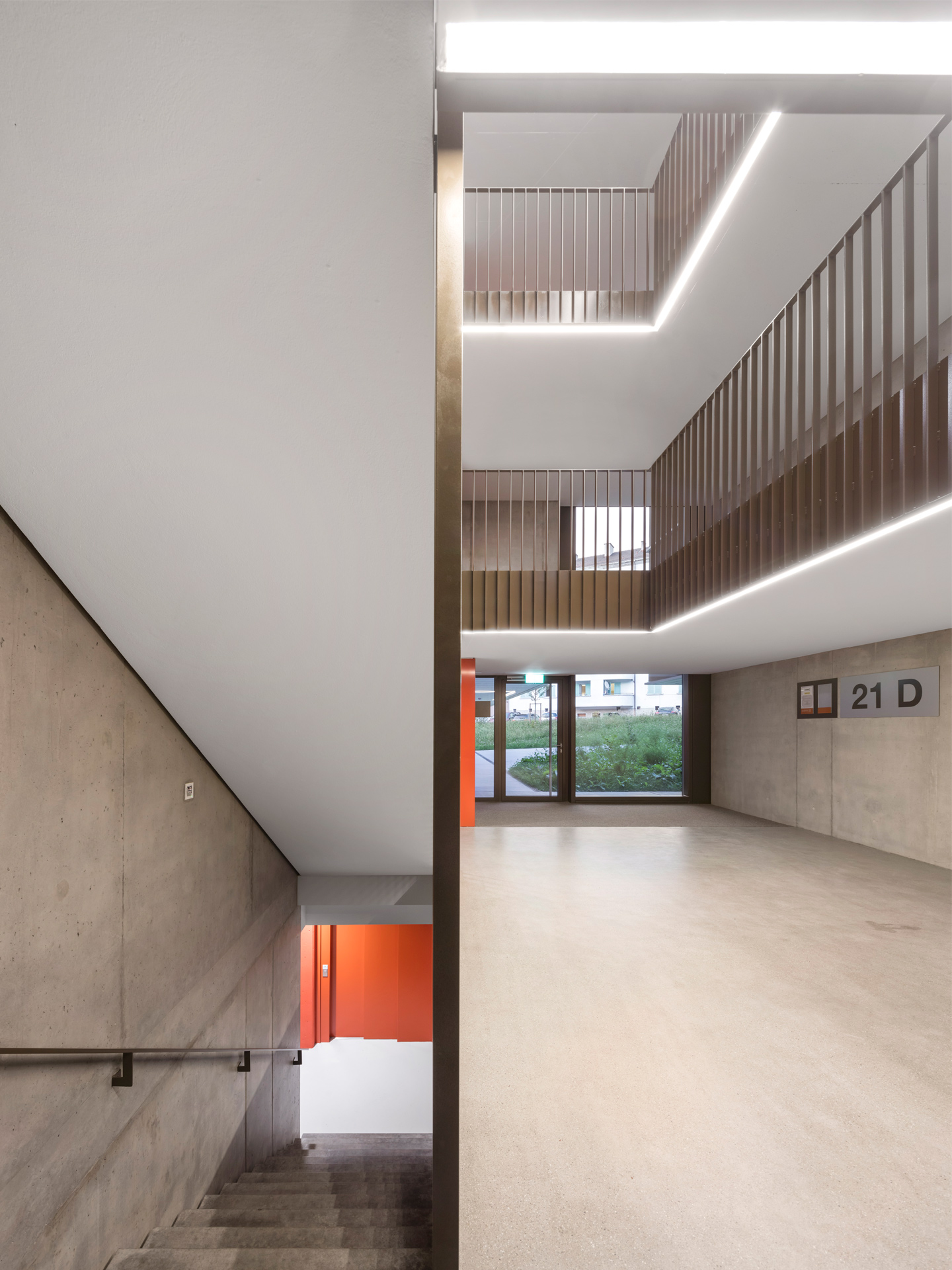 Una implantación en relación con el entorno: Dos elementos muy importantes condicionan y orientan el proyecto: Por un lado, la avenida Gilamont, que se caracteriza por un tráfico denso. Su lado este presenta un frente urbano claramente definido, siguiendo un orden contiguo de construcciones. Por otro lado, el Veveyse, bordeado por una franja arbolada, marca un importante contraste al evocar un carácter paisajístico y sereno. En planta, el edificio describe una forma de «T». La barra norte/sur sigue el eje del Veveyse, tratando de escapar del ruido de la avenida Gilamont, mientras que la barra este/oeste se orienta perpendicularmente a la avenida Gilamont en busca de privacidad. Esta forma urbana ofrece interesantes despejes visuales y espaciales a lo largo de la avenida Gilamont, evitando reforzar el efecto pasillo iniciado por la fachada construida existente. En su relación con la topografía, el edificio se asienta en el terreno disociando el nivel público de entrada del primer nivel de las viviendas. Este dispositivo de acceso confiere un carácter más público a la relación del edificio con la calle, al tiempo que garantiza una gran privacidad a los apartamentos.