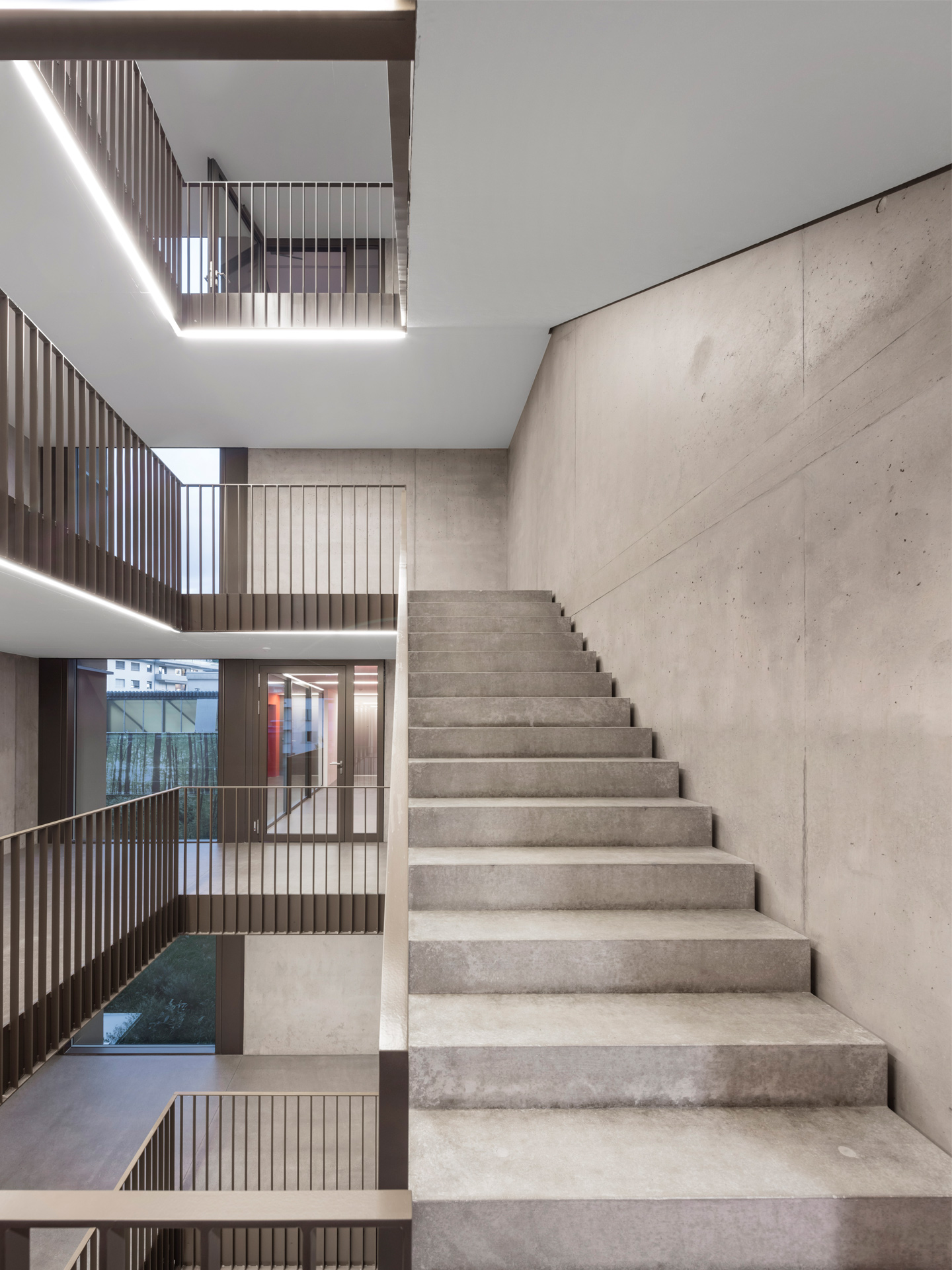 Materialidad: Sobrio y refinado, el edificio se inspira en el pasado industrial del lugar. La materialidad deseada y la delicada elección cromática permiten integrar el edificio sin rupturas en el tejido circundante. La envolvente exterior se compone de materiales sencillos (enlucido periférico, balcones y marcos de ventanas de aluminio anodizado colinal), todo ello con acabados cuidados y salpicado de algunos toques de color rojo que crean una cálida armonía. Los perfiles esbeltos y horizontales de aluminio anodizado natural marcan los diferentes niveles y permiten refinar la volumetría general del edificio. Para los acabados interiores se han elegido materiales de calidad, que evocan una forma de domesticidad, alejándose de los códigos habituales y comunes de los edificios de alquiler: hormigón visto y enlucido fino para las paredes, parquet de roble para los suelos. Las instalaciones exteriores ofrecen alrededor del edificio lugares de encuentro acogedores para los residentes, así como zonas de juego para los niños.