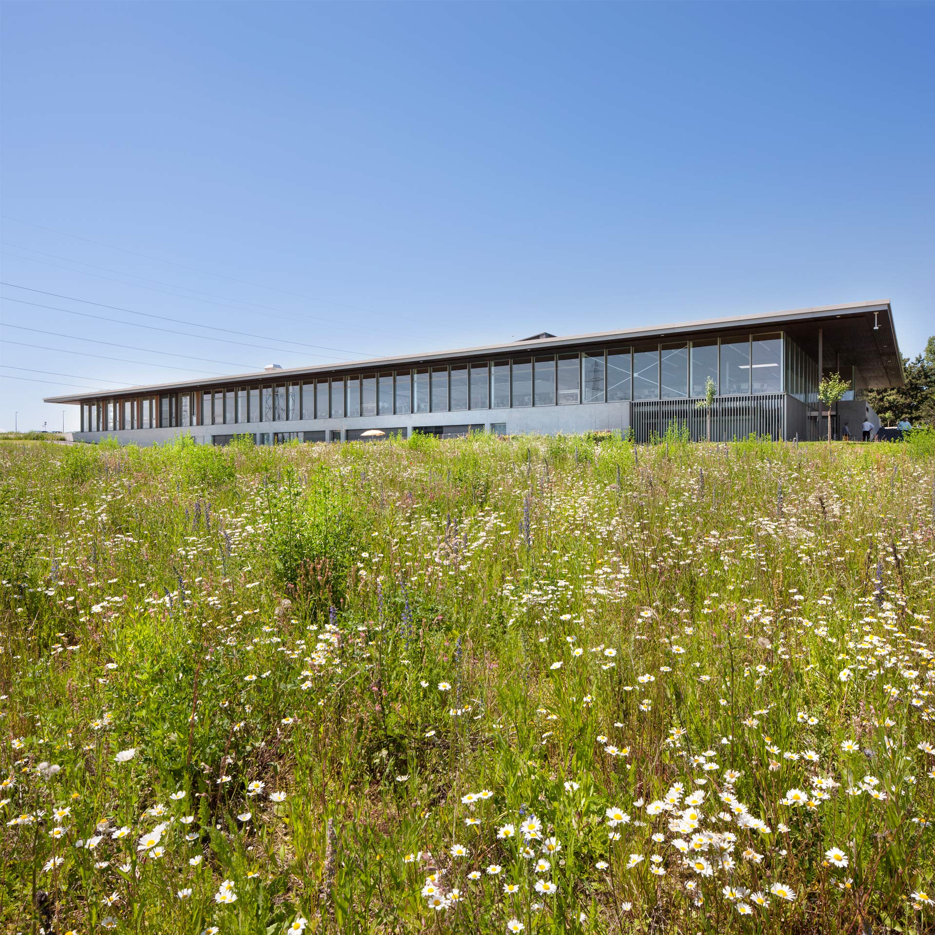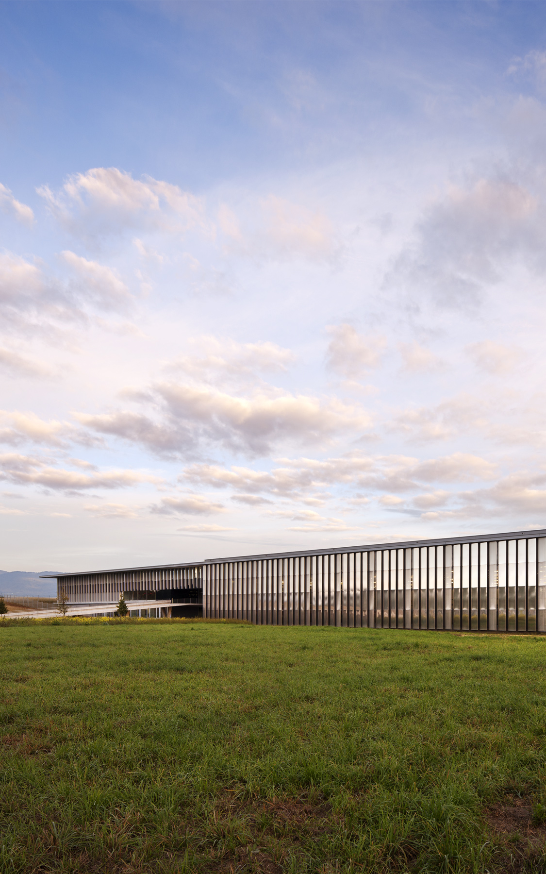 La figure horizontale du bâtiment, renforcée par la ligne de l’avant toit, se projette sur le paysage, contrastant avec les ondulations naturelles du terrain. Cette horizontalité est accentuée par l’axe de la « Promenade des Alpes » aménagée par l’Atelier du Paysage, composée d’un bassin en pierre naturelle qui longe la promenade, et qui se prolonge par une généreuse rampe conduisant à l’entrée principale. Cette promenade joue le rôle de véritable colonne vertébrale paysagère structurant l’ensemble du site.