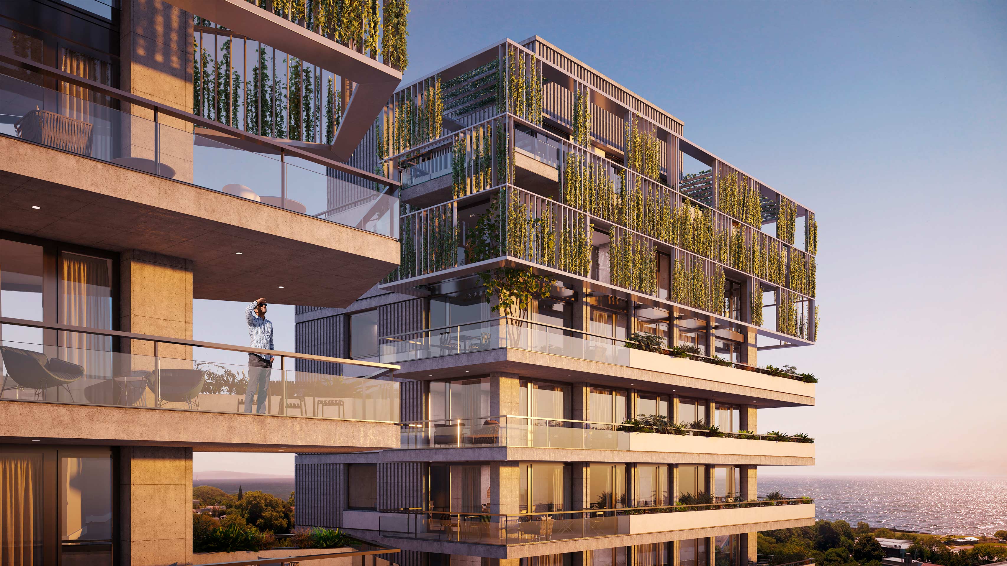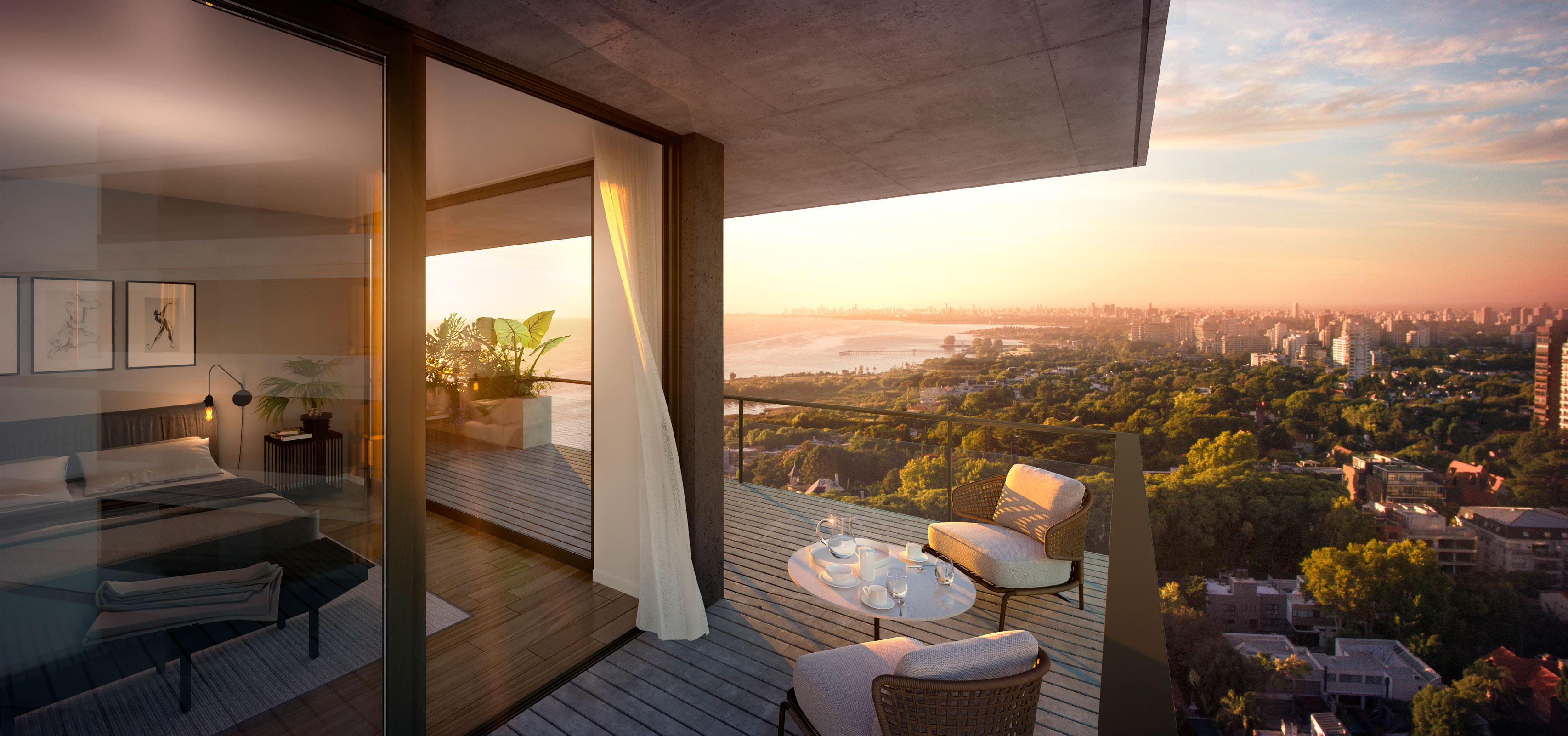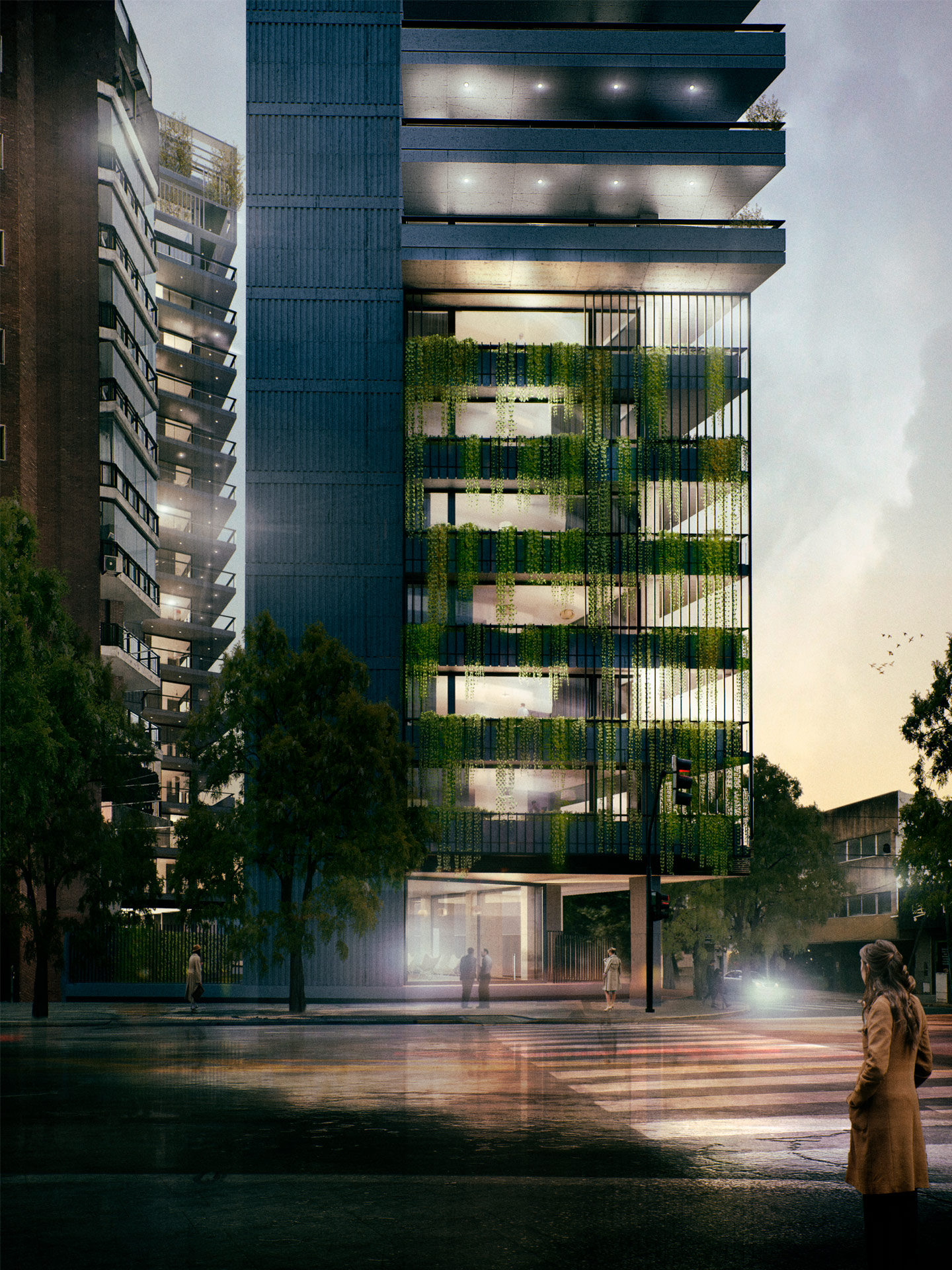 The project, fruit of a collaboration between the offices of Lausanne and Buenos Aires, proposes the implementation of two 17-storey residential towers, both crowned with an attic containing communal facilities such as a swimming pool and a spa.The project responds to the problem of the high sound pollution of the Avenida del Libertador, through the implantation and shape of the buildings, the position of the living spaces and the treatment of the facades. At the same time it seeks to enhance the qualities of the site offering multiple views of the Río de la Plata. Located on Avenida del Libertador, the building offers multiple options for entertainment and commercial offer. At the same time and thanks to its access through Vicente López street, it will allow its future residents to enter the intimacy of a true neighborhood of Buenos Aires, on a more domestic and welcoming scale. The project consists of 2 towers with 66 apartments. All with impressive panoramic views, with an architecture at the service of well-being and with an amenities program that proposes a healthy and quiet habitat. Thanks to its particular location, between Avenida del Libertador and Río de la Plata, the elevated location of the lot and the open layout of the building's structure provide extraordinary views from the apartments of both towers. The lounge rises 55 meters above the ravines, offering dazzling views over the shores of Río de la Plata. The language of facades advances with balconies towards the river, generating spaces of tranquility and relaxation. Durable materials such as exposed concrete were prioritized in contrast to white precast concrete beds. The material palette is completed with aluminum elements that provide warmth and reinforce the building's lines. The building invites users to a biophilic experience that brings nature closer to everyday life. The architecture is complemented by the vegetation through its vertical gardens that favor sustainability and enrich, by contrast, the character of the building's clean lines.