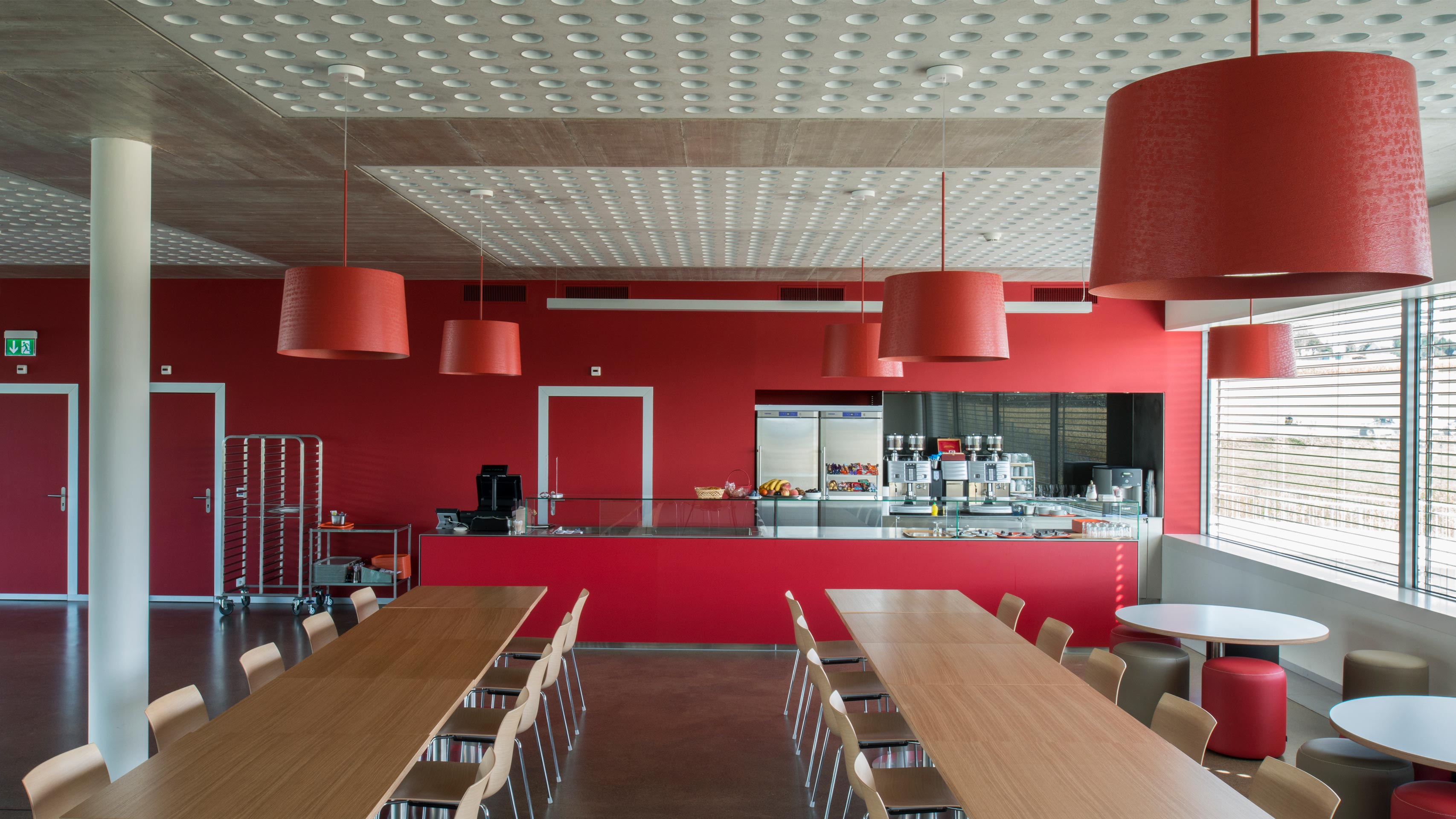 This project to organize and extend an industrial headquarters complex in the countryside of the French Swiss Canton of Vaud explores the richness of the relationship between the built ensemble and the rural landscape it occupies. Since 1974, the Bobst Group, major producers of machinery for the manufacturing of packaging materials, has occupied this 29-hectare parcel in a bucolic setting to the west of greater Lausanne, straddling the three communes of Mex, Villars-Sainte-Croix, and Vufflens-la-Ville. In 2012, Bobst decided to centralize all of its production activity in Mex. A new building at the main entrance to the site was designed to accommodate 6,100 square meters of office space as well as a vast showroom and training facility spanning another 4,000 square meters. At the other end of the site, next to an existing sports field and gymnasium, a second new building was designed to house a restaurant – a glass pavilion offering views of the near and distance landscape – and a day care center for up to 40 children. Across from this, an existing production facility was extended to increase factory space by 14,000 square meters.