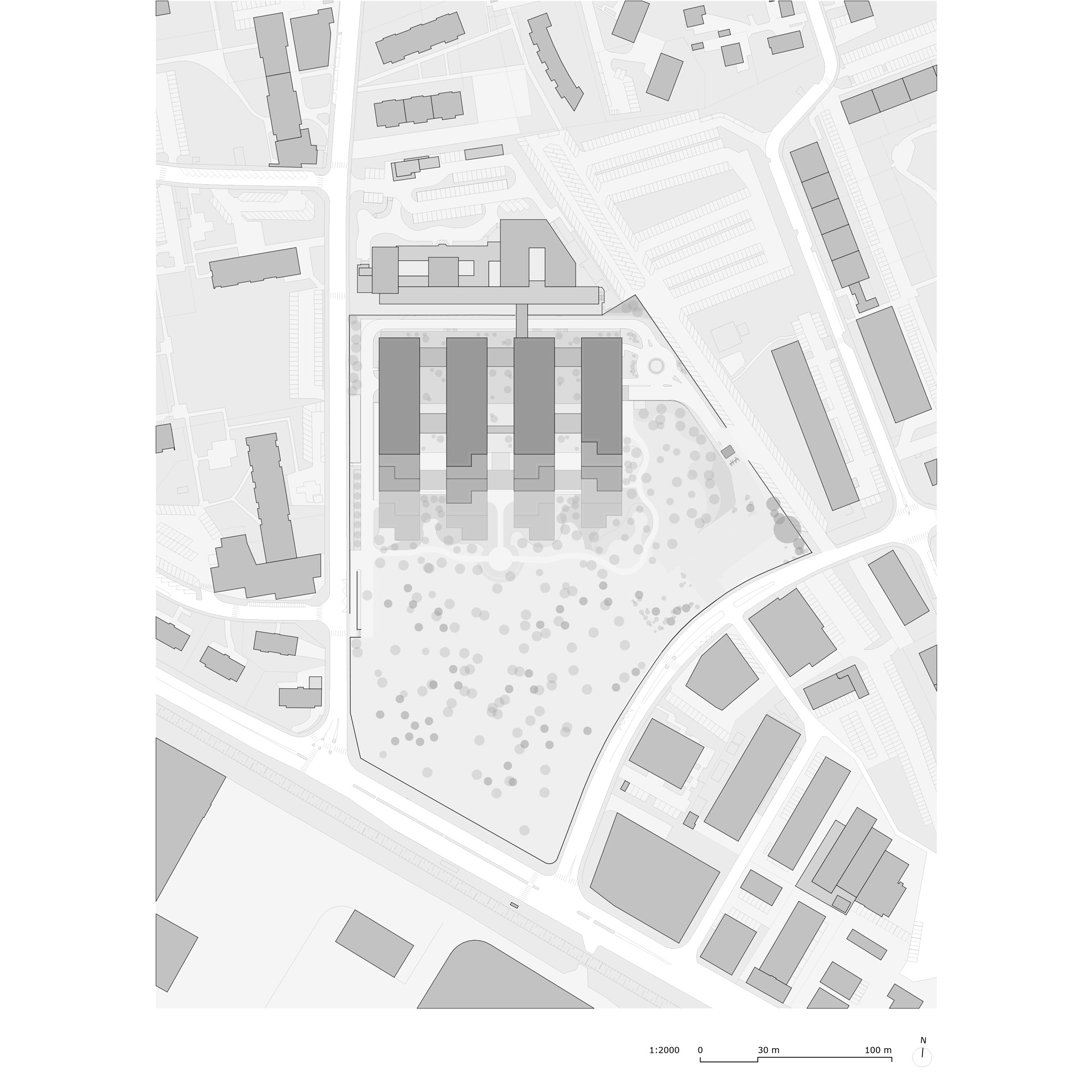 An underground bicycle parking facility (with a capacity of 400 bicycles) is integrated into the site.