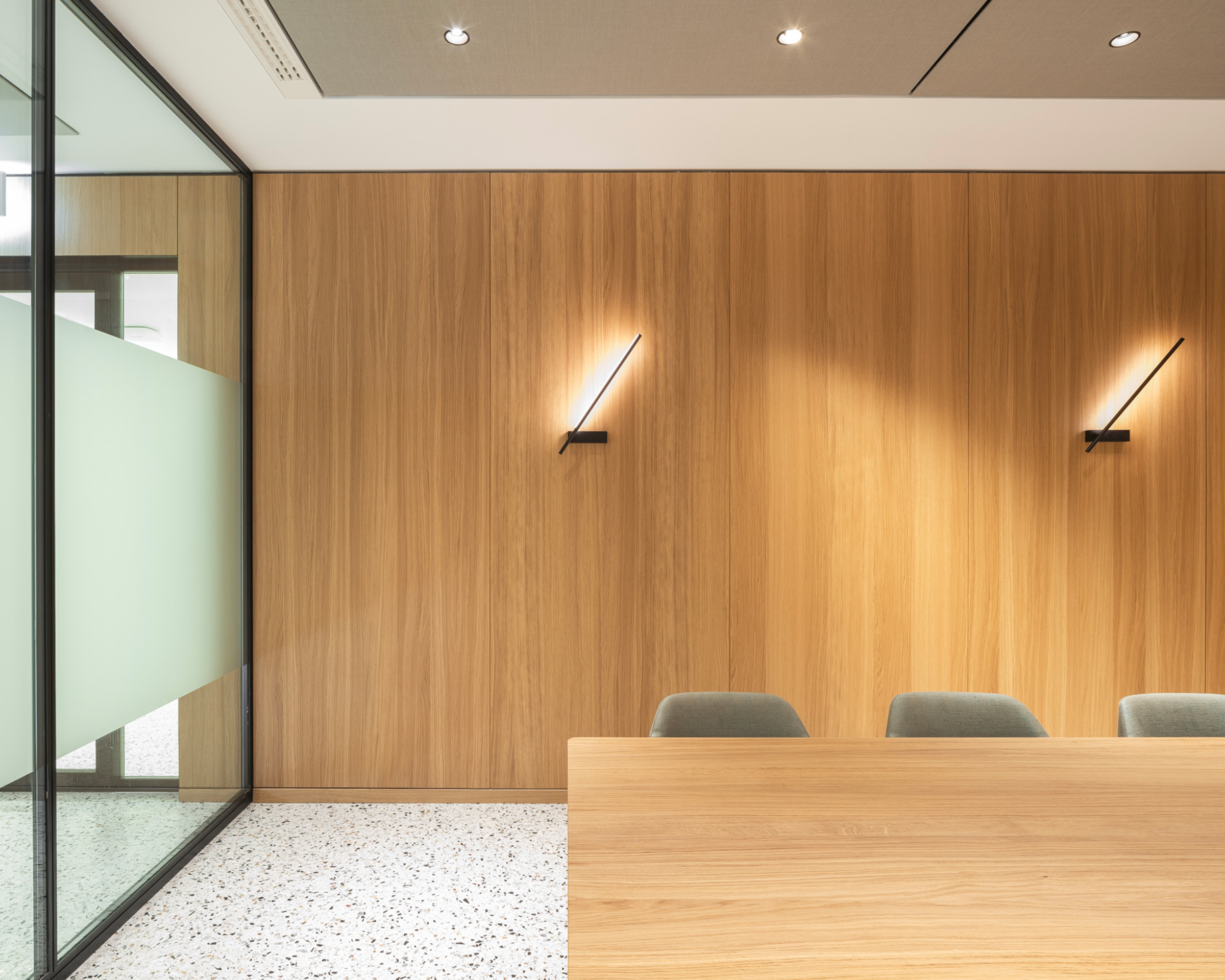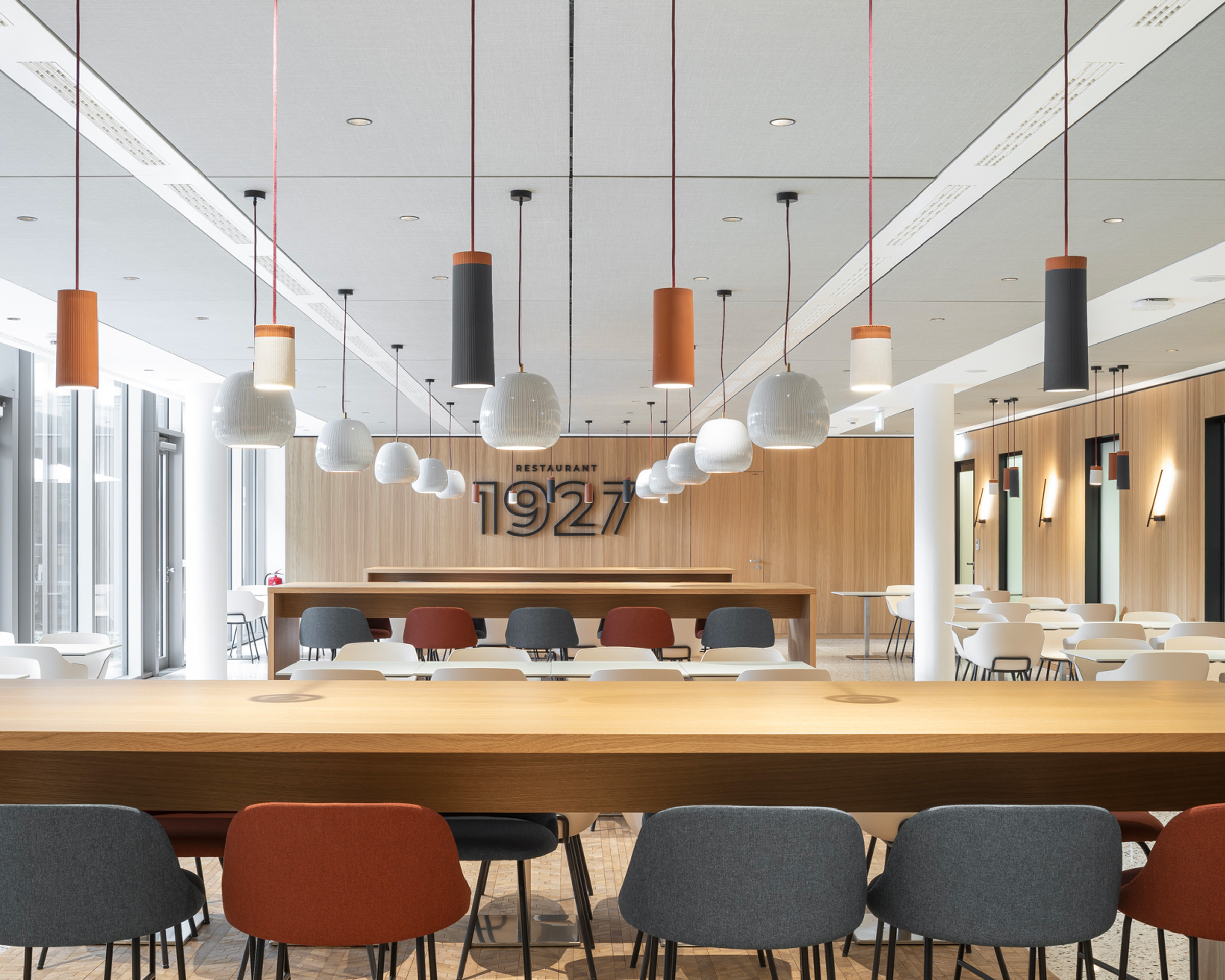 The main and transverse distribution on the ground floor has been reworked and reinforced in its programming. It houses a series of common areas, conference rooms, meeting places and catering areas such as cafeterias. A main restaurant is located on the lower ground floor, extending onto one of the patios. A 100-seat auditorium completes the conference room facilities.