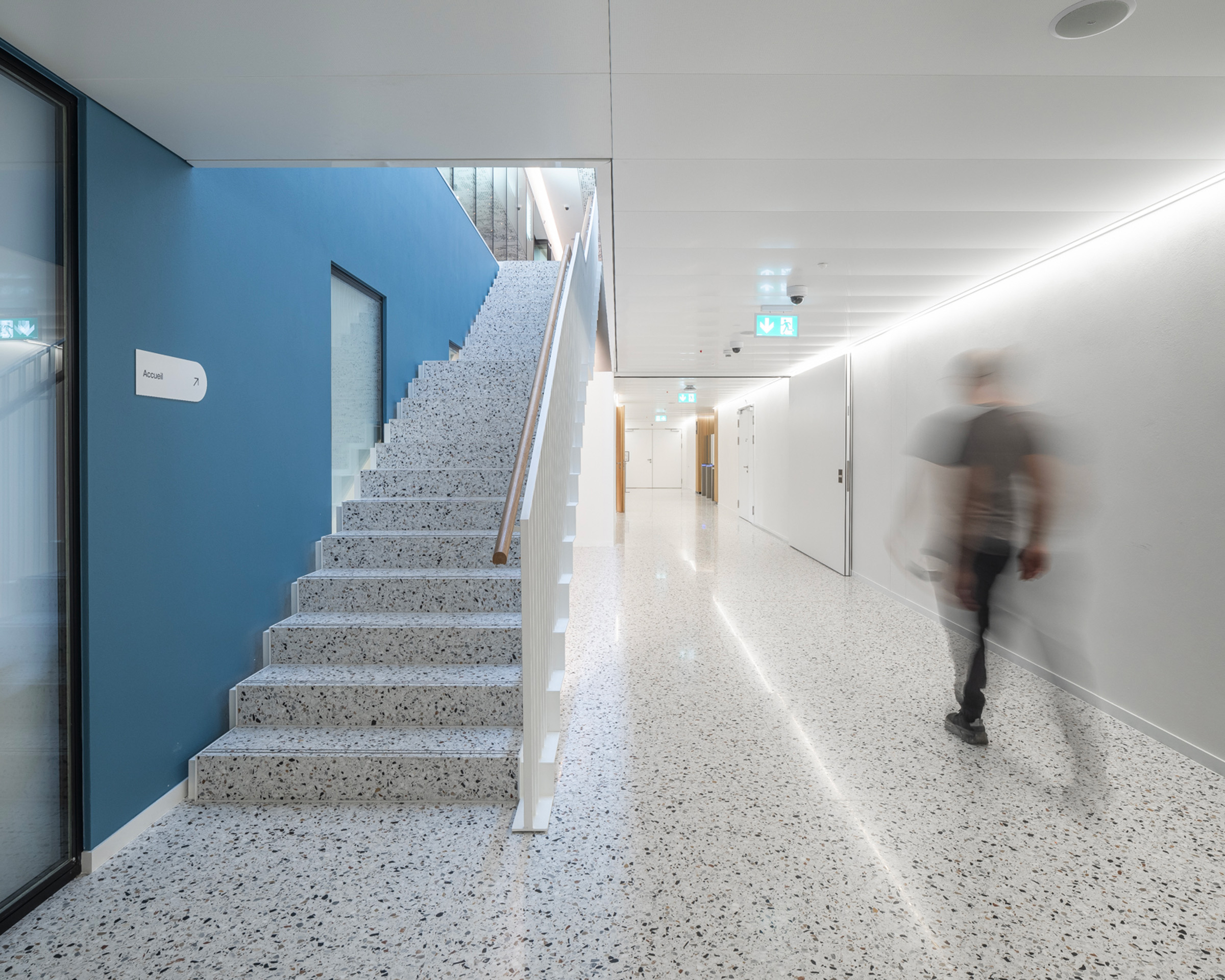The campus has been awarded the Minergie P label for its energy-efficient design and the significant share of renewable energies in its energy mix, with 1,300 photovoltaic panels on the roof covering 20% of the building's energy needs. The campus is connected to district heating with a new-generation system that will guarantee around 80% renewable energy from 2024. Approximately 70% of the reinforced concrete is recycled, with recycled aggregates mainly recovered from the demolition of the buildings that previously occupied the site.
