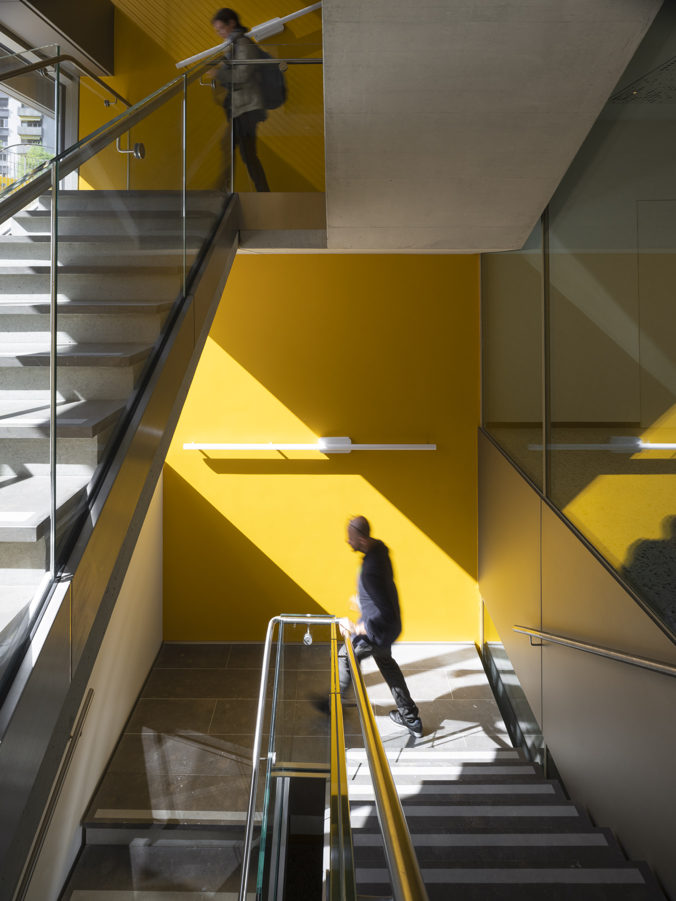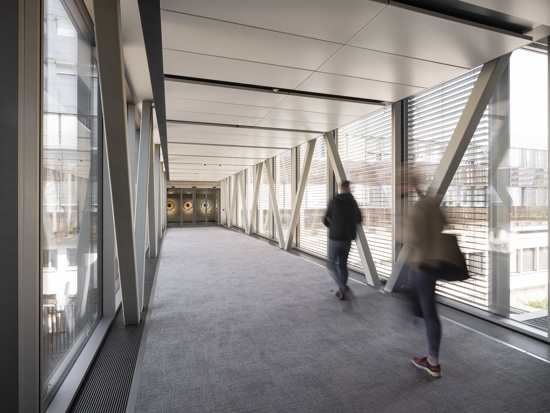 The envelope consists of curtain walls bordered by walkways protected by sunshades. This simple and proven system allows for generous views from the workspaces onto the green spaces between the buildings, as well as the more distant landscape.