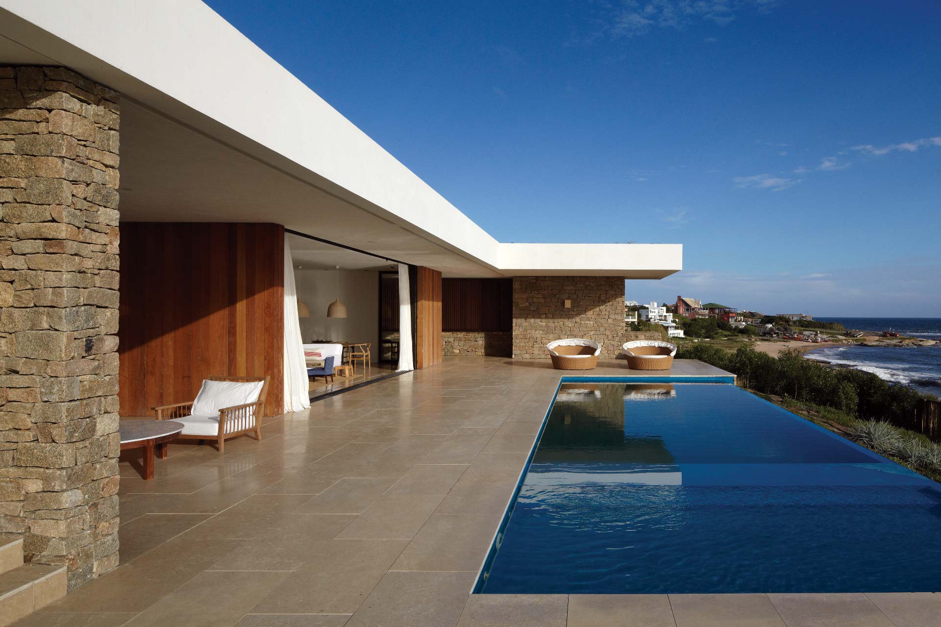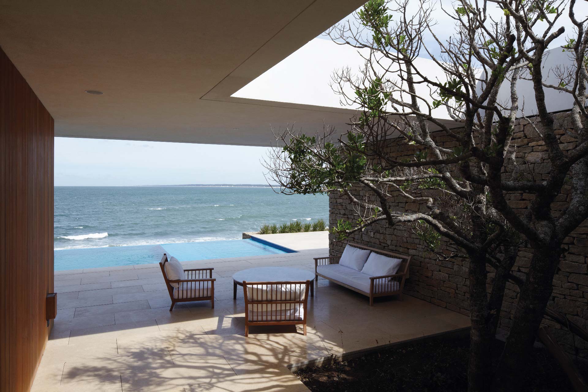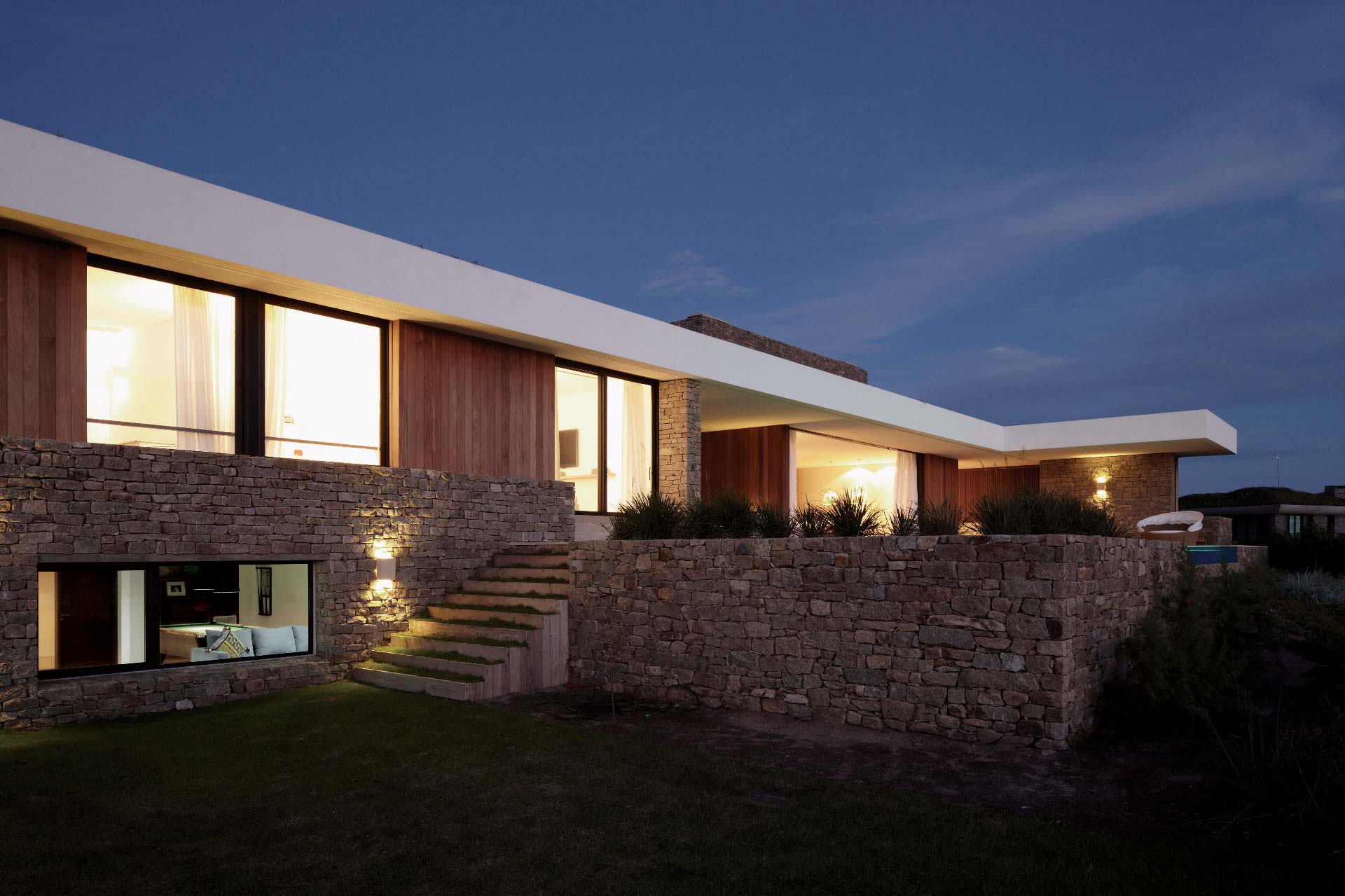This family holiday home, used continuously in summer and occasionally in winter, is located by the sea on a privileged plot on the calm beach of José Ignacio. The site slopes gently towards the sea and offers views to the west towards the sunset. On one side, to the south, is one of the access roads to the beach, which is very busy in summer. The programme is developed almost entirely on a single floor that is slightly staggered following the natural slope of the land. The house consists of a series of stone-walled pavilions, separated by courtyards and covered by a large vegetated slab. This garden roof is a powerful horizontal gesture that connects the house with the sunset on the sea horizon. Both elements define the social area of the house as a sequence of outdoor, indoor and semi-covered spaces that relate to each other, creating different conditions of use adapted to the climatic variables of the location. The large sliding windows allow the house to be enjoyed in summer as a large shaded outdoor space. The house is consolidated on the south elevation, where the service functions are located, seeking protection from the wind and the public access road to the beach. The tower on the corner defines its discreet presence in the landscape of the village of José Ignacio.