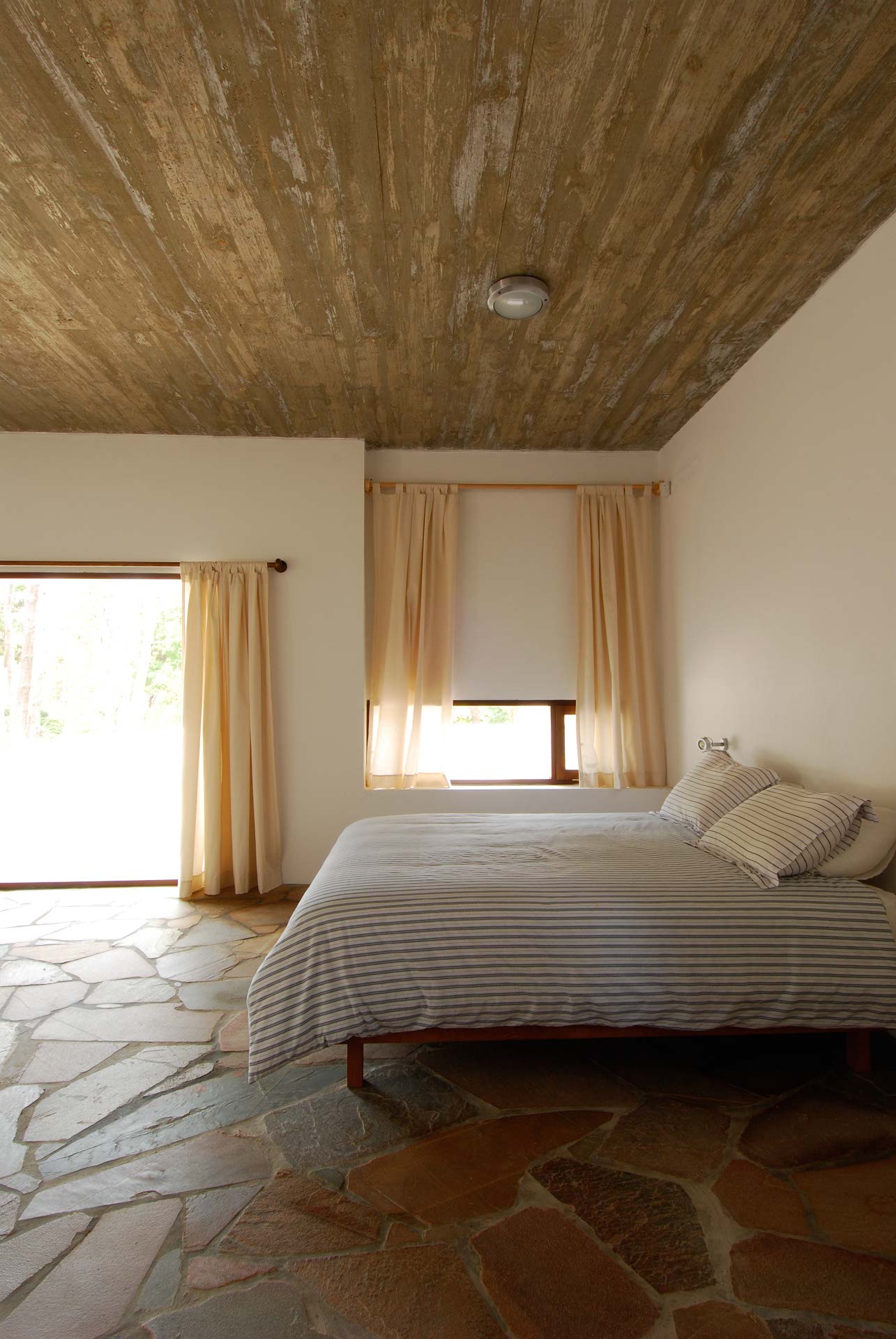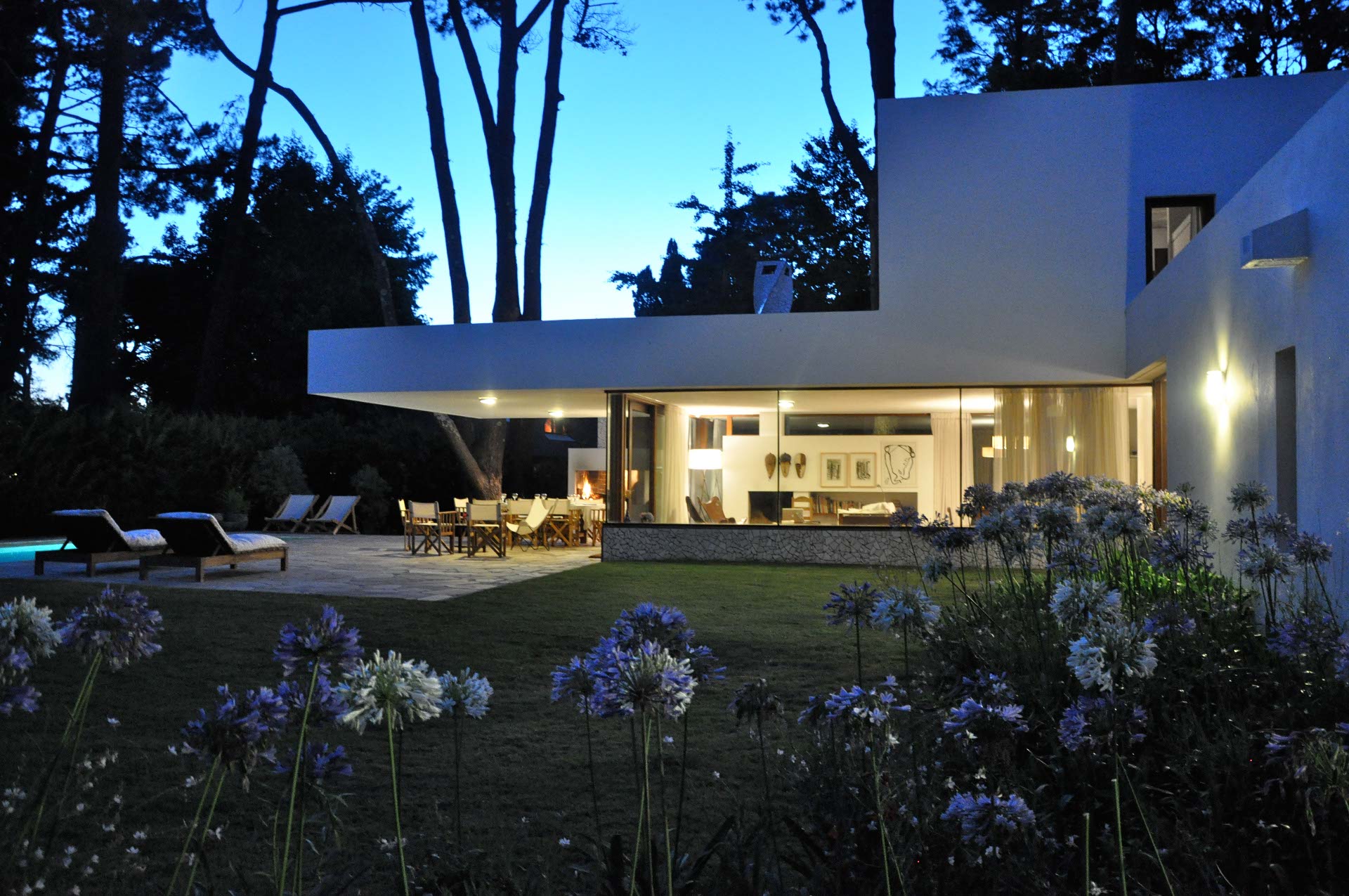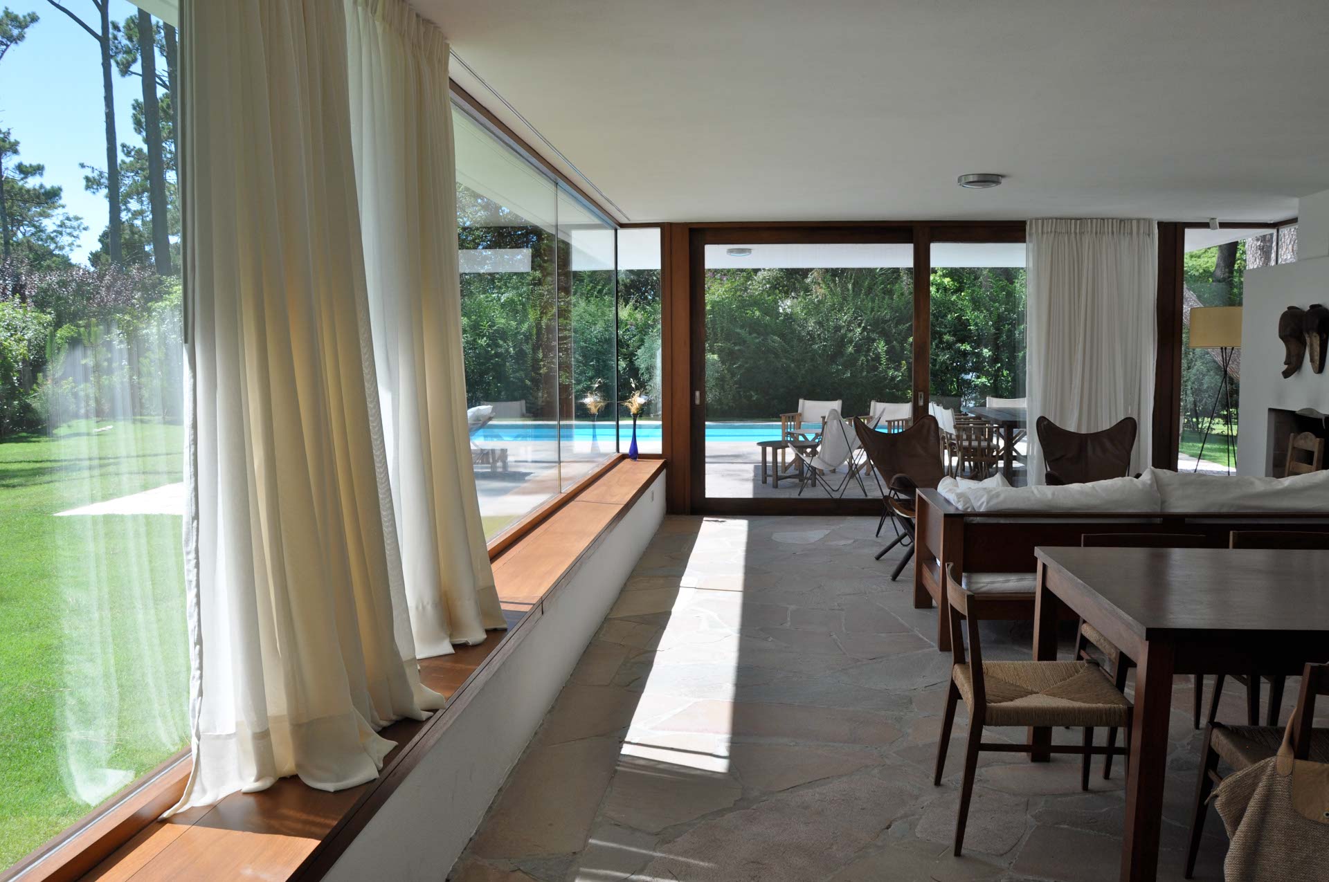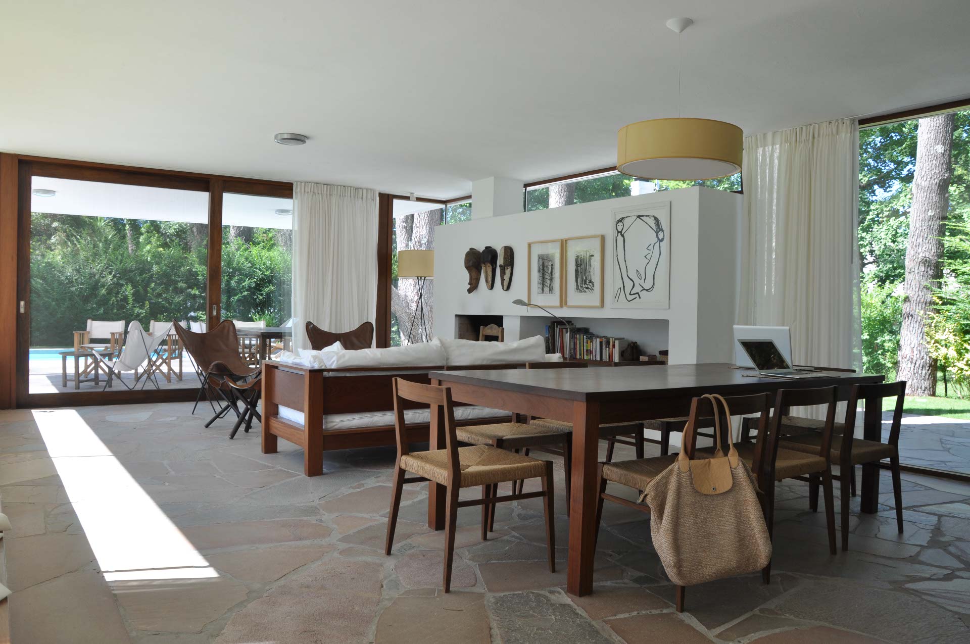 Villa Hilaria is a simple holiday home. All rooms are located on the ground floor except for the master bedroom, which is upstairs. The house has two wings, the first of which contains two bedrooms, a bathroom and a complete suite. The second, perpendicular to the first, houses a single living area (living room, dining room, kitchen) which extends onto a terrace covered by a large canopy. The L-shape has made it possible to preserve two existing pine trees and give the garden a certain intimacy by protecting it from the street. The construction is as simple as the programme. Built in just five months, the house is composed of load-bearing brick walls and concrete slabs coated with lime plaster. The only distinctive feature is the eaves, which are supported by metal reinforcements concealed in the carpentry. The doors and windows are made of wood; the frames and external blinds are made of lapacho, and the rest is cedar. The architectural expression is based on the purity of the volumes, which create a strong contrast between solids and voids, the simplicity of the materials and the omnipresence of the pine trees.