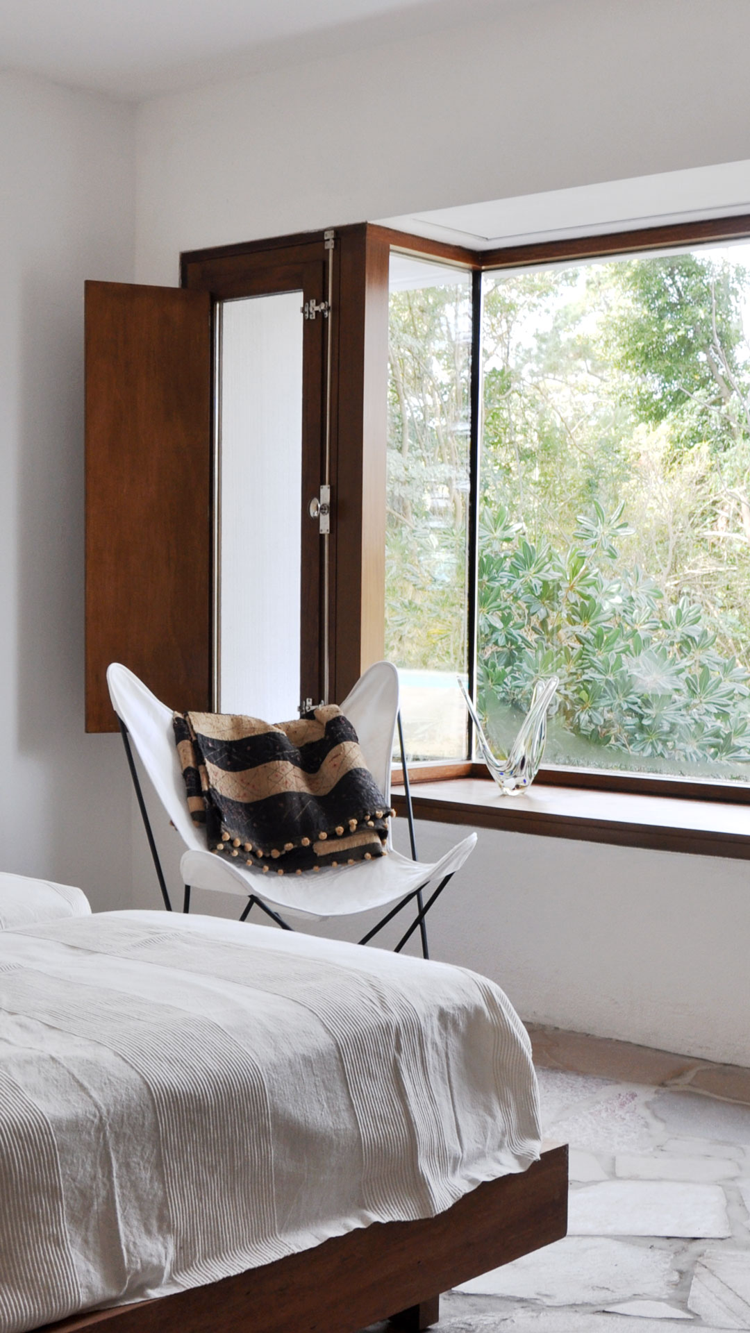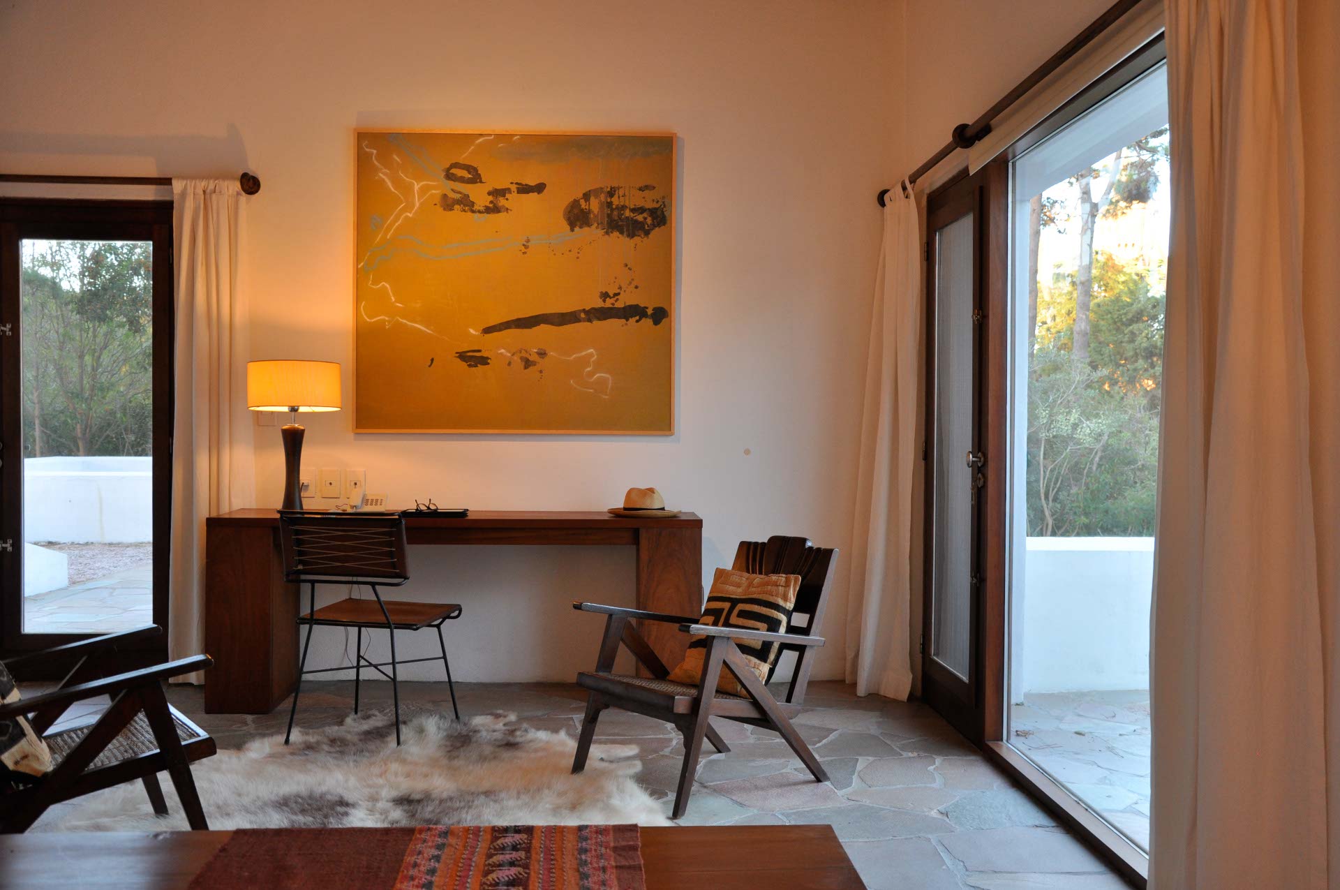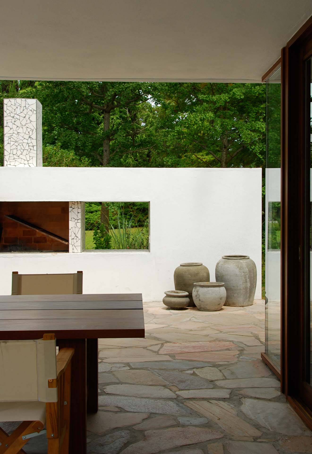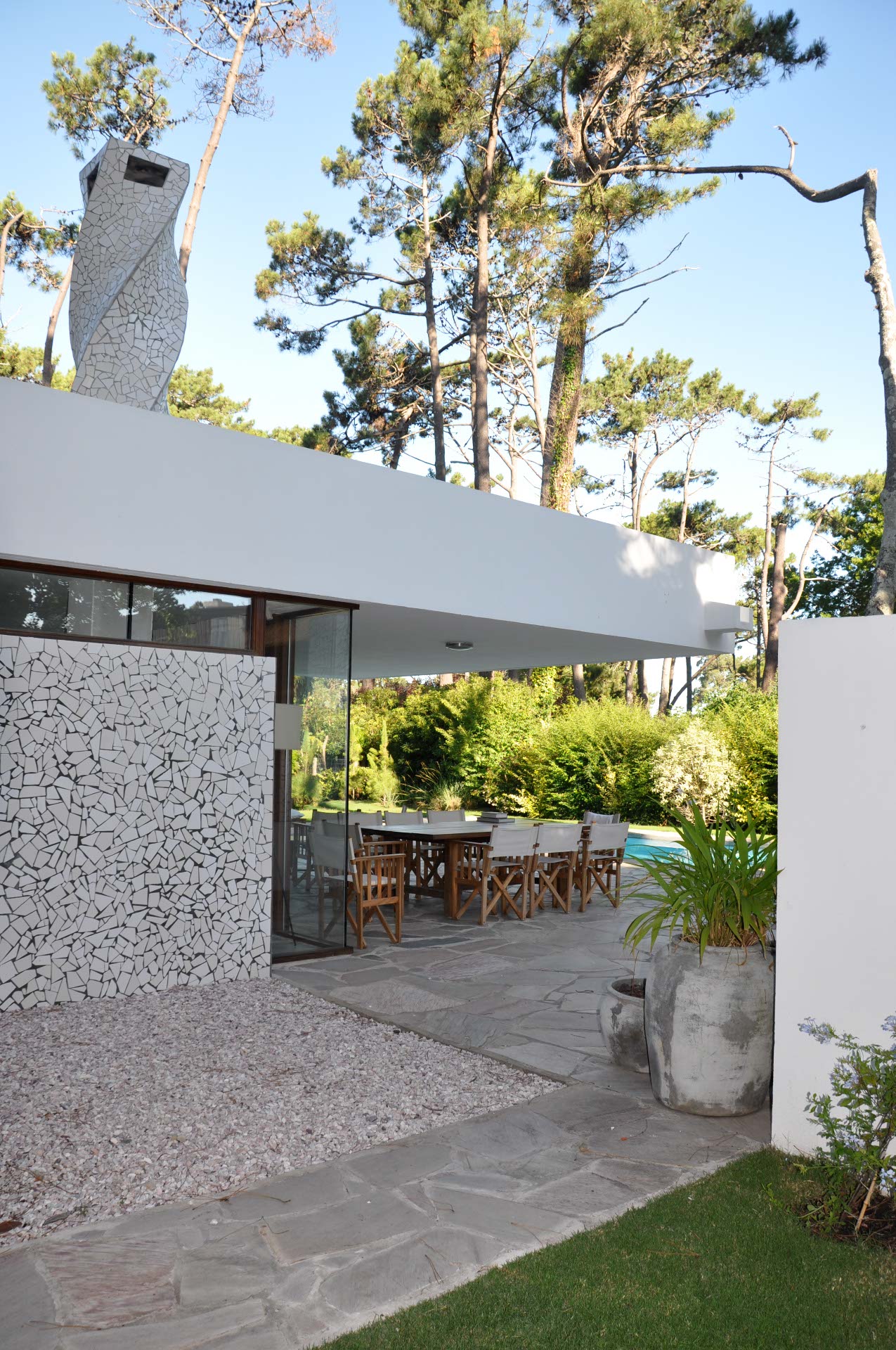 Villa Hilaria is a simple holiday home. All rooms are located on the ground floor except for the master bedroom, which is upstairs. The house has two wings, the first of which contains two bedrooms, a bathroom and a complete suite. The second, perpendicular to the first, houses a single living area (living room, dining room, kitchen) which extends onto a terrace covered by a large canopy. The L-shape has made it possible to preserve two existing pine trees and give the garden a certain intimacy by protecting it from the street. The construction is as simple as the programme. Built in just five months, the house is composed of load-bearing brick walls and concrete slabs coated with lime plaster. The only distinctive feature is the eaves, which are supported by metal reinforcements concealed in the carpentry. The doors and windows are made of wood; the frames and external blinds are made of lapacho, and the rest is cedar. The architectural expression is based on the purity of the volumes, which create a strong contrast between solids and voids, the simplicity of the materials and the omnipresence of the pine trees.