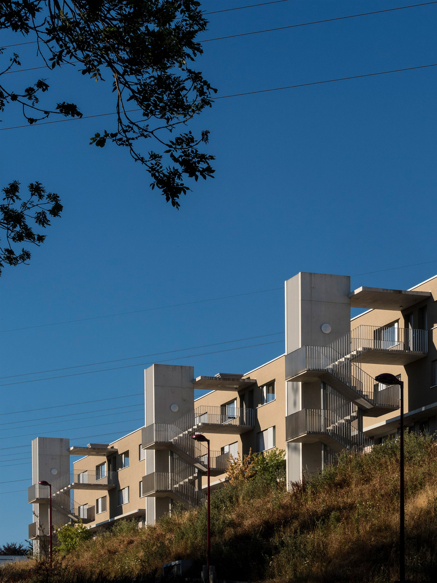 The five buildings in this complex form the northern part of the new Champs-Meunier neighbourhood, in a rural setting but still close to the city. They offer 42 original homes, halfway between flats and terraced houses, all facing a central green space open to the south and the lake. All the dwellings are 4.5 rooms, with an atypical layout combining single-storey duplexes and attic simplexes accessible via external staircases.