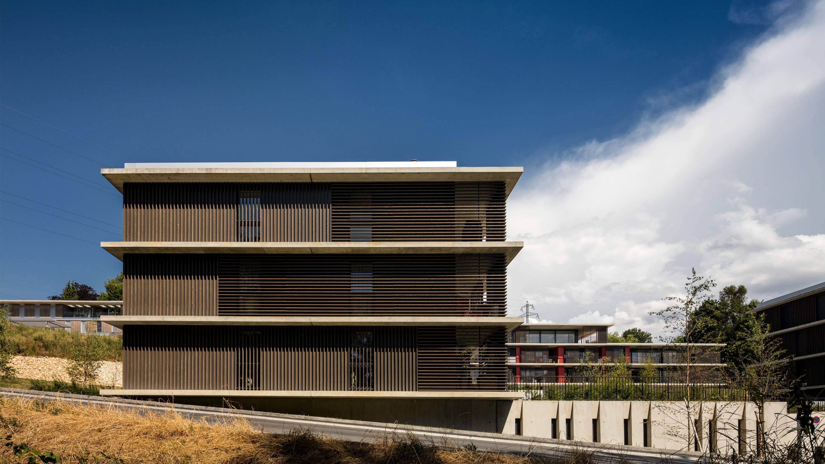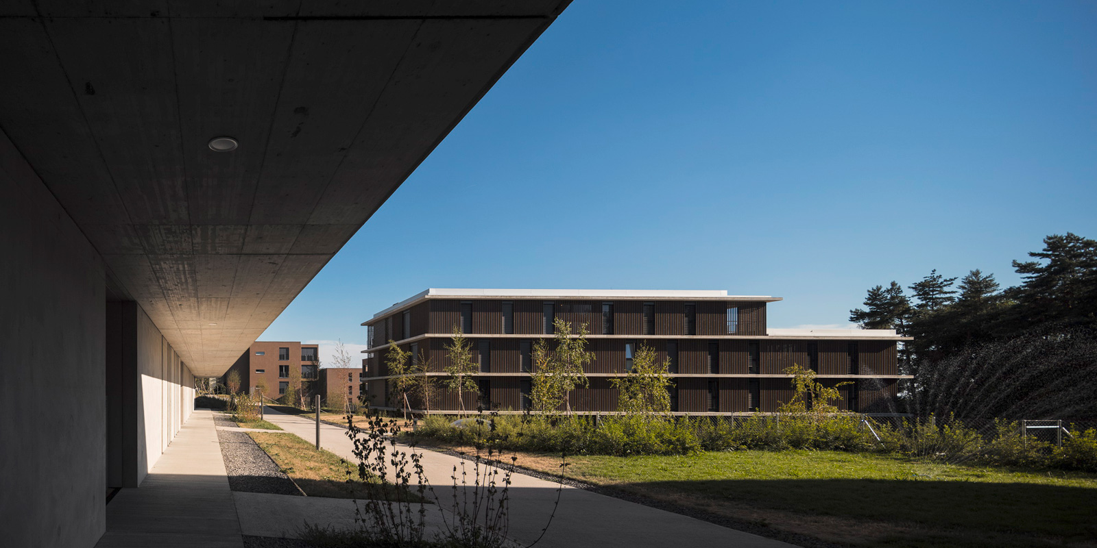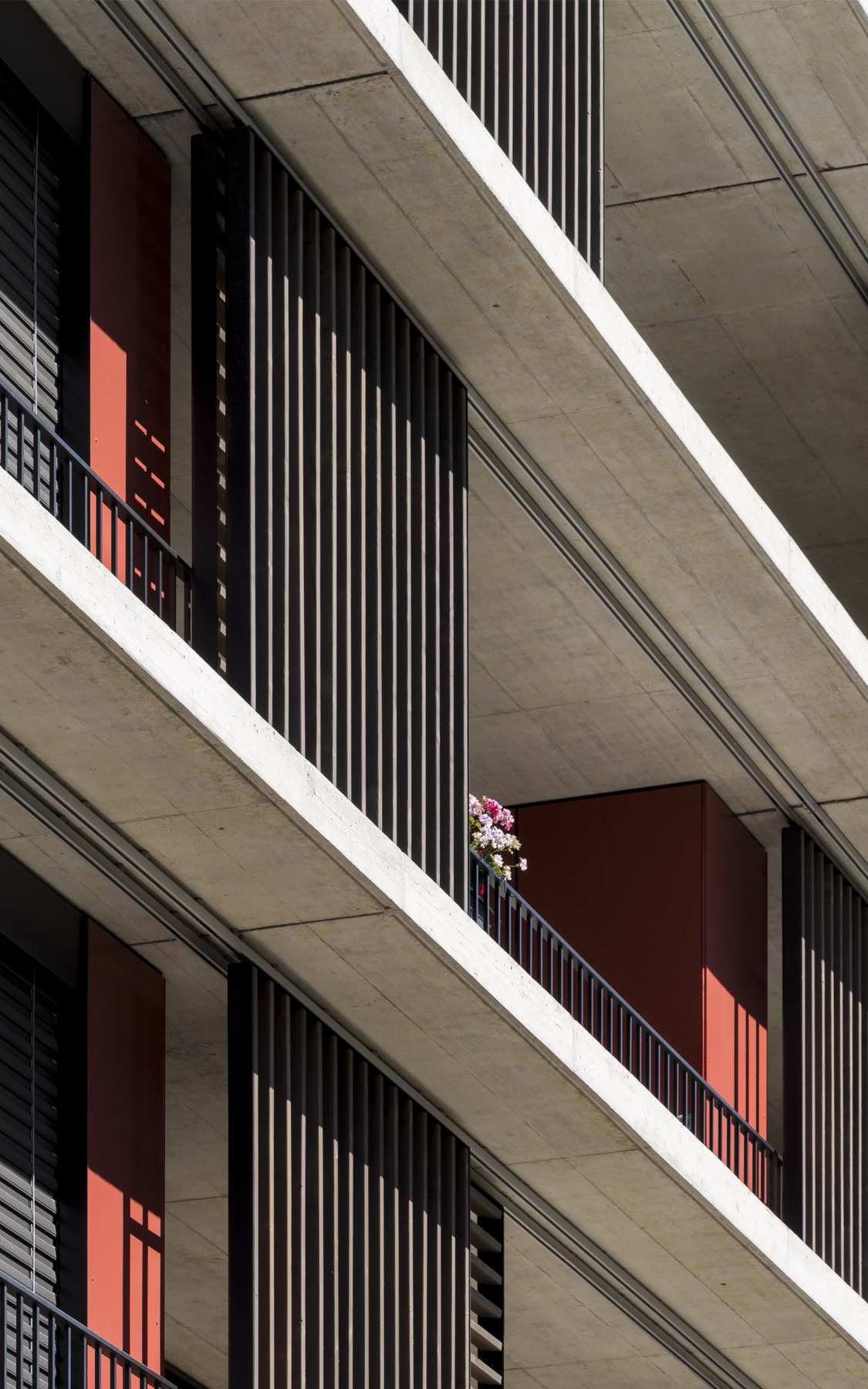 The southern part of the new Champs-Meunier neighbourhood comprises three terraced buildings, located in a rural setting on the outskirts of the city. The 47 apartments, ranging from three to five rooms, all double-aspect, are organised in a simple and efficient layout around a central core. Generous balconies and terraces extend the living areas, reinforcing the connection between indoors and outdoors.