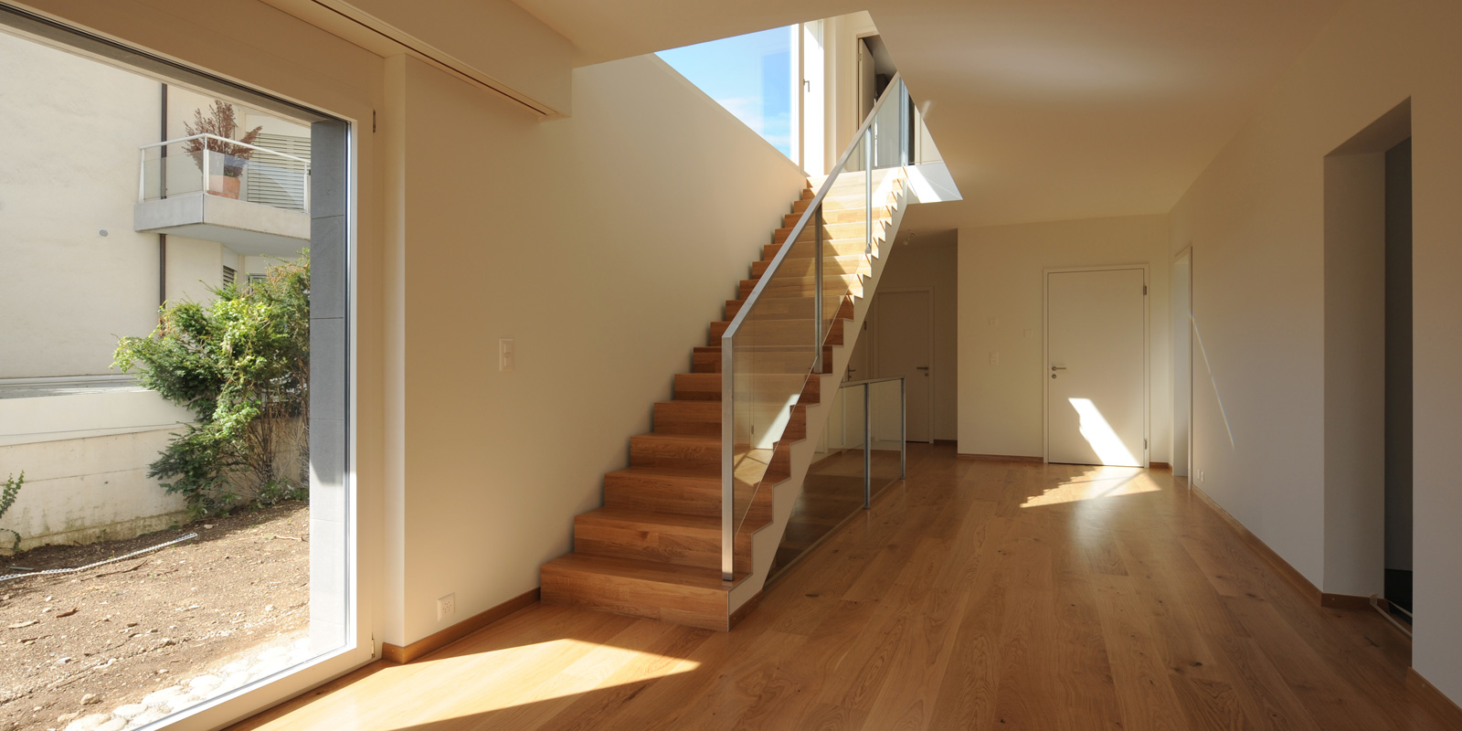 The construction comprises four large, high-quality homes, fully equipped and offering a high degree of privacy. The narrow, elongated plot dictated the design. This takes the form of two small entities aligned one behind the other, developed over four levels, narrow and connected underground by a shared underground garage, with carefully designed surface developments. The unique character of the project is also highlighted by the curved shape of the roofs, covered with titanium zinc sheet metal. Their proportions in relation to the lower part of the buildings are the result of making full use of the resources offered by the regulatory provisions. Four apartments, similar to villas in terms of their design, duplex or triplex, and their dimensions, have been created. Each of them has its own access, without passing through a shared entrance hall. Facing north-south, the buildings have large openings on the sunny side with a view, while on the opposite side, the openings in the façades are minimised. The buildings also feature spacious terraces with wooden decking and glass parapets to enhance the view and allow light to enter. The layout and location of the complex still leaves sufficient space for private outdoor facilities. Constructed from 36.5-metre-thick monolithic terracotta masonry, the buildings are supplied with thermal energy by a heat pump, with the entire system guaranteeing attractive and adequate performance in line with the high standards required for the project.