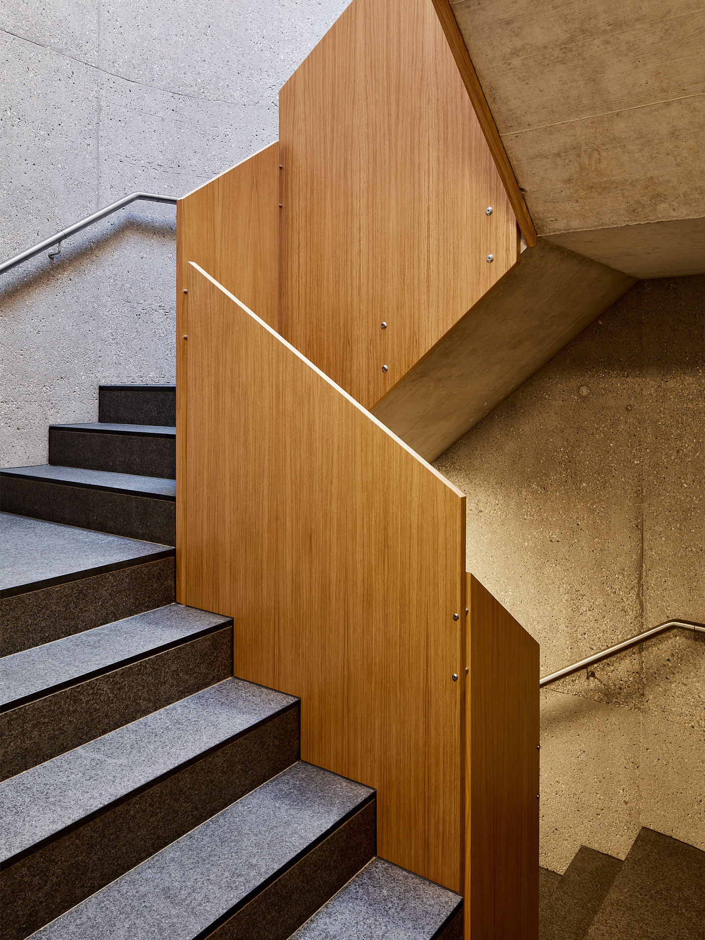 Materiality: The project sought to highlight the materiality of the construction. The building is insulated from the outside and plastered where there are habitable (heated) surfaces, leaving the raw concrete exposed where possible, which helps to define the character of the buildings. To enrich this mineral palette, metal elements have been integrated to express the emptiness of the mass, to treat the building access surfaces, and to distinguish the attics from the roof. The same logic applies to the design of the interior common areas: exposing the concrete, sandblasted where possible, and using wood (oak) for the joinery, landing doors and guardrails.