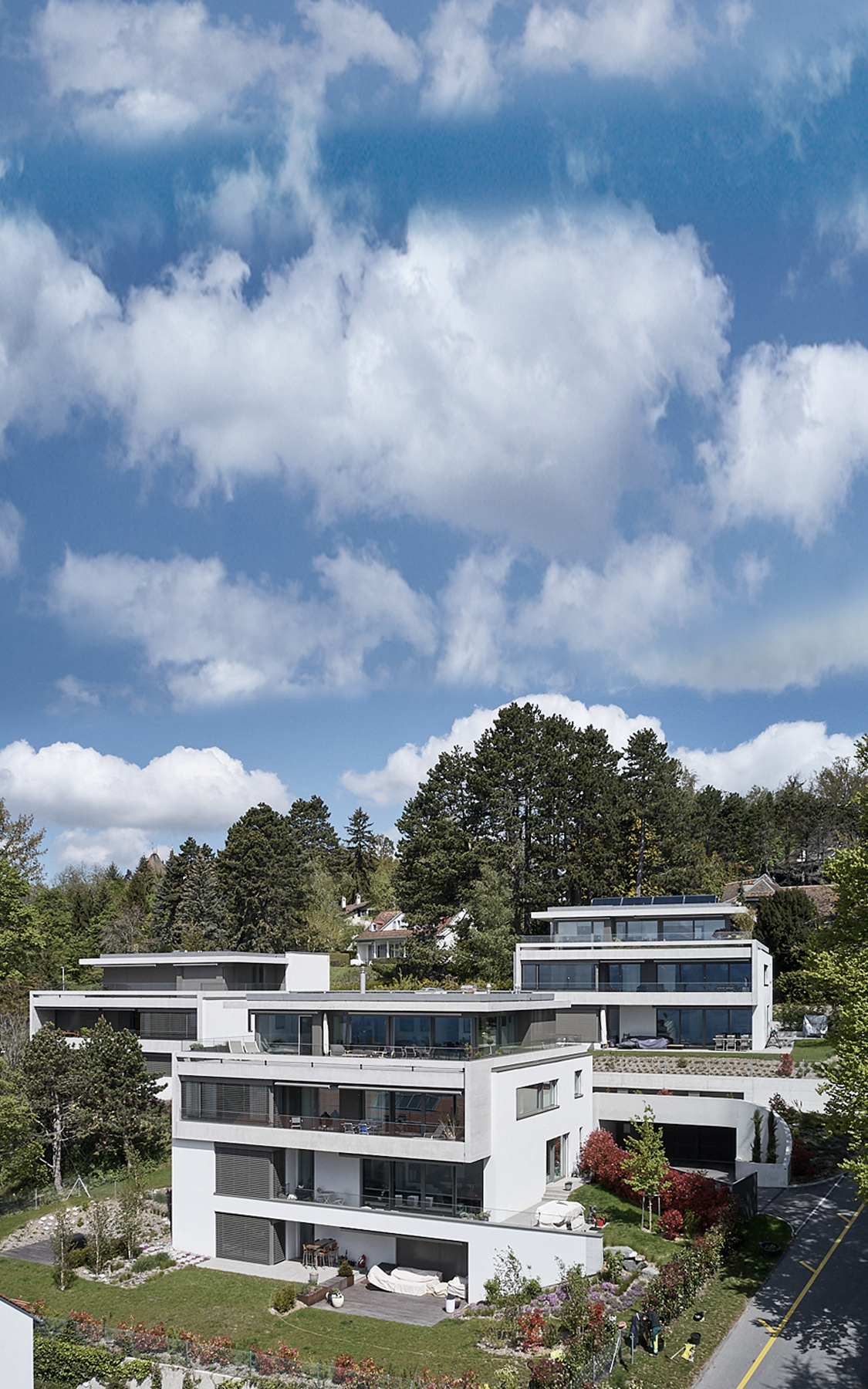 Location and context: The main challenges of this project were to harmoniously integrate three buildings into a setting of villas on sloping land, while preserving a large oak tree. With a view to unity and simplicity, a repetitive design approach was adopted. Placing the three volumes in a staggered arrangement and positioning them naturally on the land allowed each building to be given a specific location, making the most of the view and its relationship with the immediate surroundings. This is the case for the building at the top of the plot, which enjoys a privileged relationship with the hundred-year-old oak tree. Each floor opens onto three sides. The south front offers a splendid view of the landscape, and the staggered layout avoids overlooking between the side façades. The context, similar to that of a residential area despite the presence of a few buildings, led to the strategy of giving each building the appearance of a large villa rather than a block of flats. To this end, each floor has its own distinct character: the ground floor with its terraces, the first floor with its loggia, and the attic, which resembles a villa on the roof.