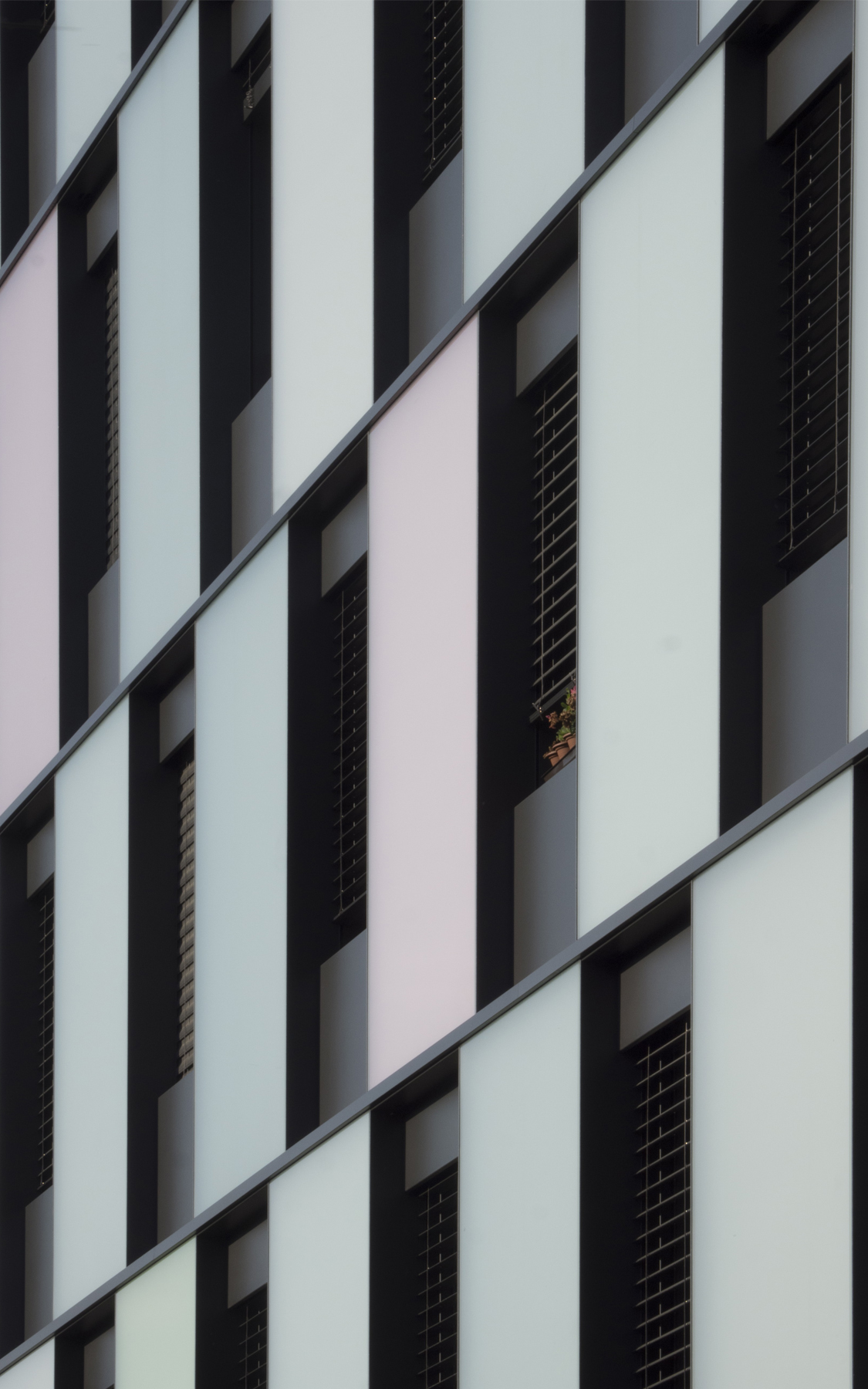 S’installant dans le contexte minéral existant du quartier des Triaudes, où le béton brut est presque omniprésent, le nouveau bâtiment contraste en proposant des façades colorées en verre. Le système constructif en bacs apporte une profondeur aux façades. La couleur est appliquée sur le fond, et non sur le verre, lequel est disposé en premier plan. Le jeu sur les teintes (une palette de 6 couleurs) et la texture du verre sérigraphié « effet sablé », apporte un caractère vivant à la façade, qui traduit la multi-culturalité et la vie étudiante que les logements abritent. La façade, selon l’angle sous lequel on la regarde, se mâtine de couleurs pastel, reflète le contexte proche, ou diffuse des teintes subtiles par l’absorption de la lumière au travers du verre sablé. Tous les éléments de serrurerie sont traités en métal avec une finition en peinture IGP gris anthracite. La volumétrie du bâtiment et le travail des couleurs étant prédominants, les éléments secondaires ont été traités de manière à ne pas surcharger visuellement le bâtiment. Pour les mêmes raisons, les quelques parties en crépi sont également en teinte gris moyen. La thématique de la couleur se retrouve dans les couloirs intérieurs desservant les studios. Les embrasures des niches d’entrée des logements sont peintes, reprenant la teinte de la façade et individualisant ainsi chaque appartement. Ce jeu de couleurs amène une dynamique et un caractère vivant à ces espaces de distribution fonctionnelle.