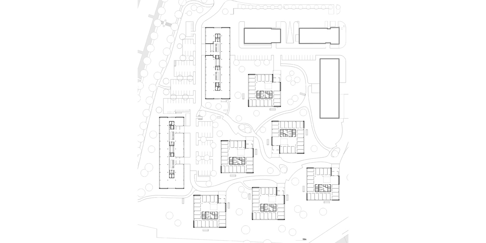 Two of the buildings designed for this quarter were intended to house laboratories. They establish border at the western edge of the ensemble, and are distinguished from the rest by their facades, which combine bare concrete with details in anodised natural aluminium in the openings and the technical attics.