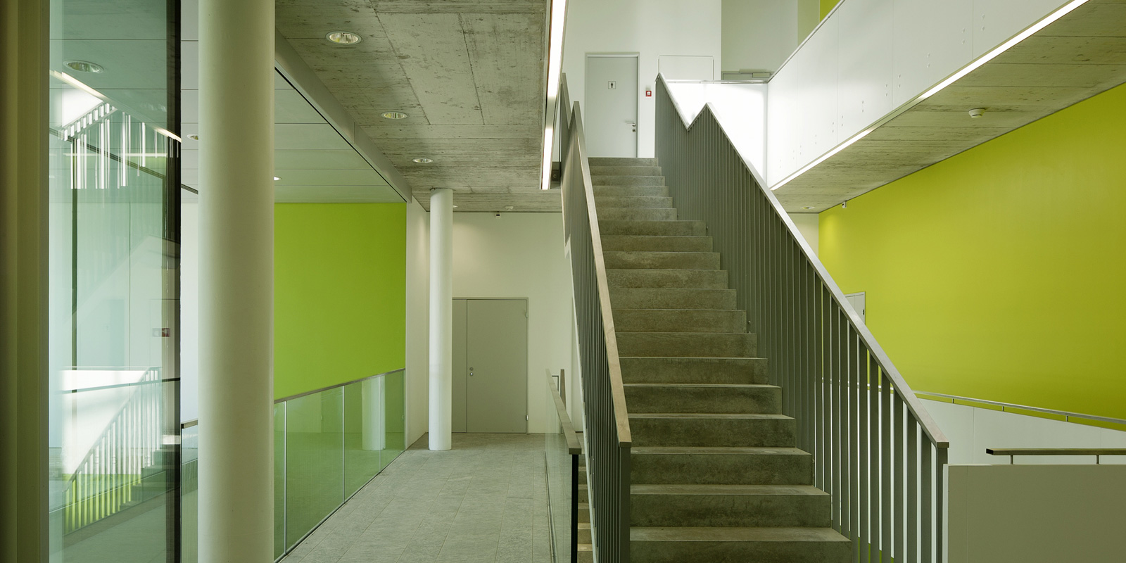 The buildings evoke an atmosphere appropriate to technological research in a convivial atmosphere and at a human scale. The utilisation of white enamelled glass, smooth or with a graphic motif on the inner face of the opaque surfaces, contributes to this. This white background heightens the green tinge typical of ordinary glass, which together with the natural landscaping elements foster a uniquely chromatic effect.