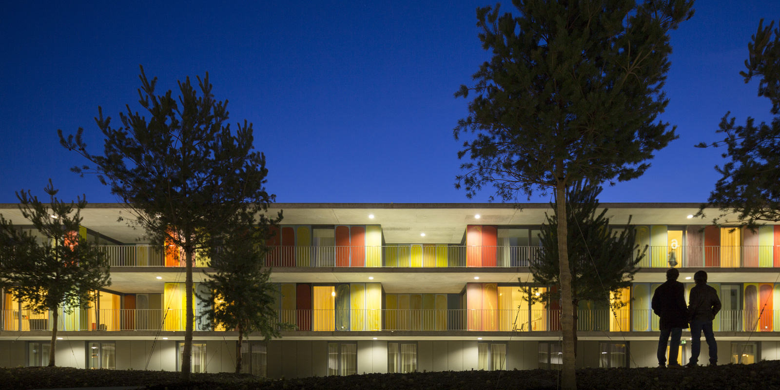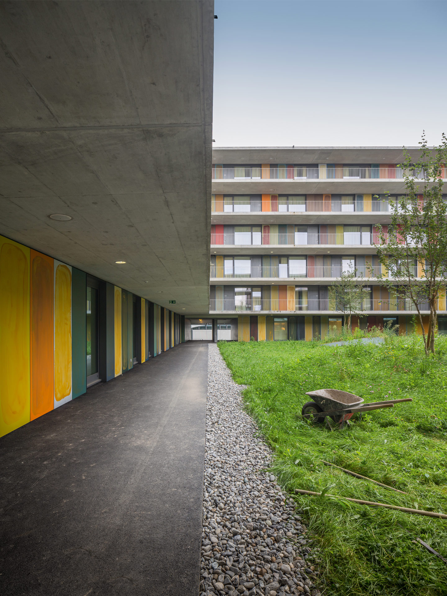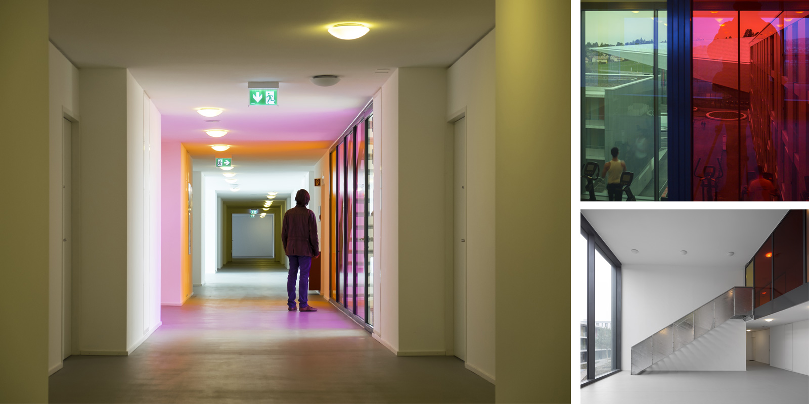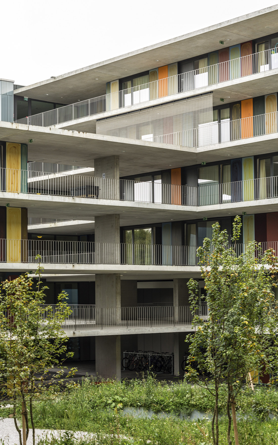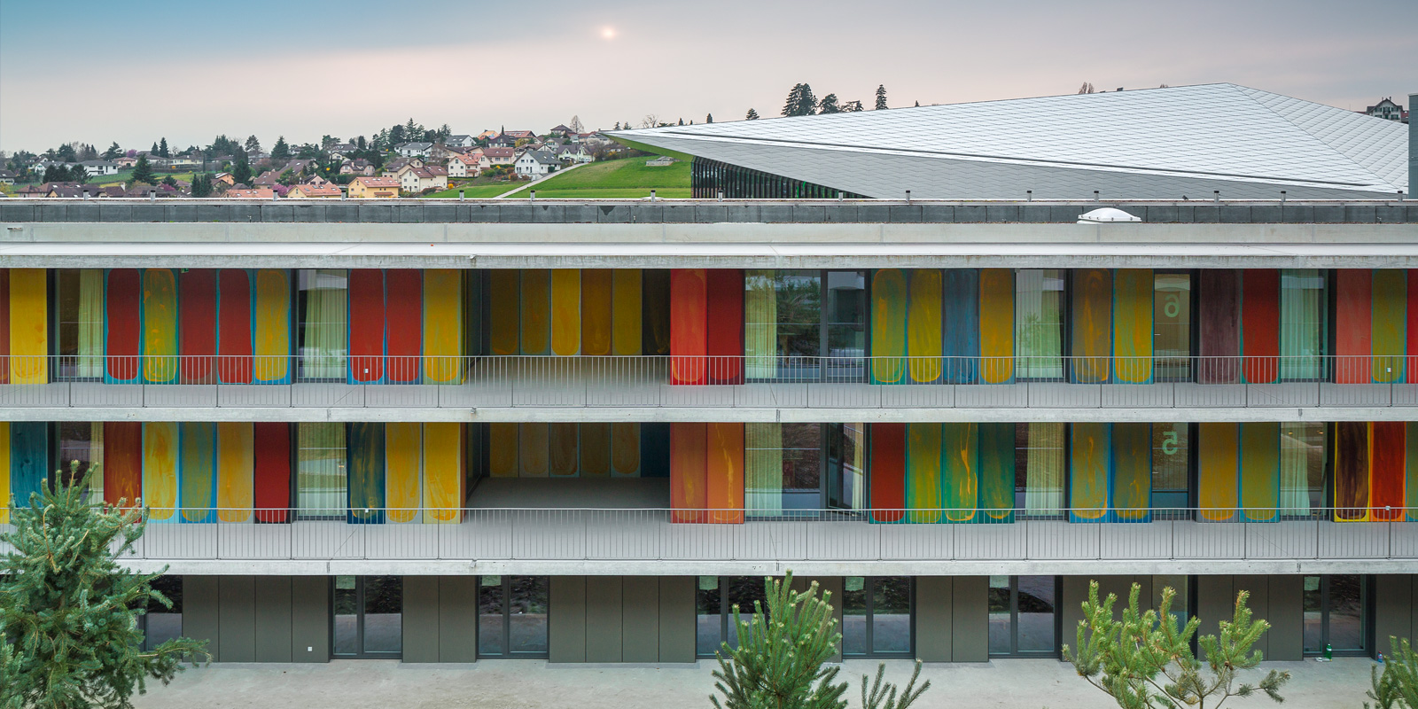 The building's exterior façades, with their screen-printed glass cladding and anodised aluminium shutters, maintain a clear dialogue with the SwissTech Convention Centre, while the colourful window frames anticipate the festive atmosphere of the inner courtyards.