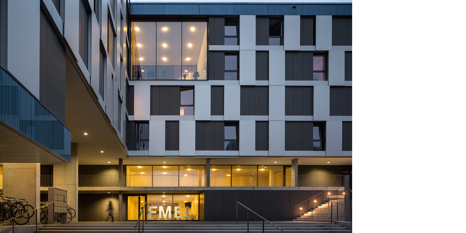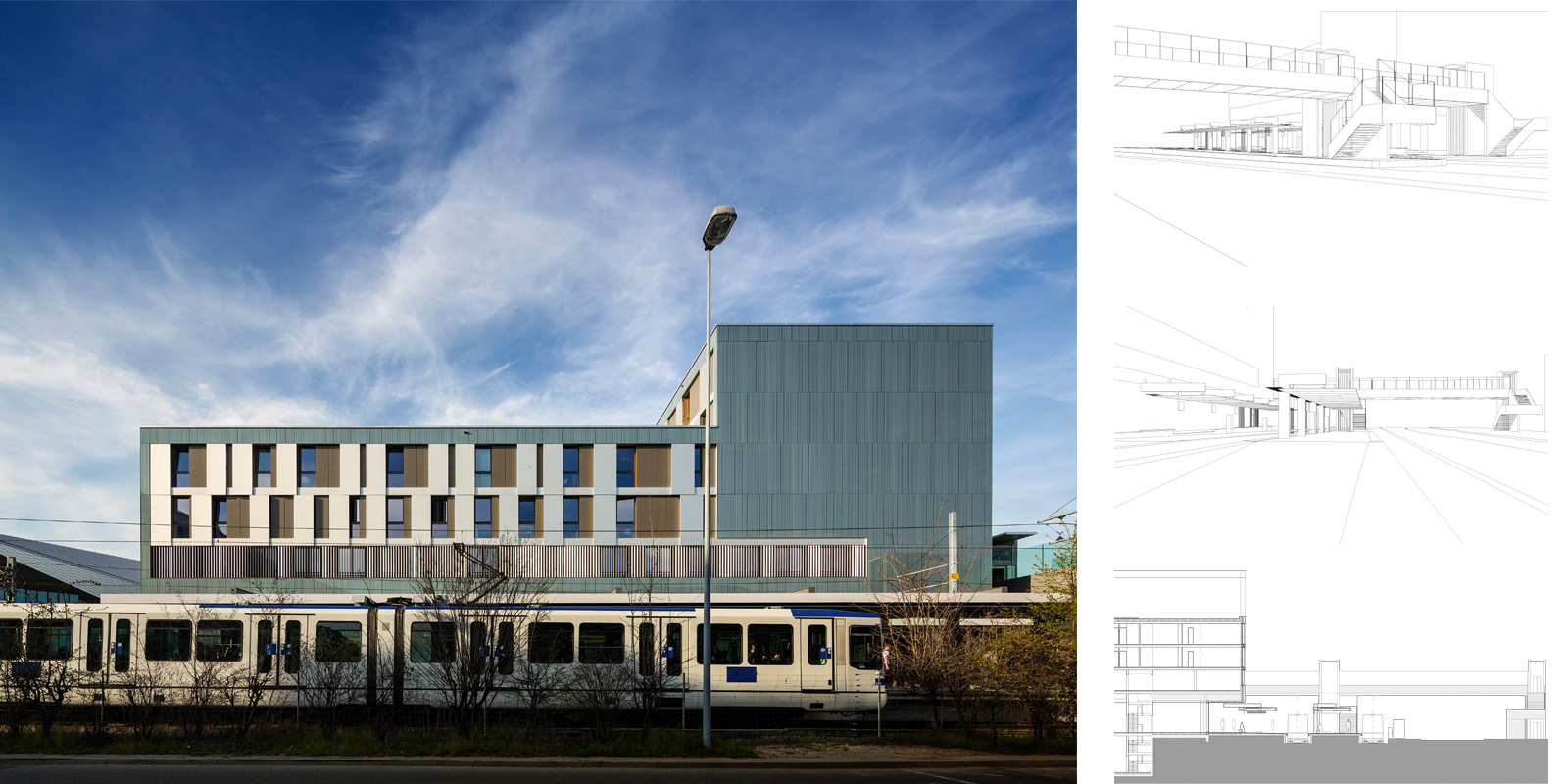 Located on the edge of the campus of the Swiss Federal Institute of Technology in Lausanne (EPFL), in the municipality of Ecublens, the Quartier Nord is home to infrastructure that is essential to the university's reputation. Directly linked to the M1 metro station connecting Lausanne to Renens, the complex includes a convention centre that can accommodate up to 3,000 people: the SwissTech Convention Centre, a student accommodation building with a capacity of 516 beds, a hotel, administrative and service areas, restaurants and shops, as well as a 275-space car park. The complex is organised around a large square towards which the public spaces of the convention centre and shops converge, reinforcing the public character of the neighbourhood.