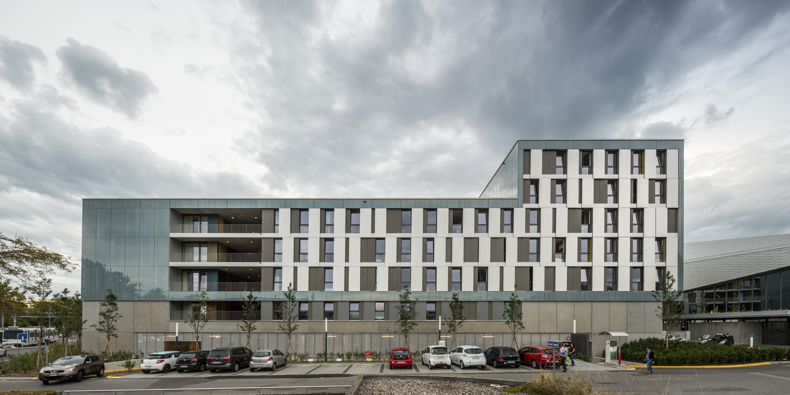 The student accommodation building stands to the east of the large square and extends southwards to the metro station. The shops and restaurants are housed in a covered gallery, above which are the hotel and student accommodation. The building, whose scale is softened by a series of articulations and variations in the height of the different volumes, is arranged around two courtyards.