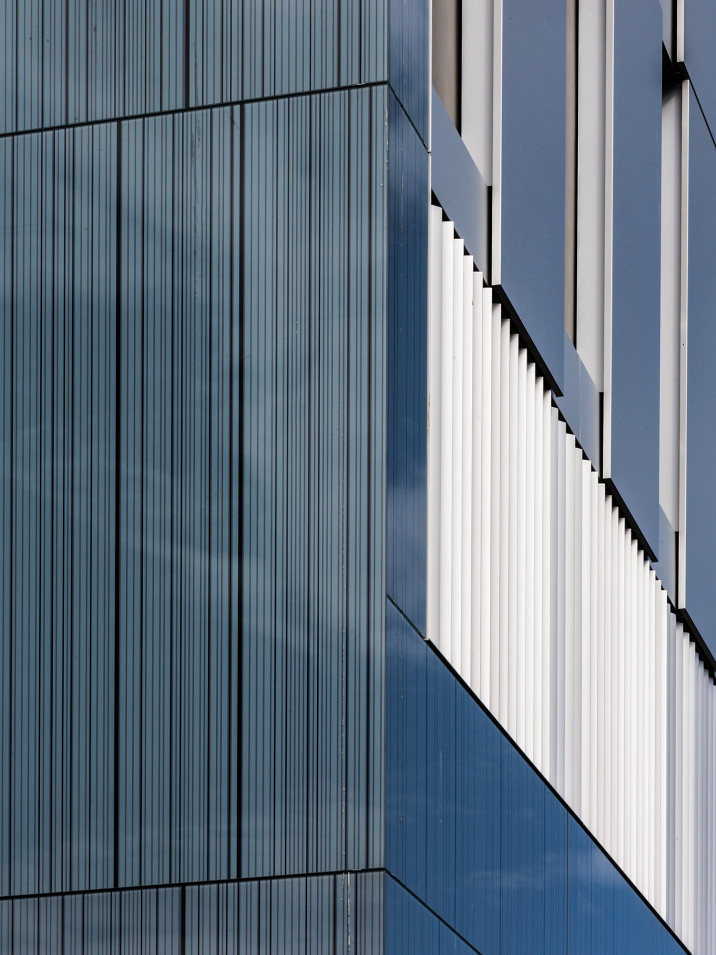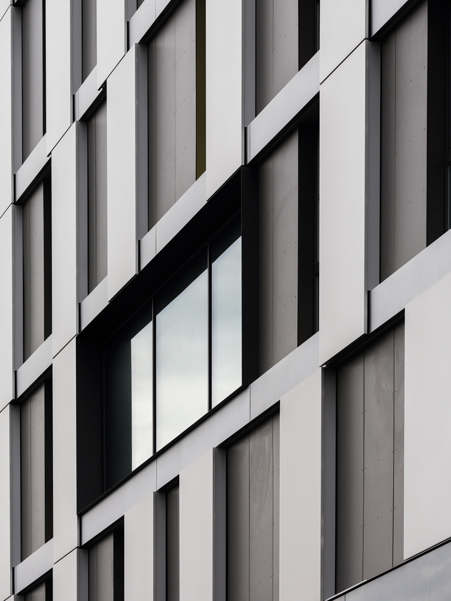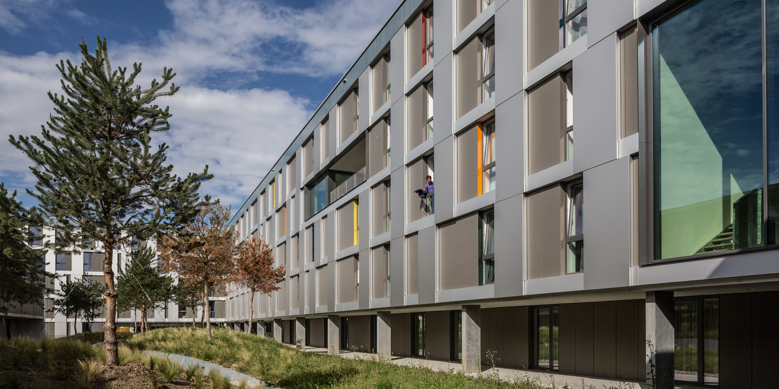 The interior façades of the walkways are clad with 800 fibre cement panels hand-painted by artist Catherine Bolle. This artistic intervention, entitled Le Chromoscope, aims to create an atmosphere that is both intimate and lively in the walkways, designed as living and social spaces for students.