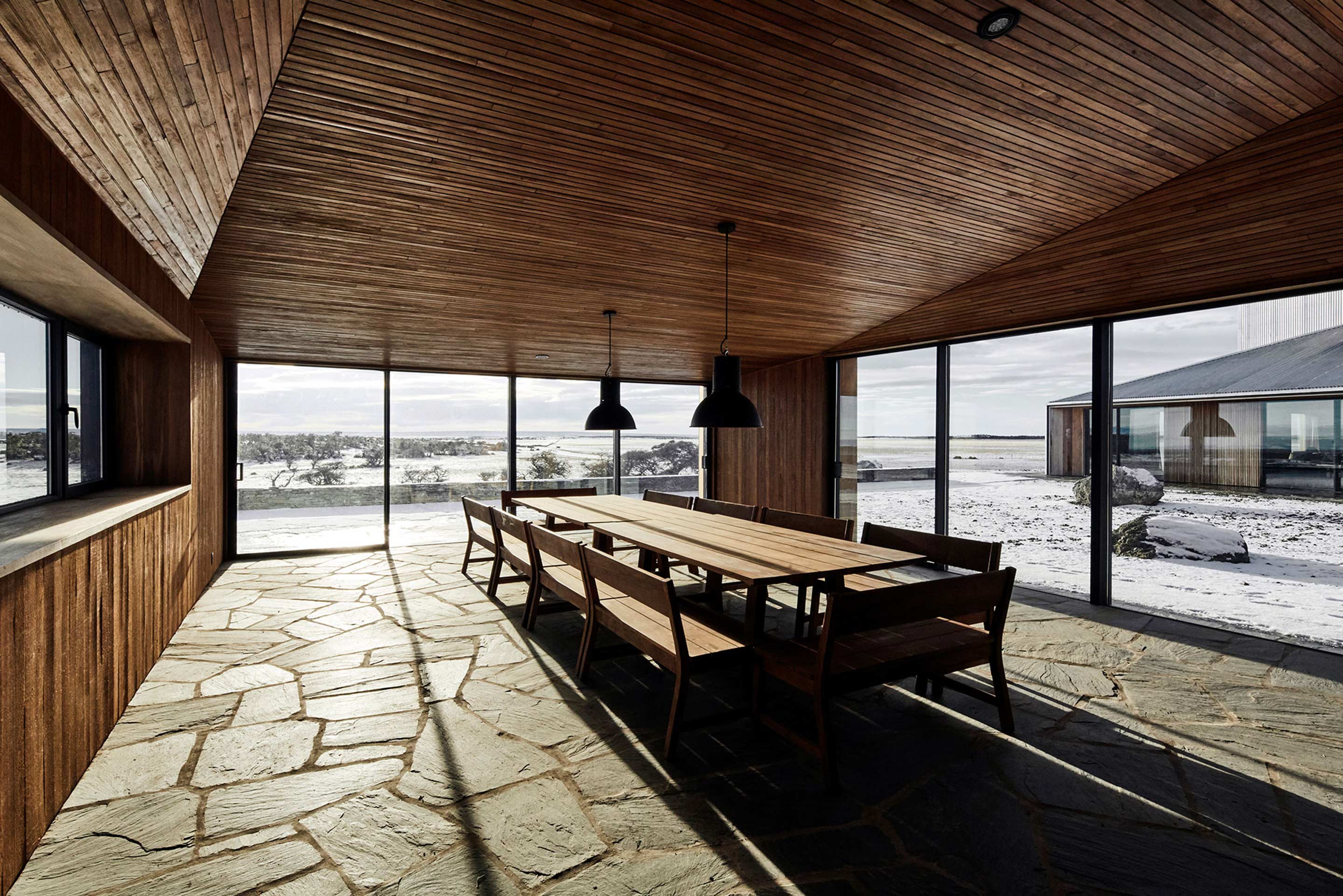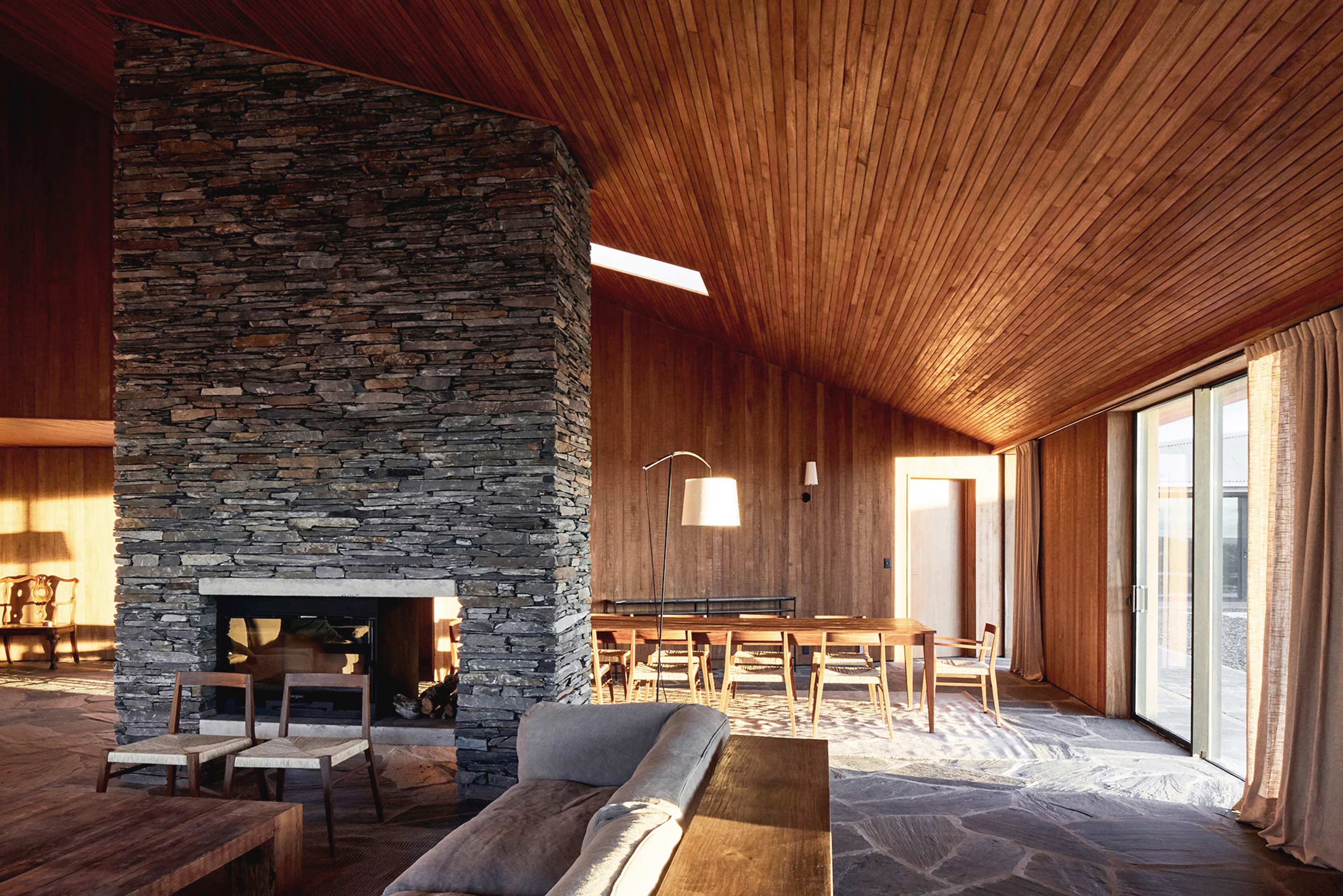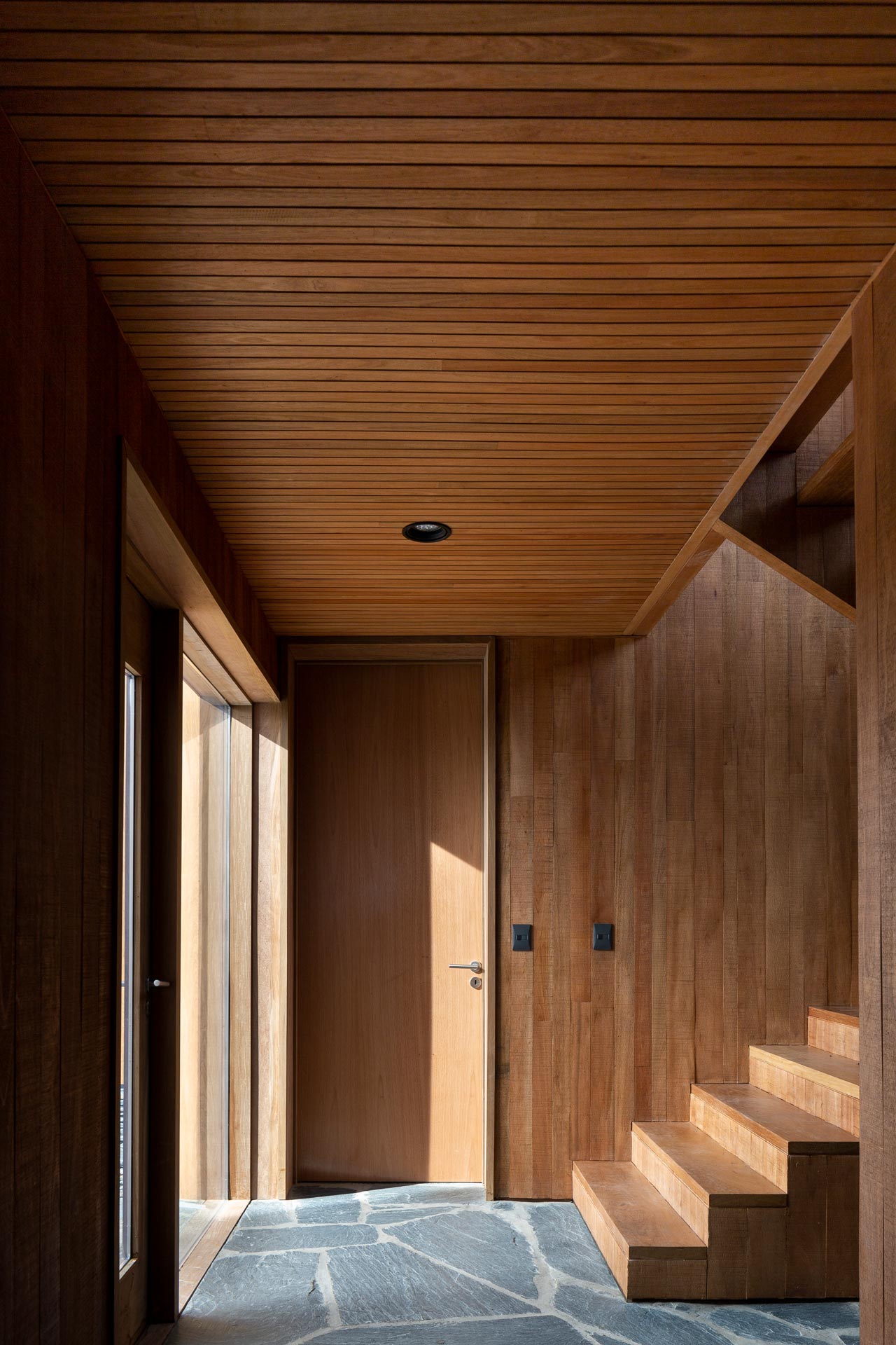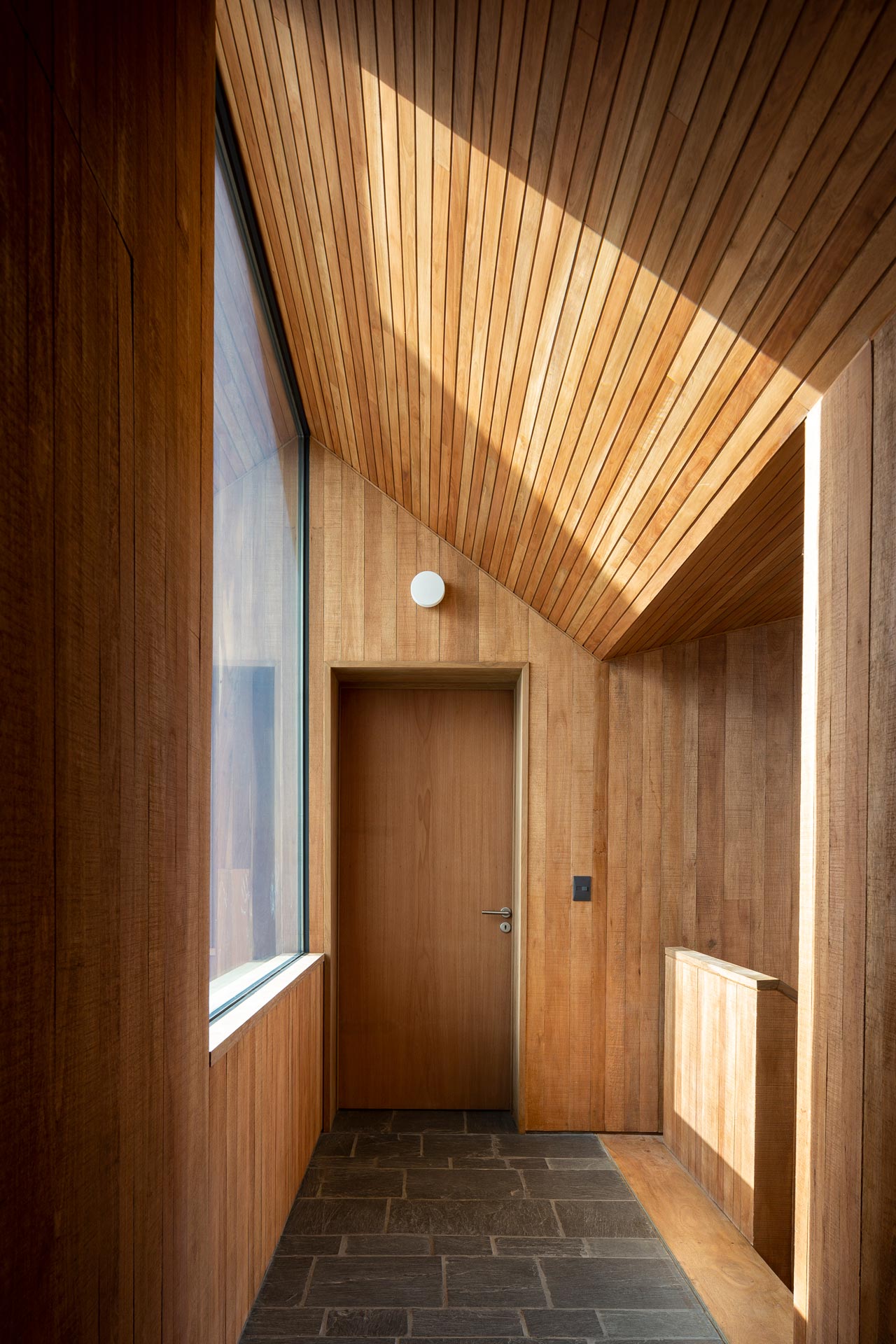 The glass openings are concentrated in the most protected parts of the house, with their wooden frames and cladding linking the interior and exterior.