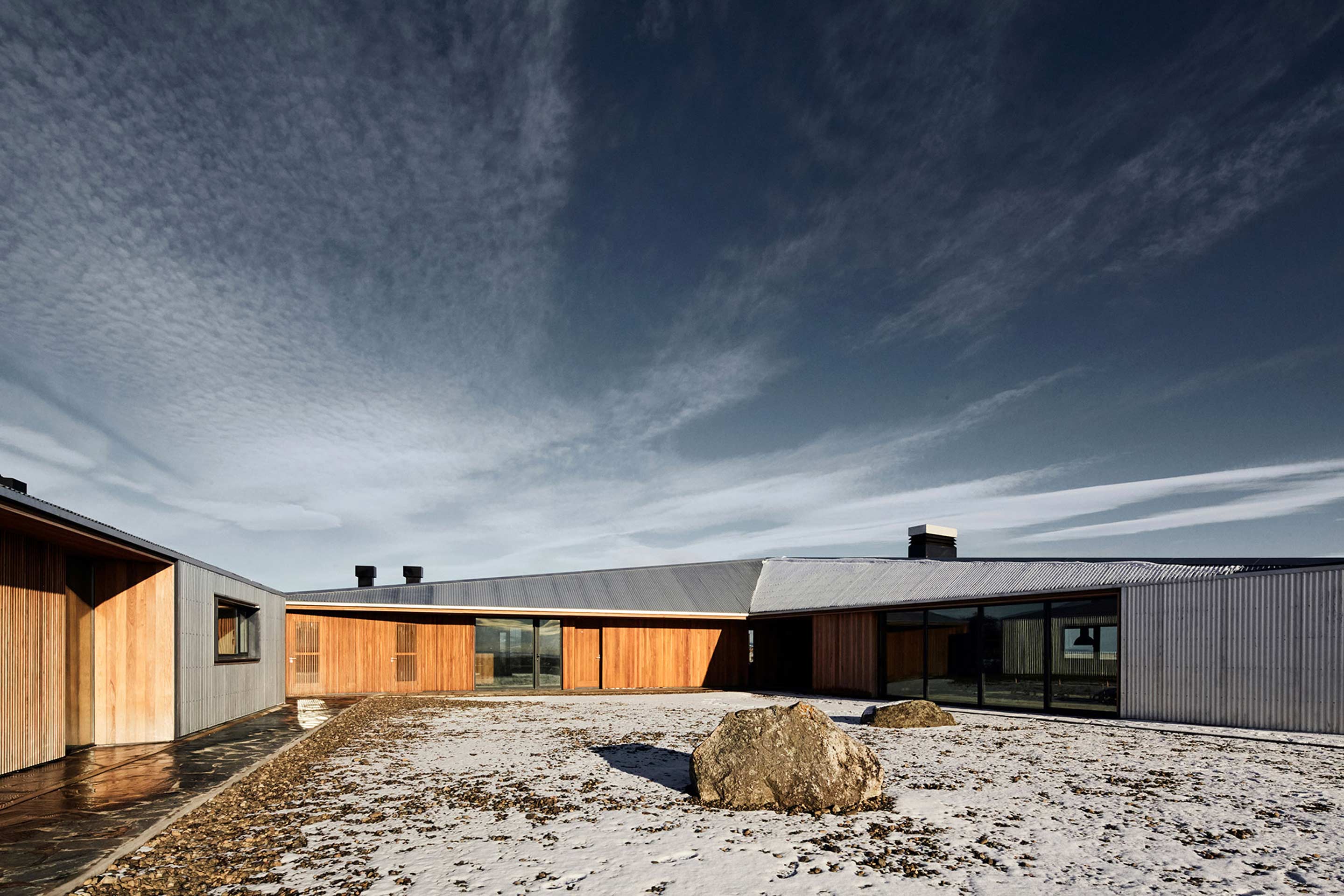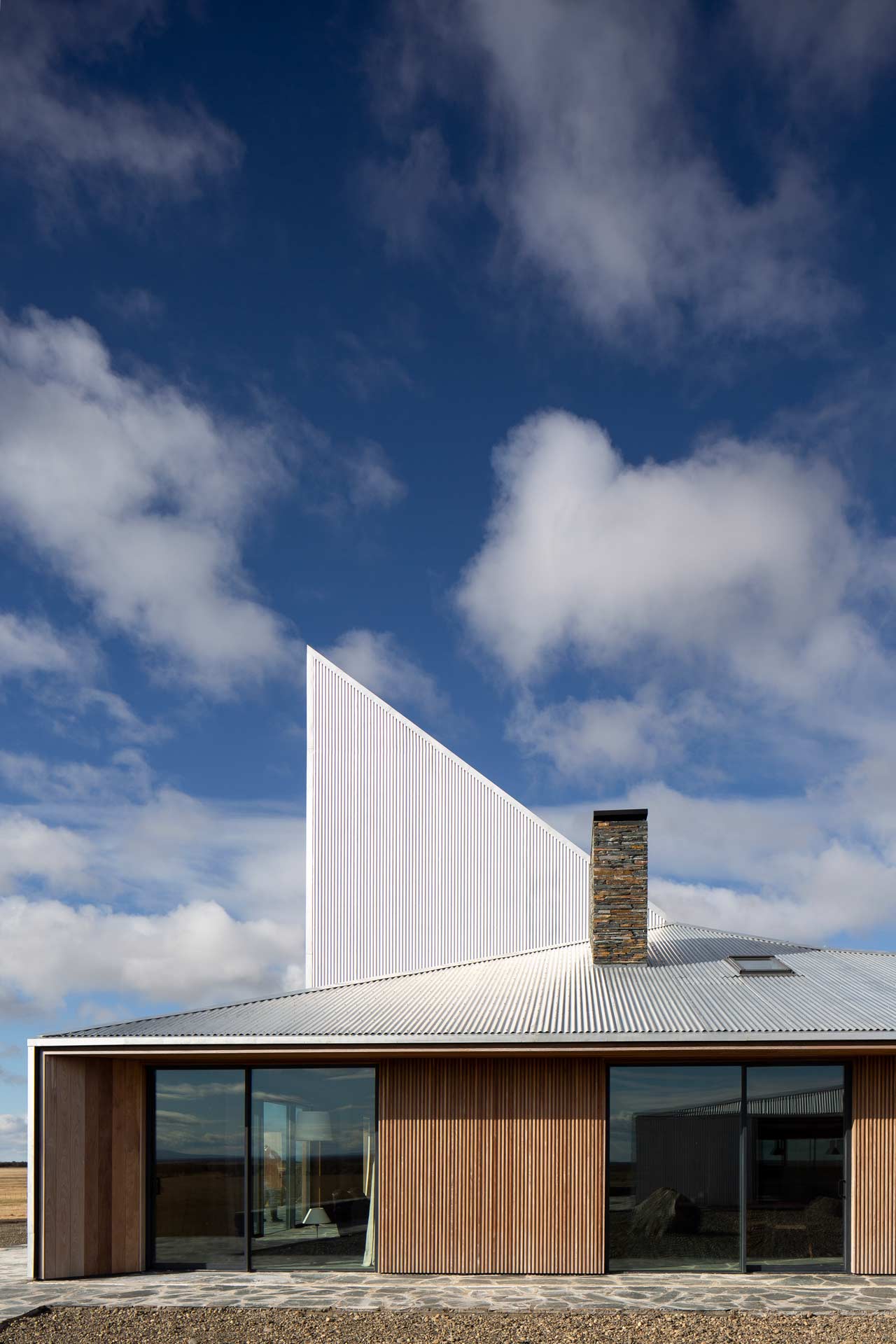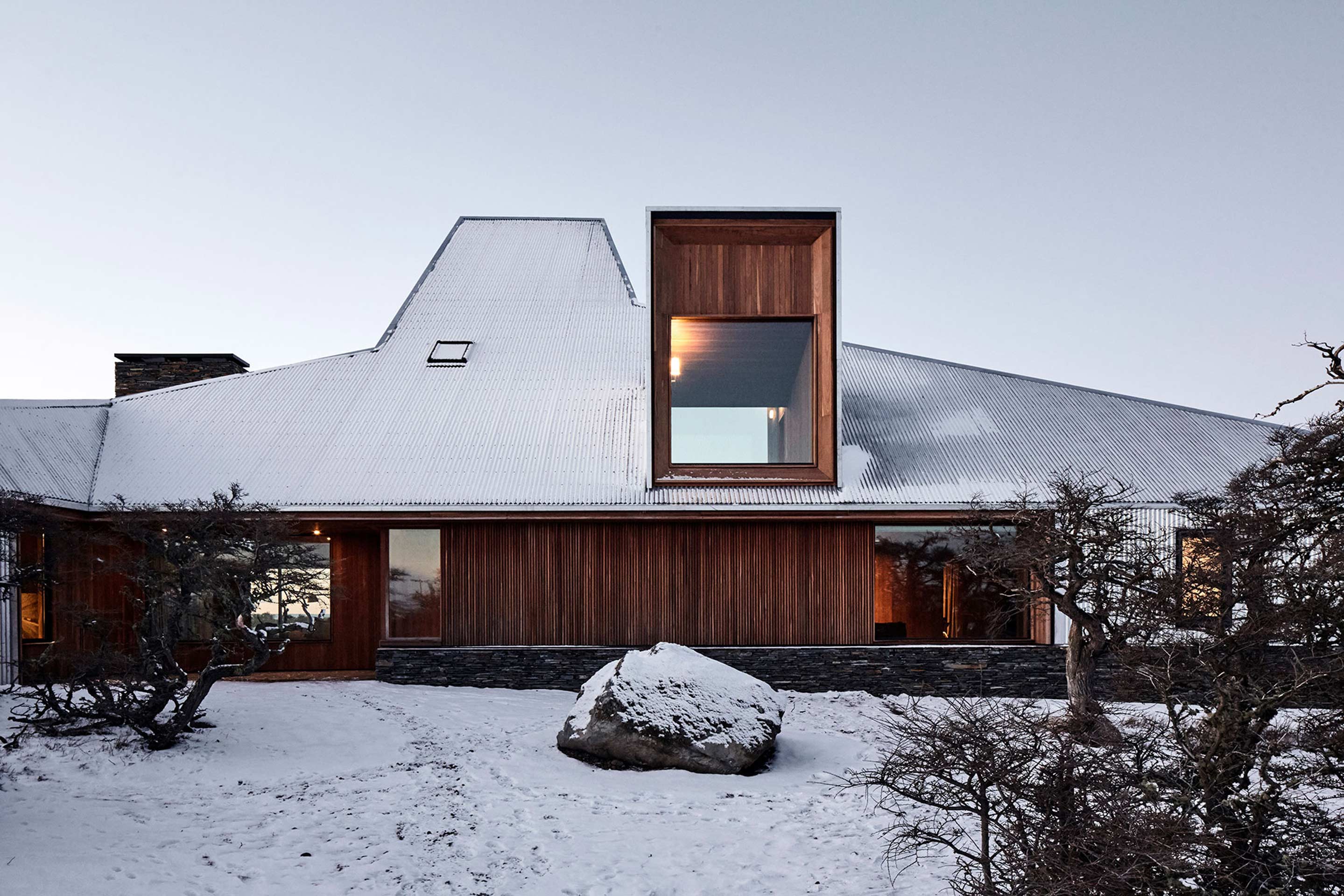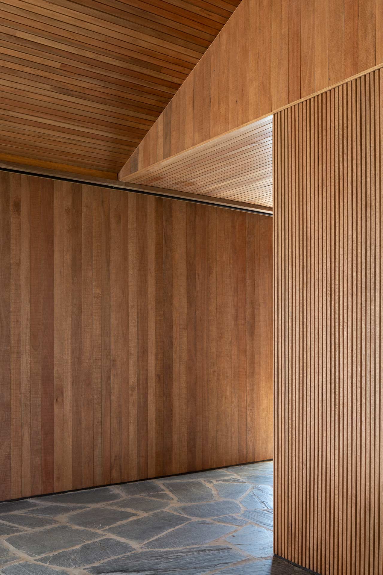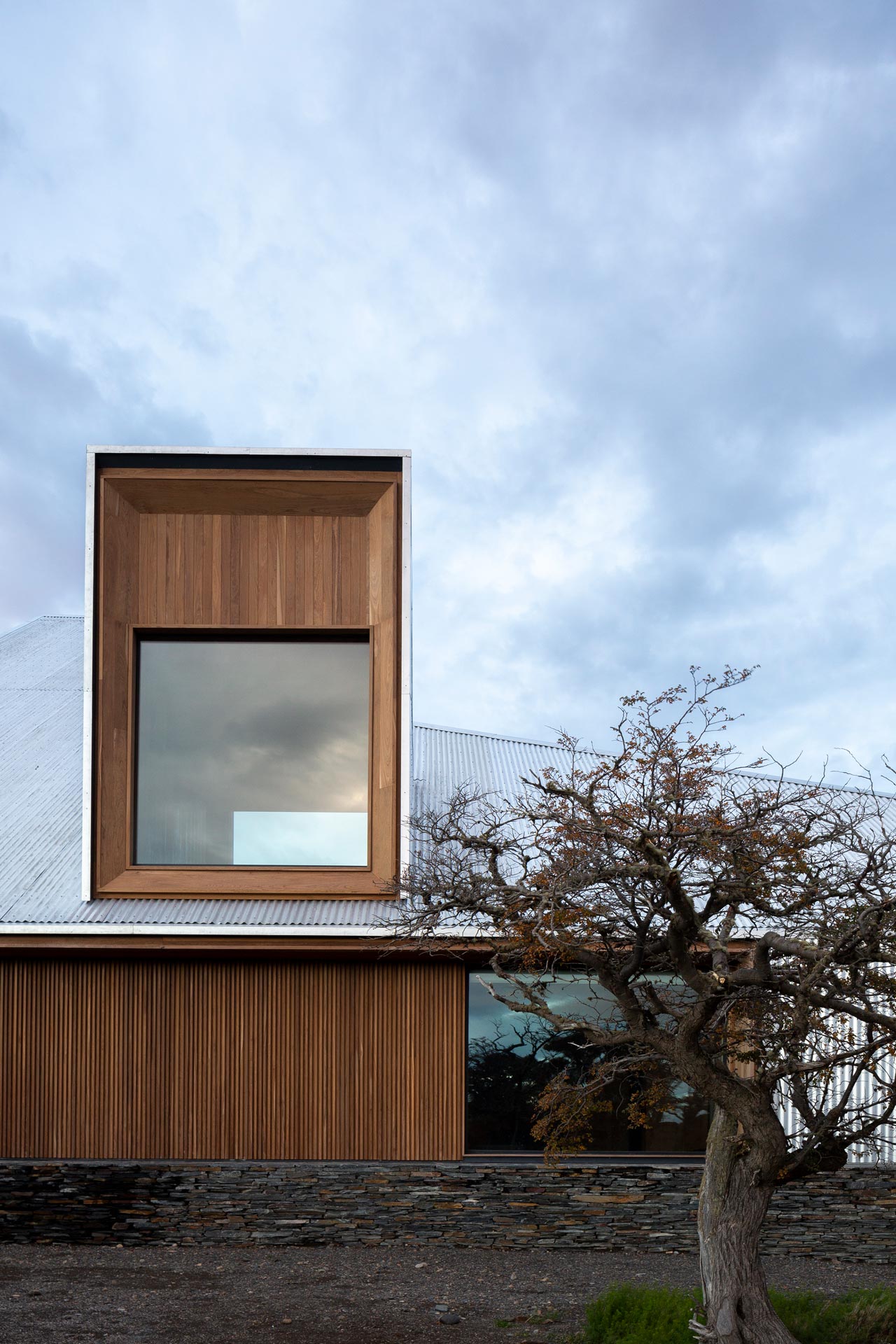 The glass openings are concentrated in the most protected parts of the house, with their wooden frames and cladding linking the interior and exterior.