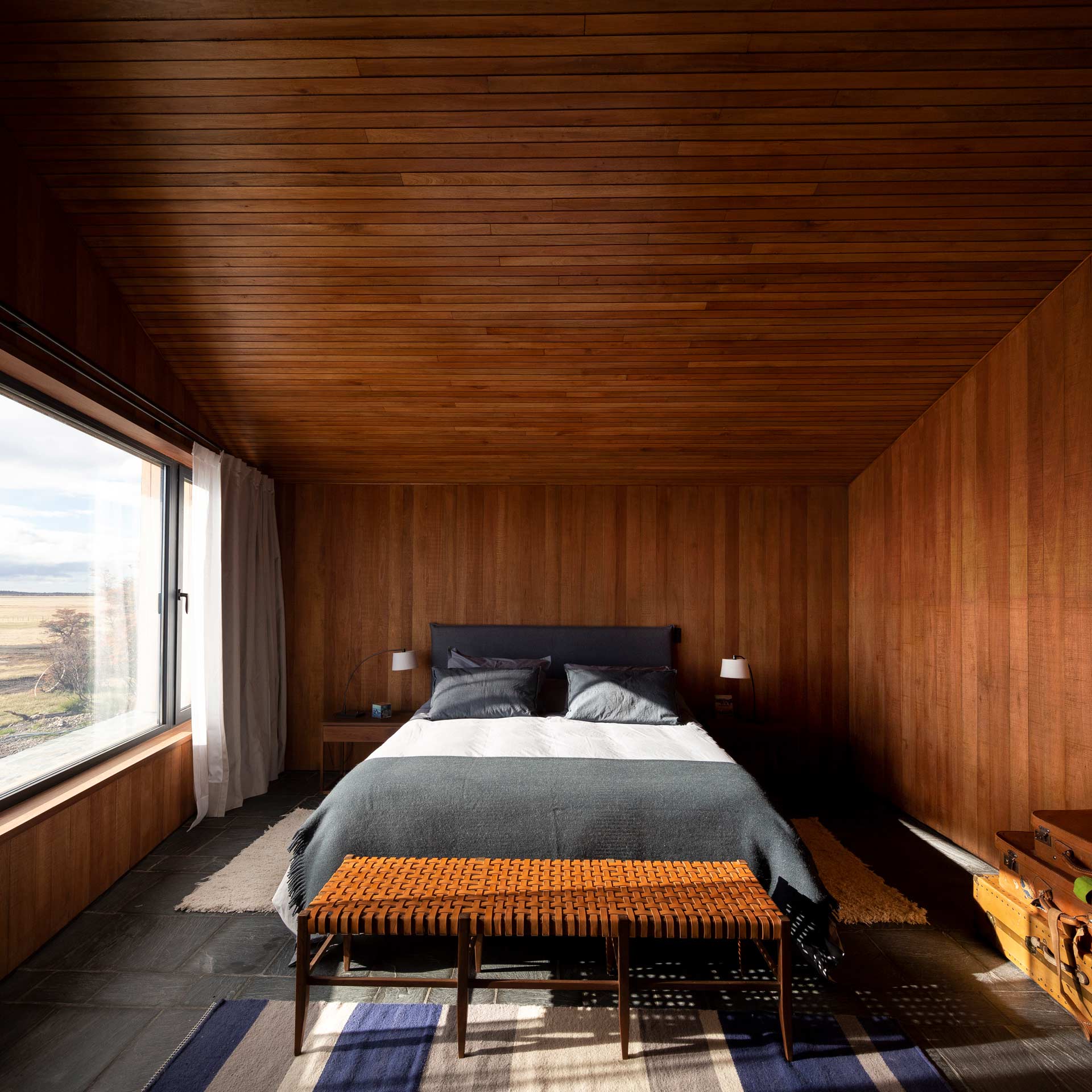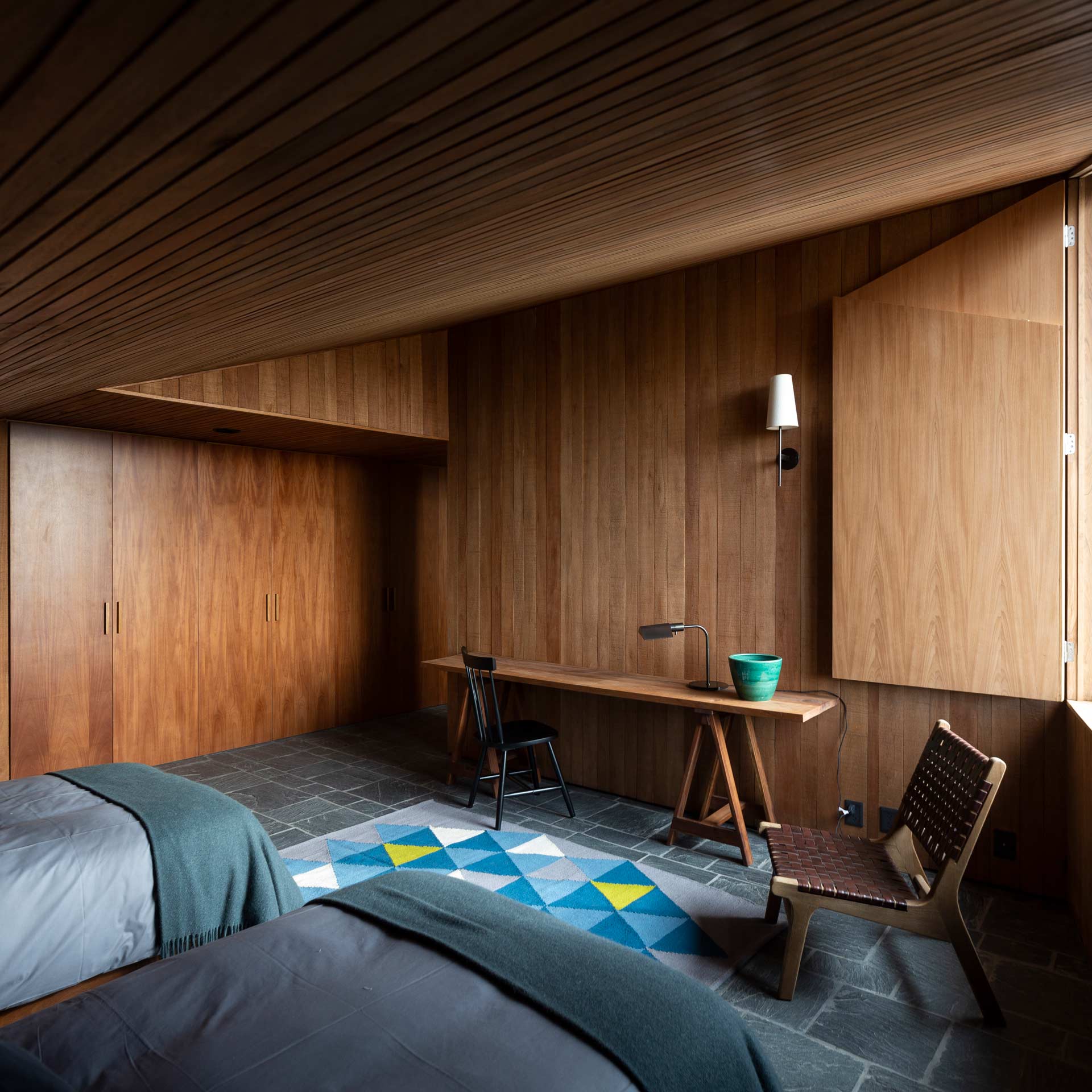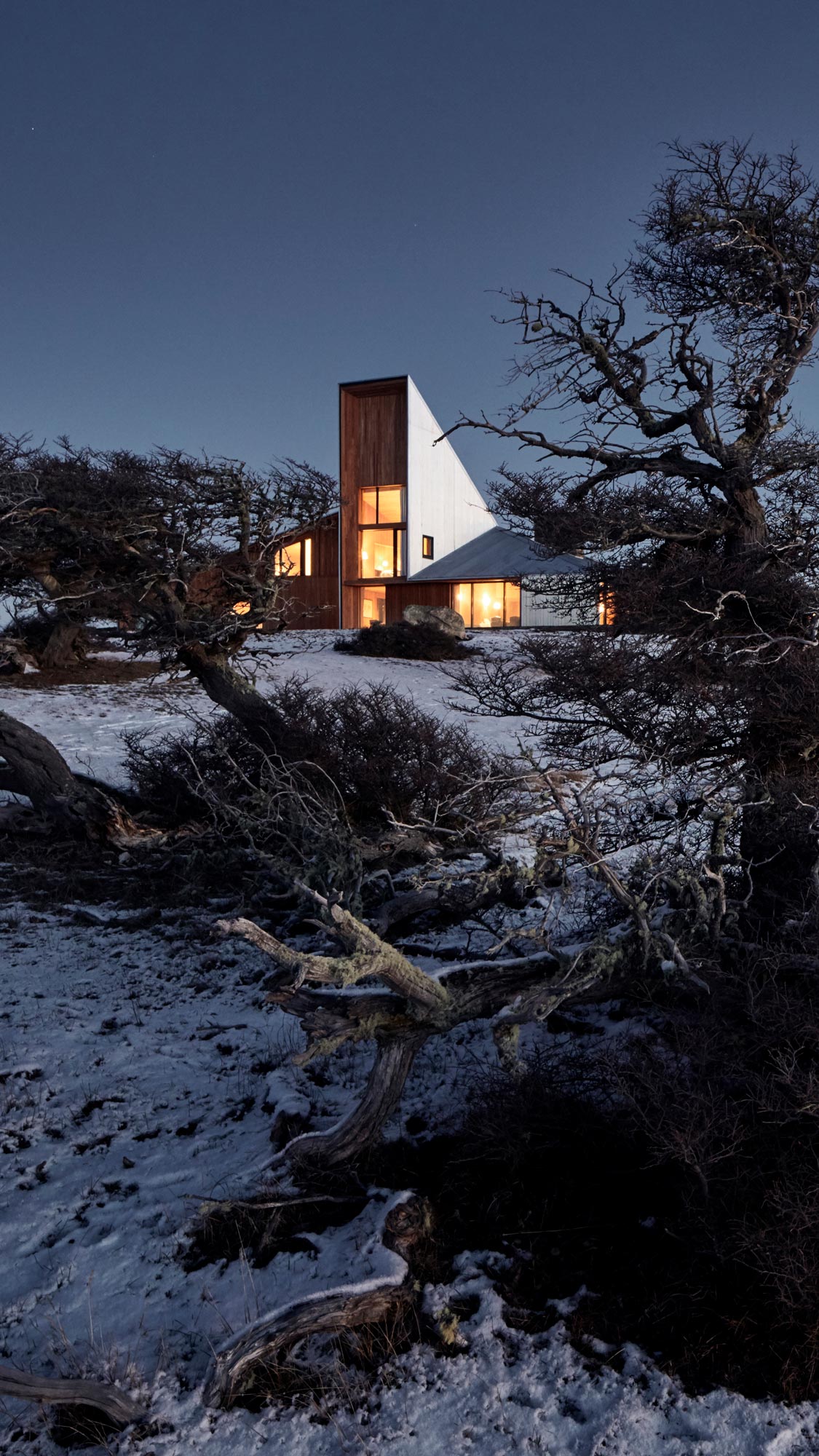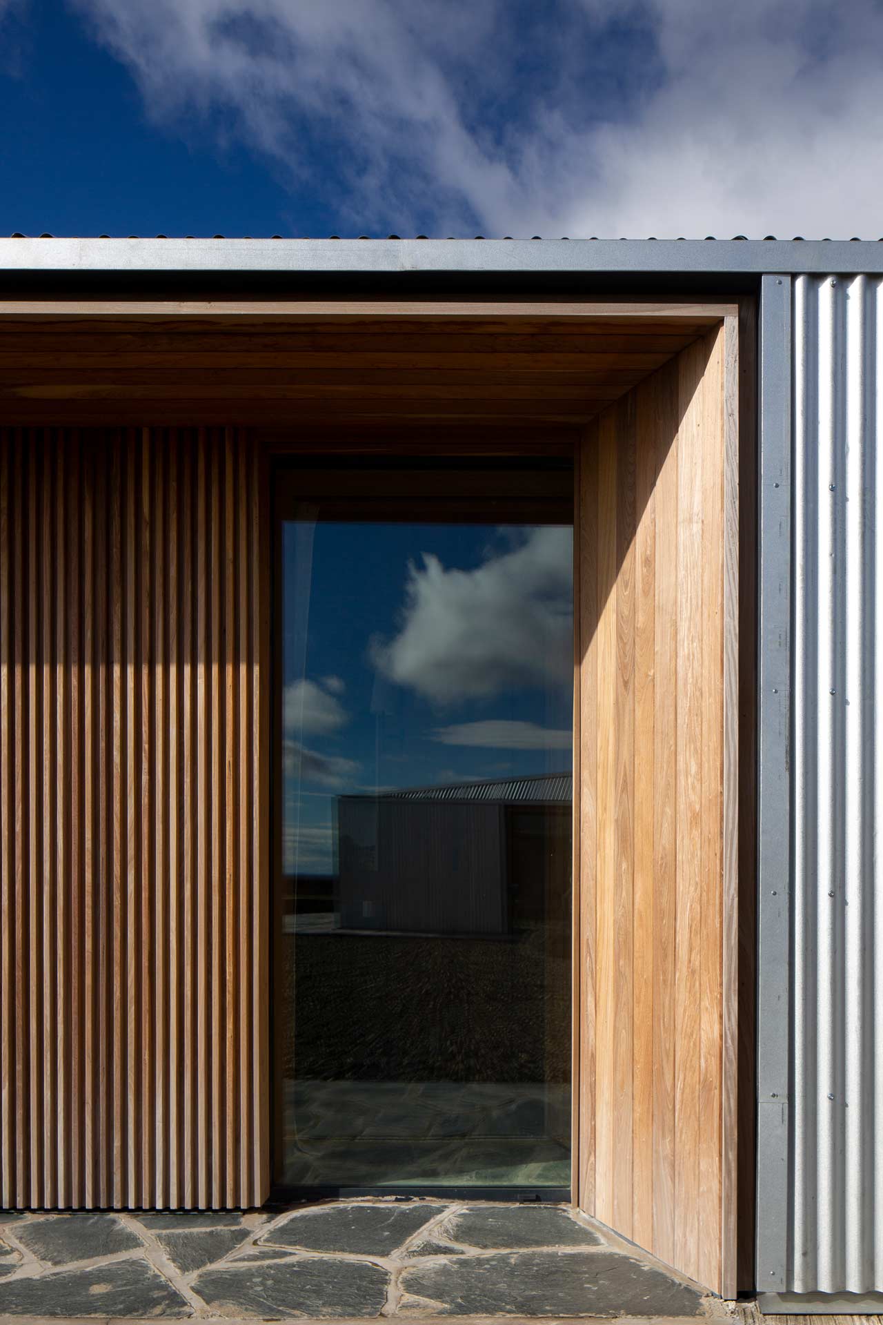 The glass openings are concentrated in the most protected parts of the house, with their wooden frames and cladding linking the interior and exterior.