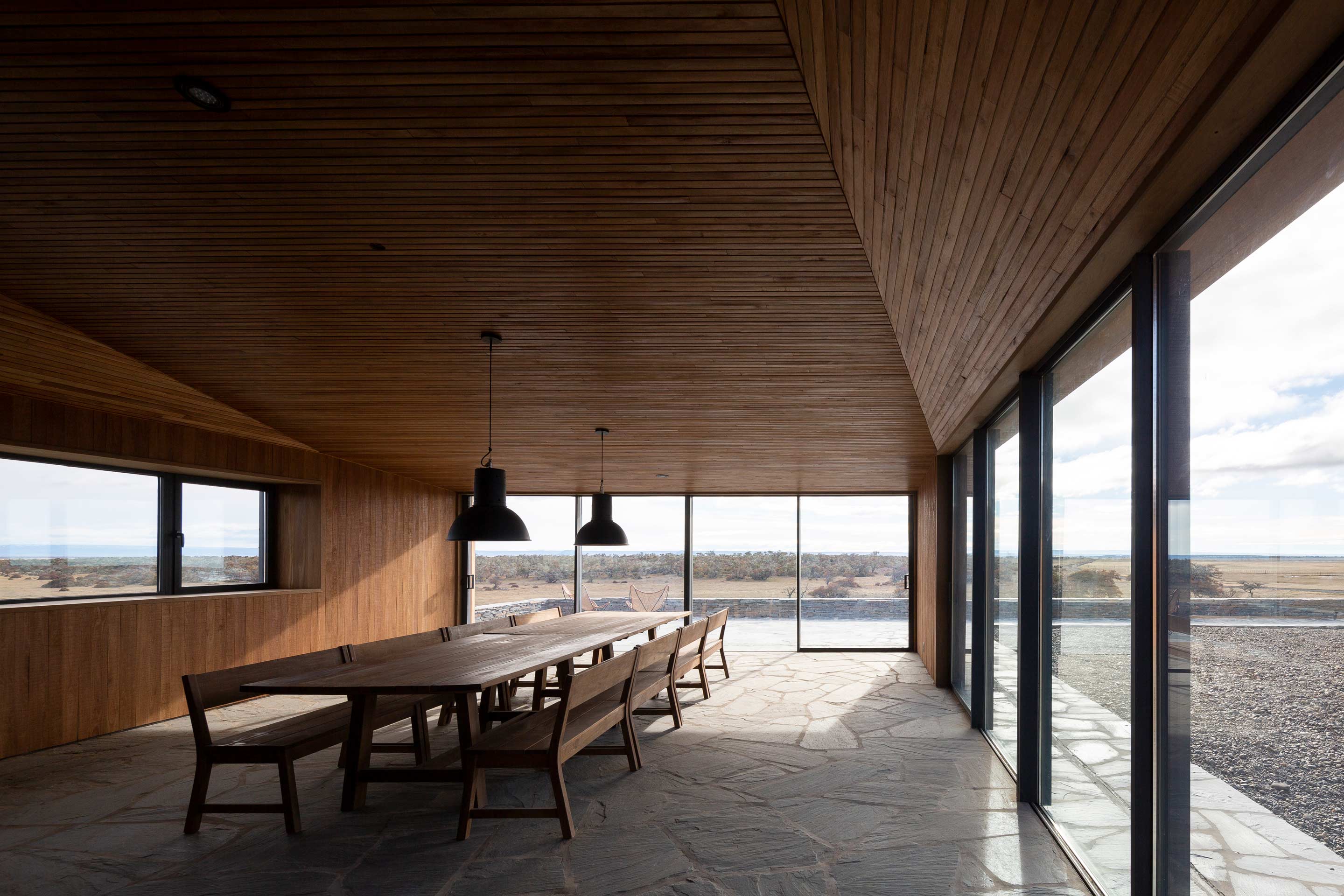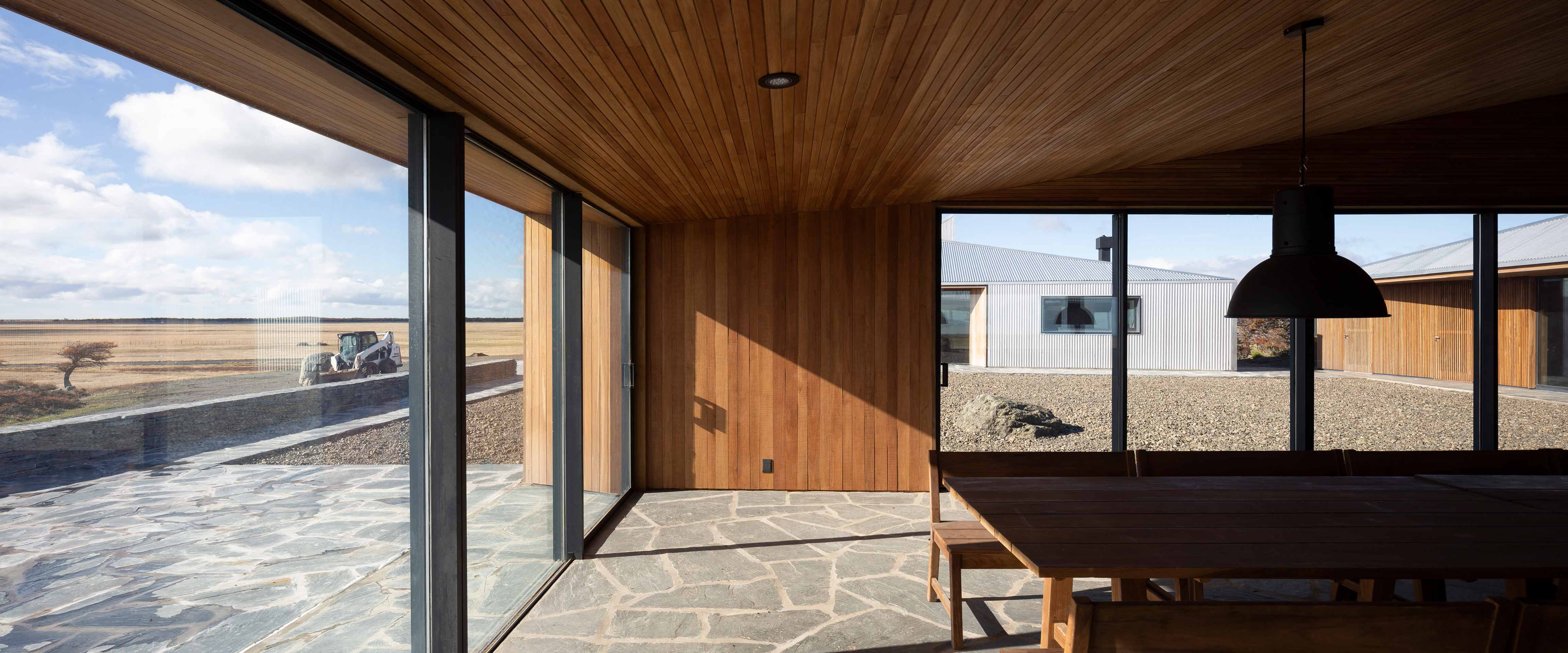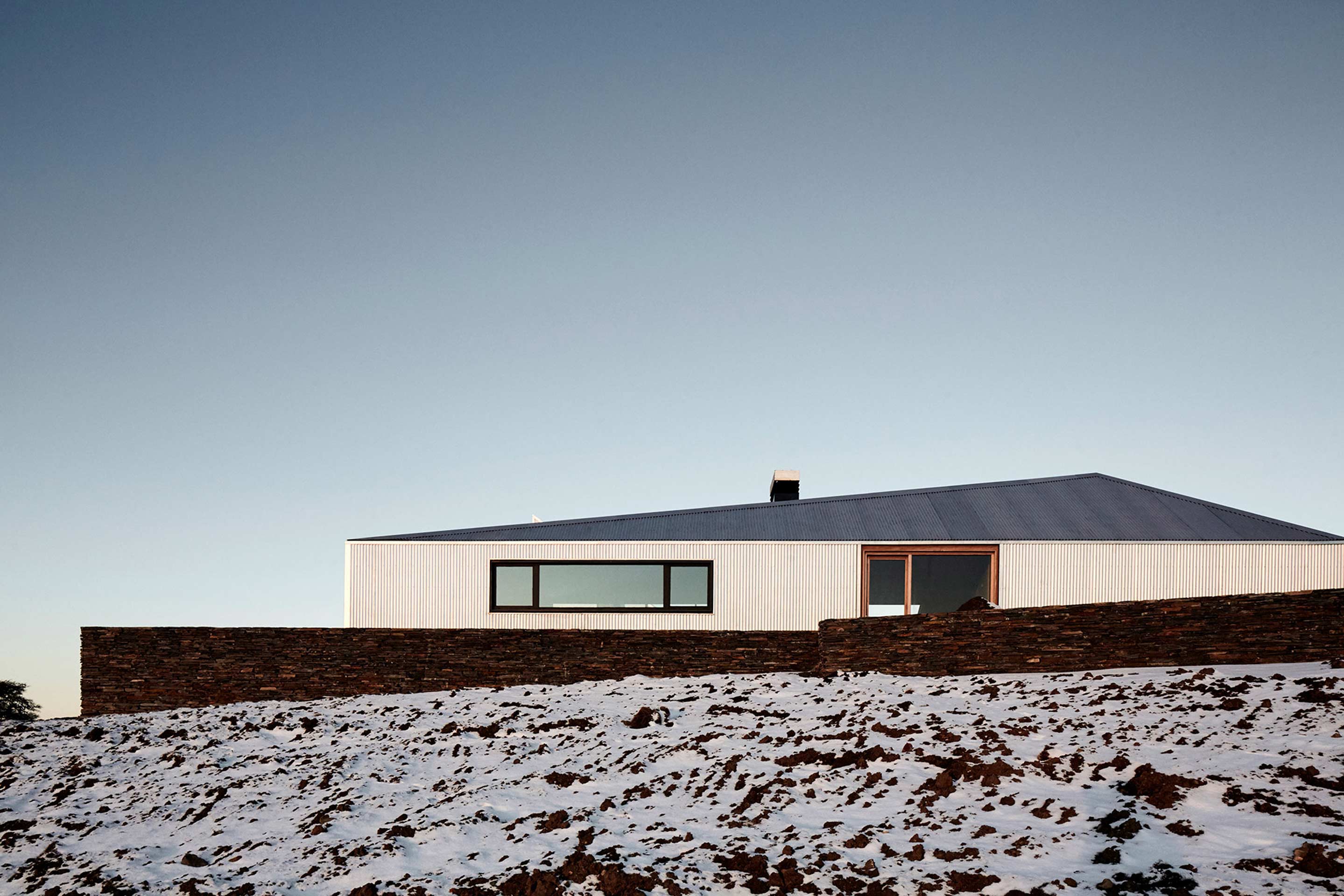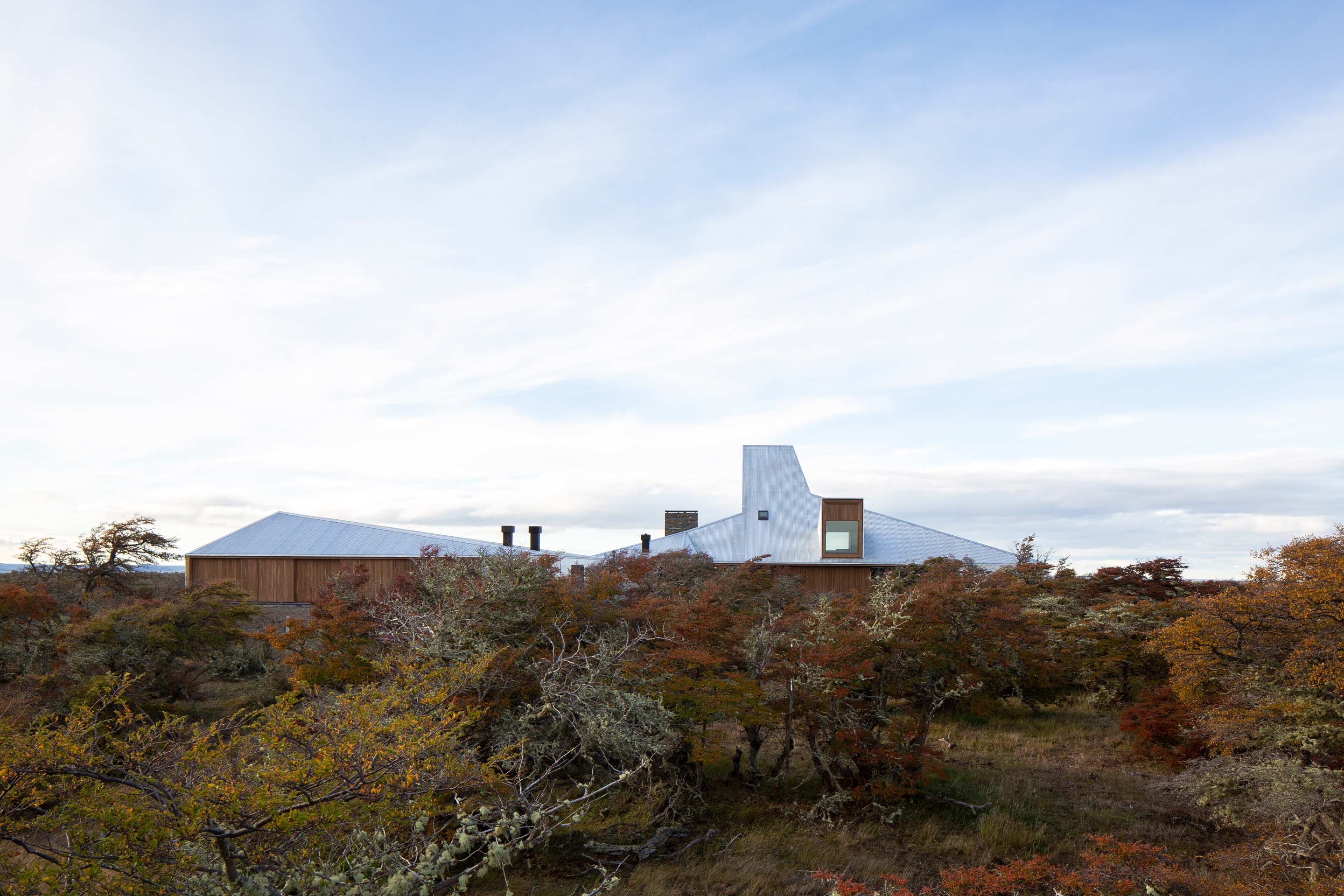 The new family home at Estancia Morro Chico is built on a hill offering panoramic views of the vast, undulating Patagonian landscape, its plains, ñires forests and the Andes foothills in the background. Its watchtower stands out as a new landmark in the powerful landscape of the Patagonian steppe.