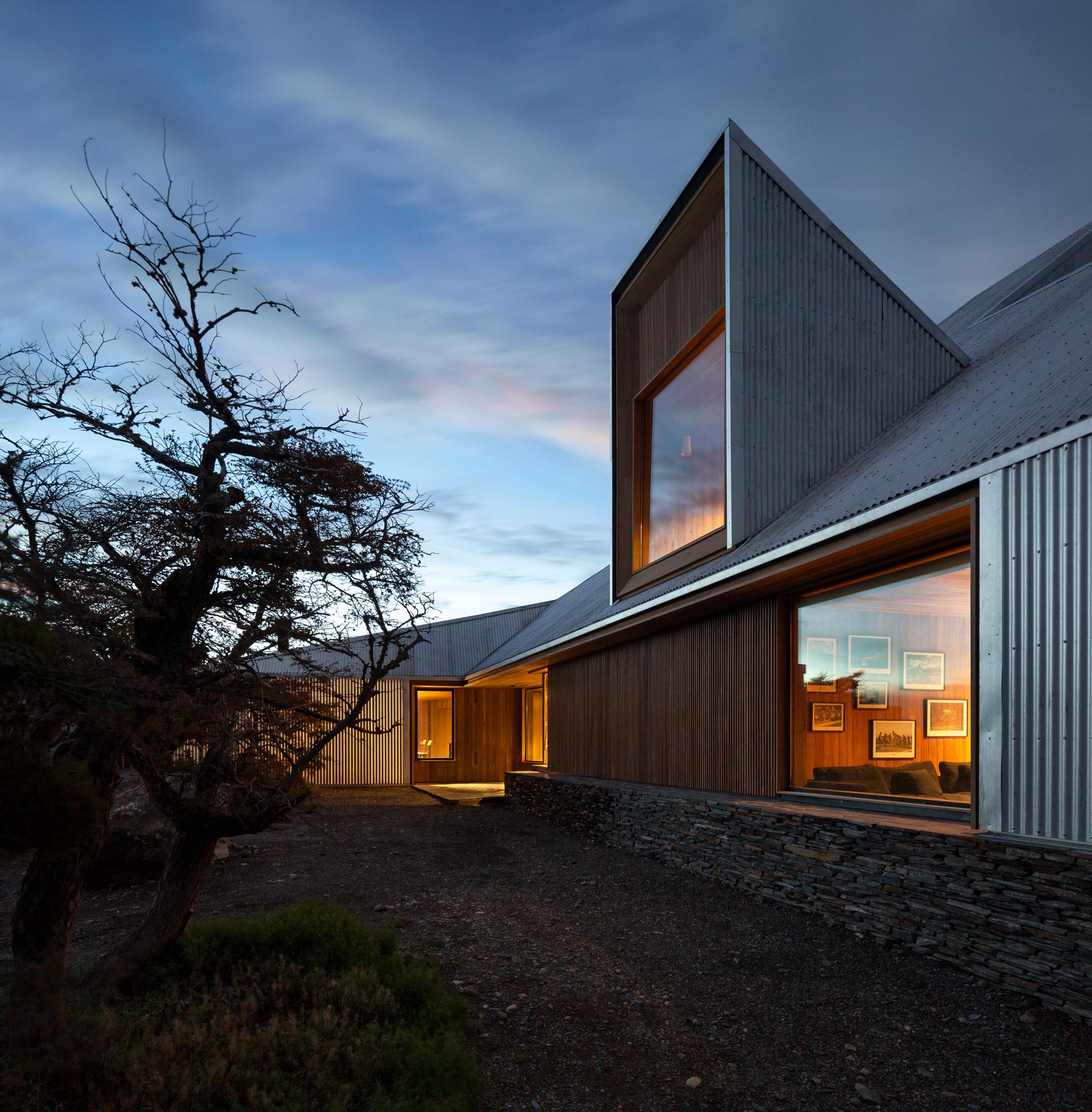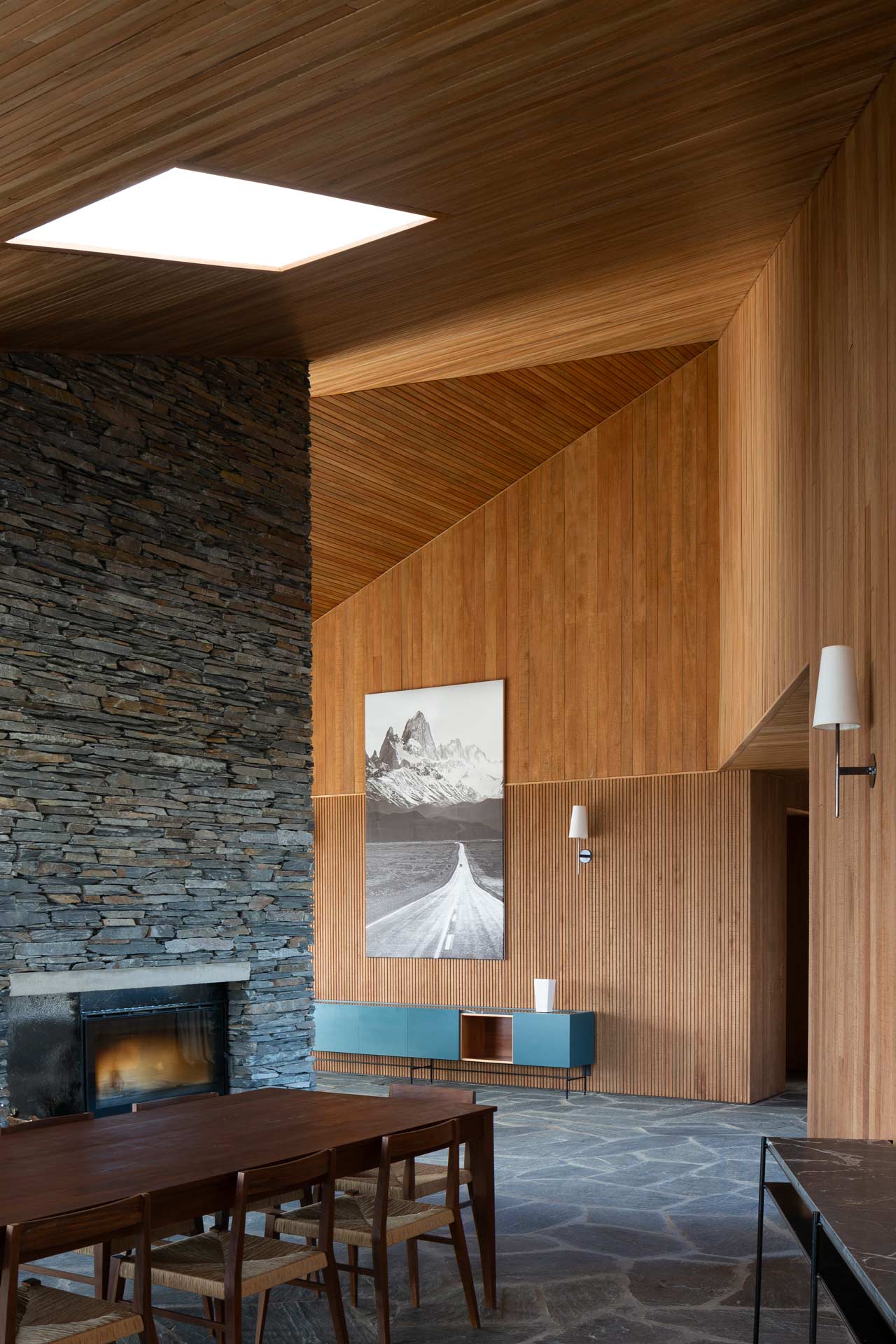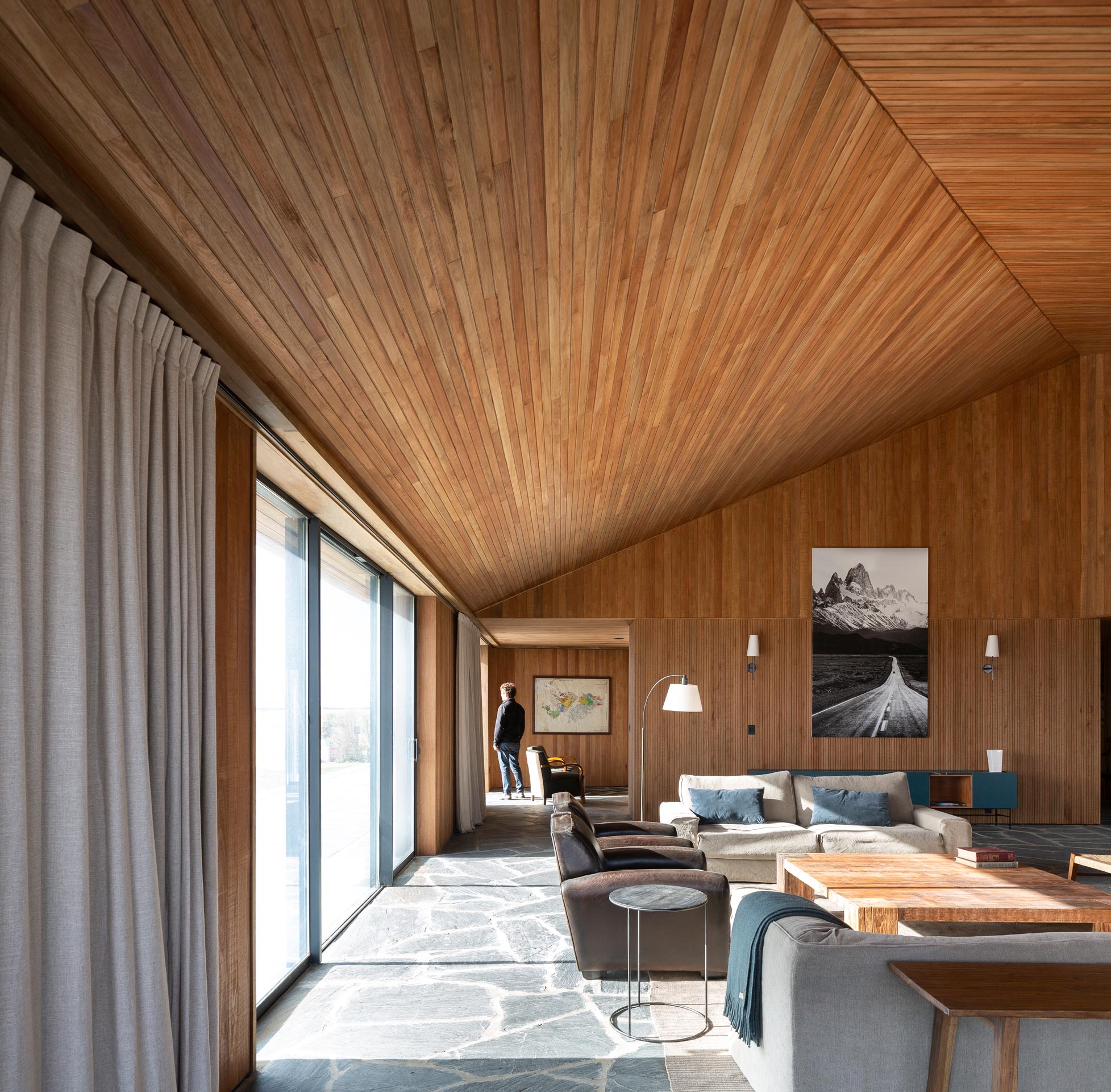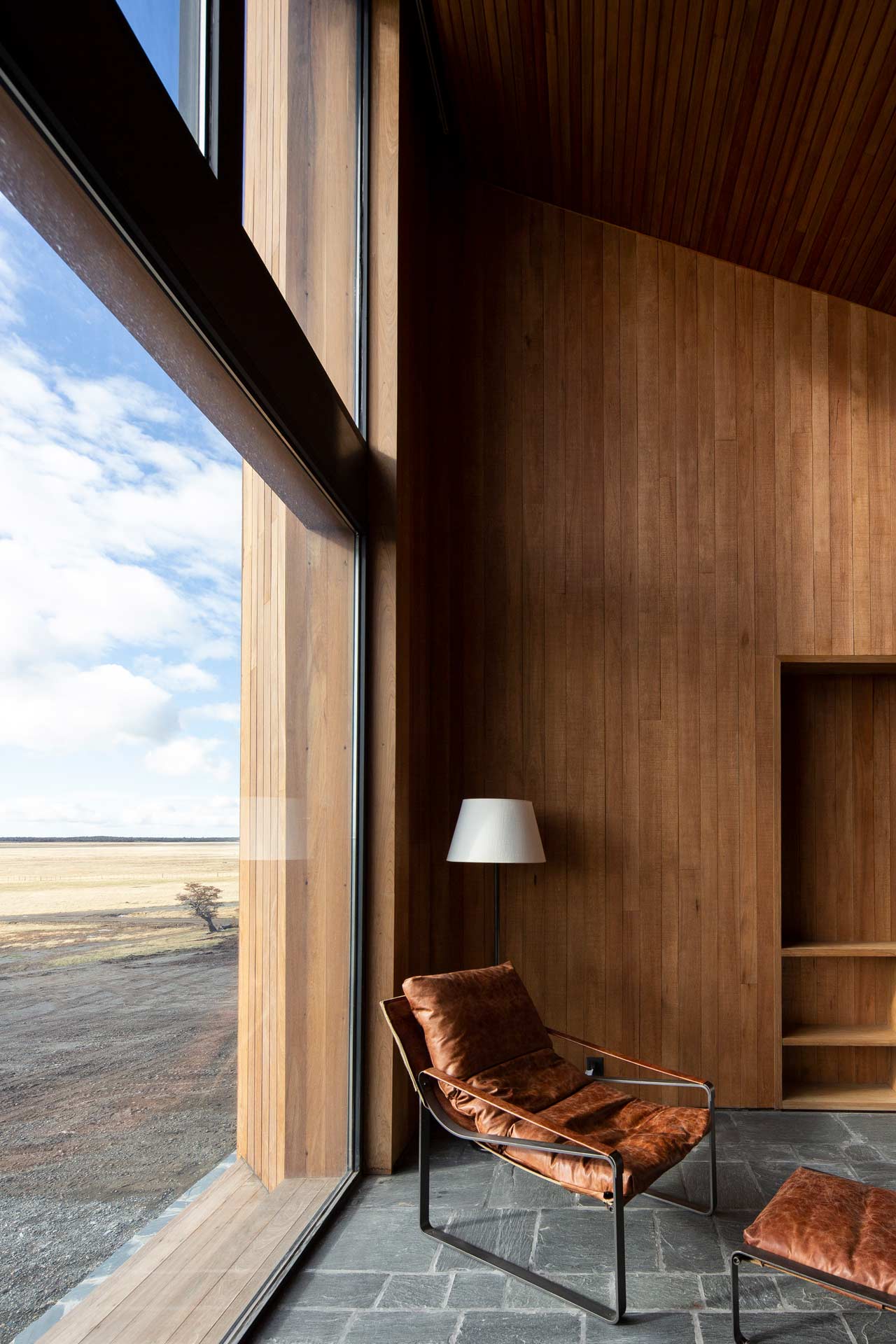 The new family home at Estancia Morro Chico is built on a hill offering panoramic views of the vast, undulating Patagonian landscape, its plains, ñires forests and the Andes foothills in the background. Its watchtower stands out as a new landmark in the powerful landscape of the Patagonian steppe.