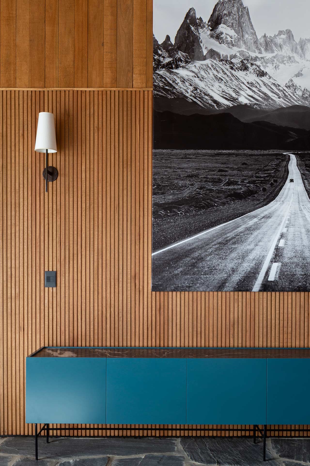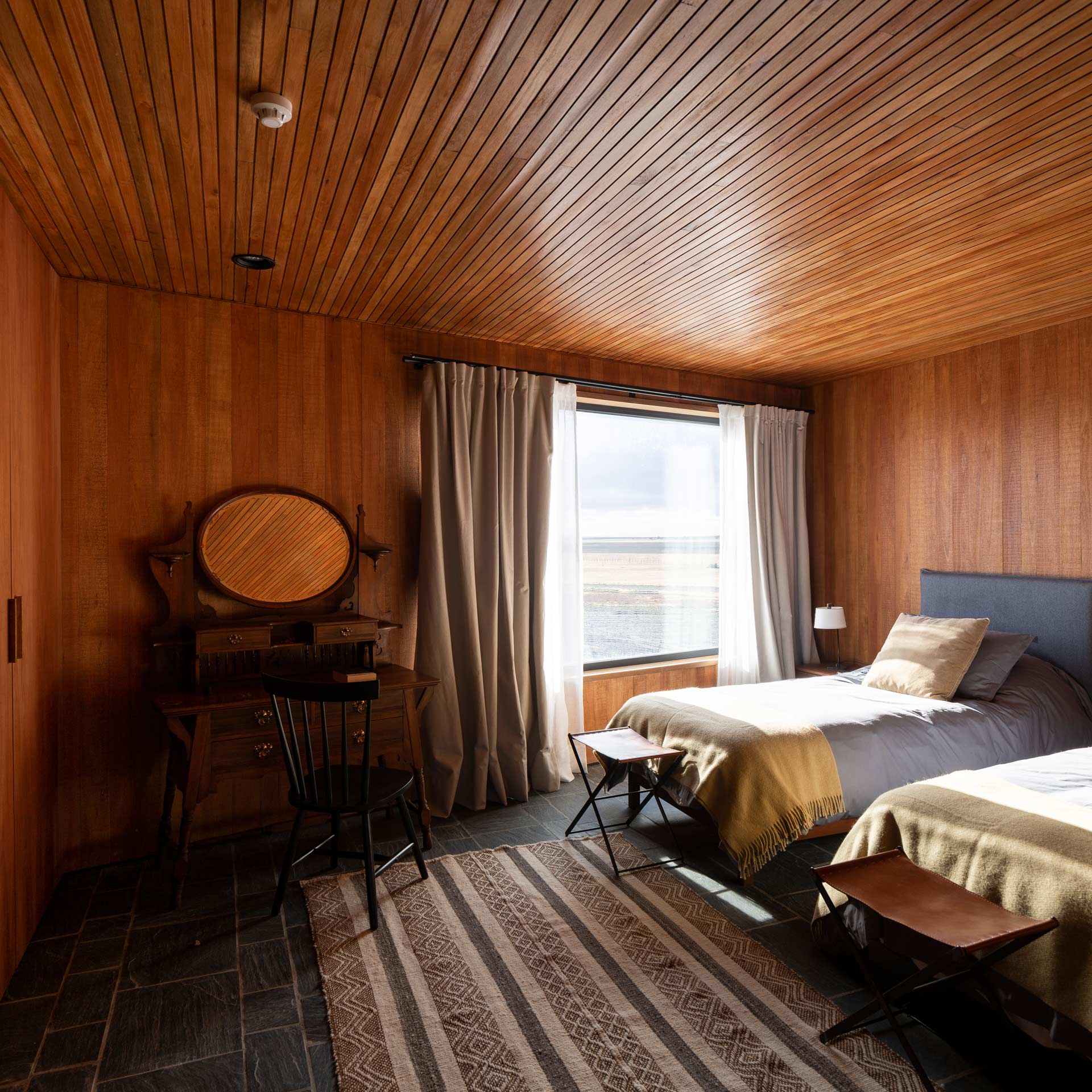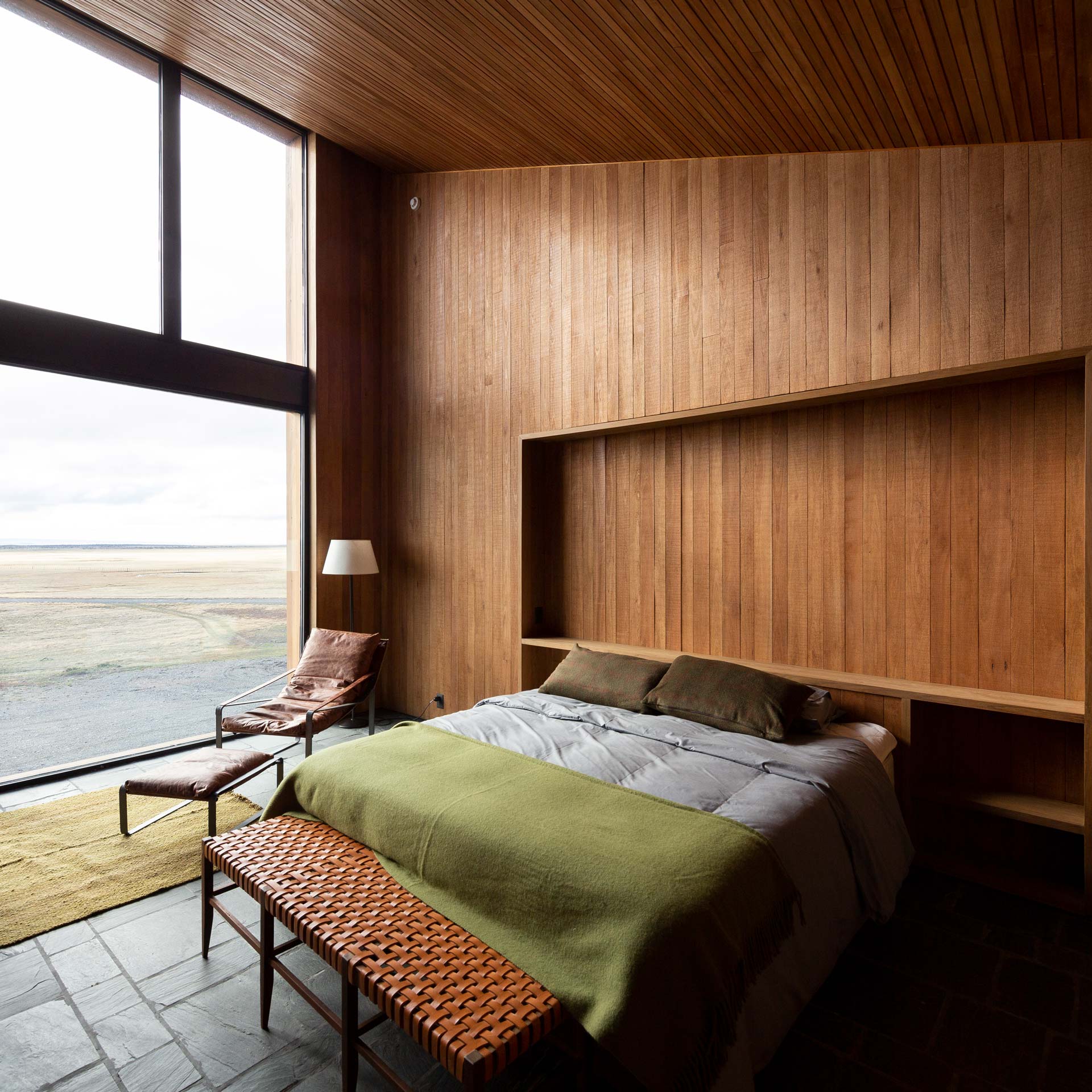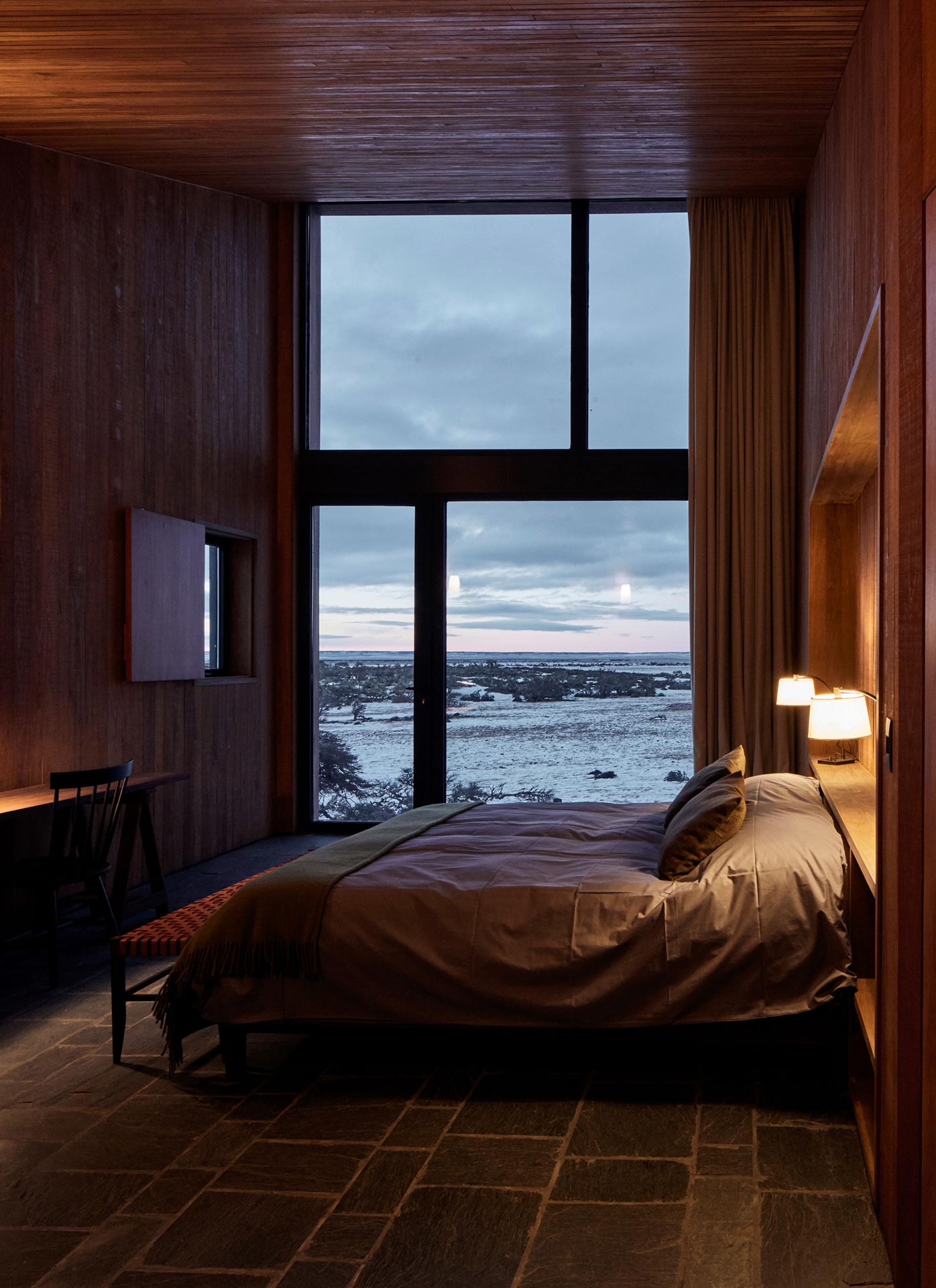 The new family home at Estancia Morro Chico is built on a hill offering panoramic views of the vast, undulating Patagonian landscape, its plains, ñires forests and the Andes foothills in the background. Its watchtower stands out as a new landmark in the powerful landscape of the Patagonian steppe.