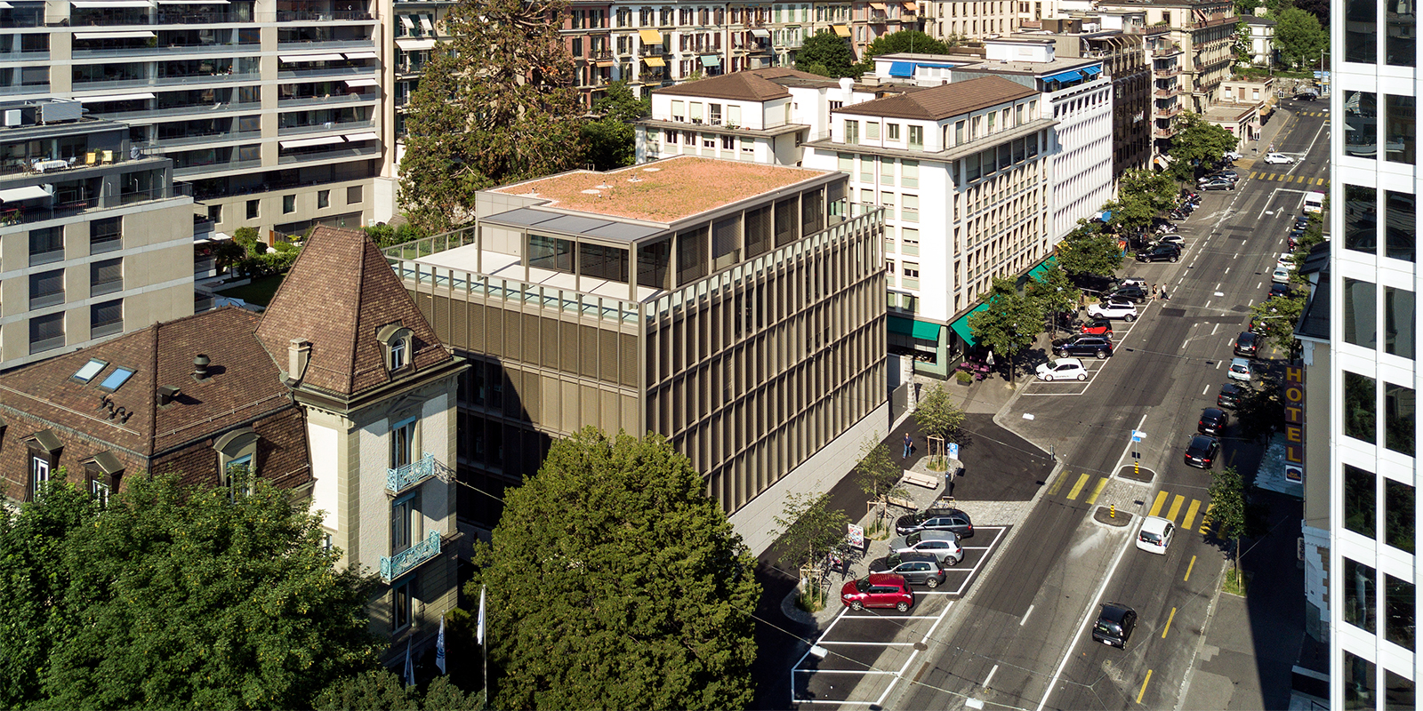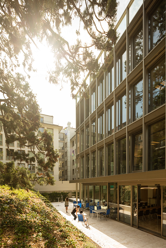 The technical choices made for the building, which meets the Minergie label, aim for energy efficiency that prioritises ease of use and economy of means. Heat is provided by district heating. The exposed reinforced concrete slabs have no false ceilings, improving energy efficiency thanks to their inertia. All technical distribution systems are concentrated in the floors. The hygienic air supply is mainly embedded in the slab, while a secondary distribution system in the raised floor provides additional supply for the conference rooms. The façade also features opening windows, which contribute to the well-being of users. The roof is devoid of the installations typically found in buildings that meet Minergie requirements. These have been deliberately housed in the basement in order to free up the roof for complete greening, out of consideration for the views from the buildings overlooking it.