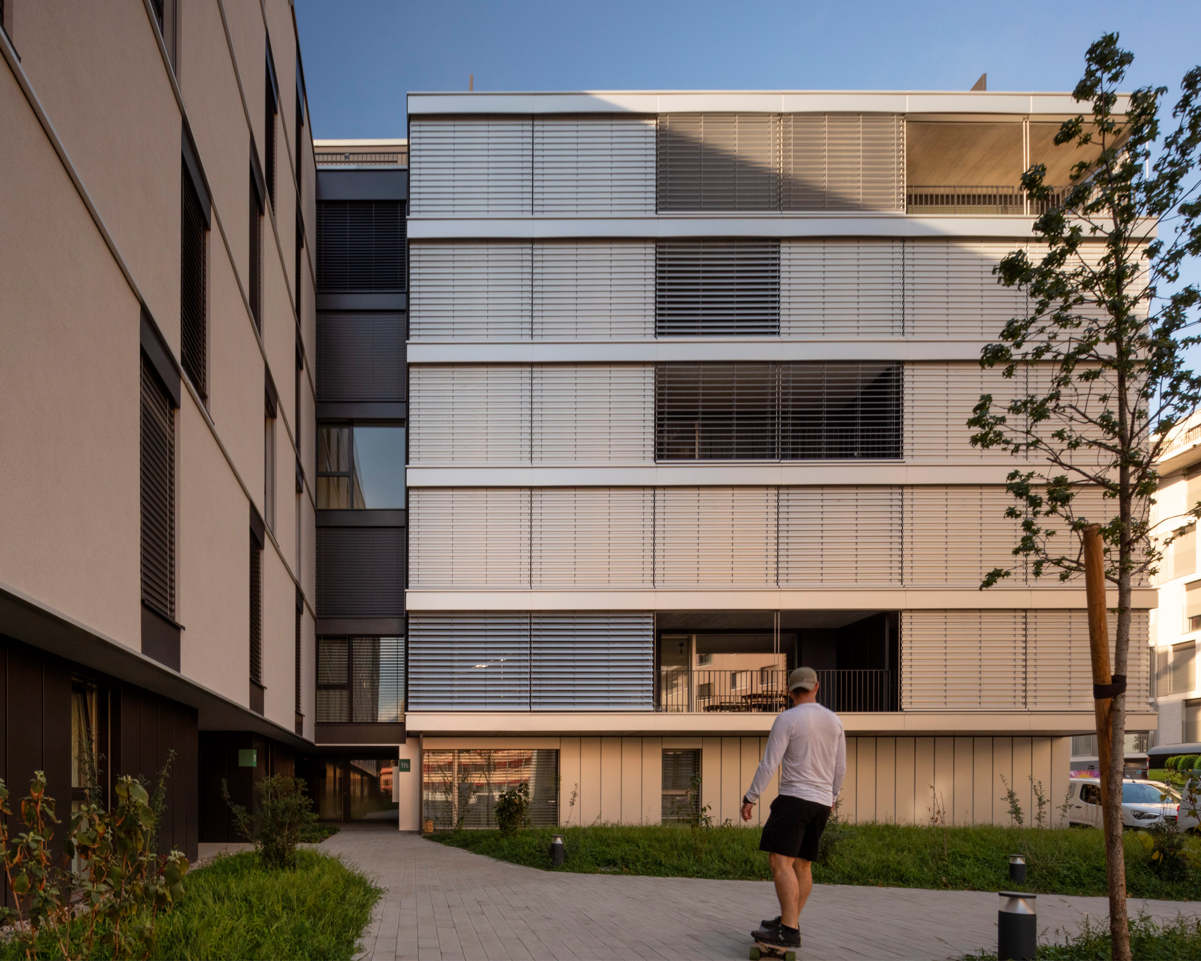 The apartments, 20% of which are reserved for public housing, consist mainly of 2.5 and 3.5 rooms, supplemented by 1.5 and 4.5 rooms. These are spread over six floors and an attic, while the lower ground floor, along the Veveyse promenade, houses six semi-detached 2½-room ‘maisonettes’ with private gardens.