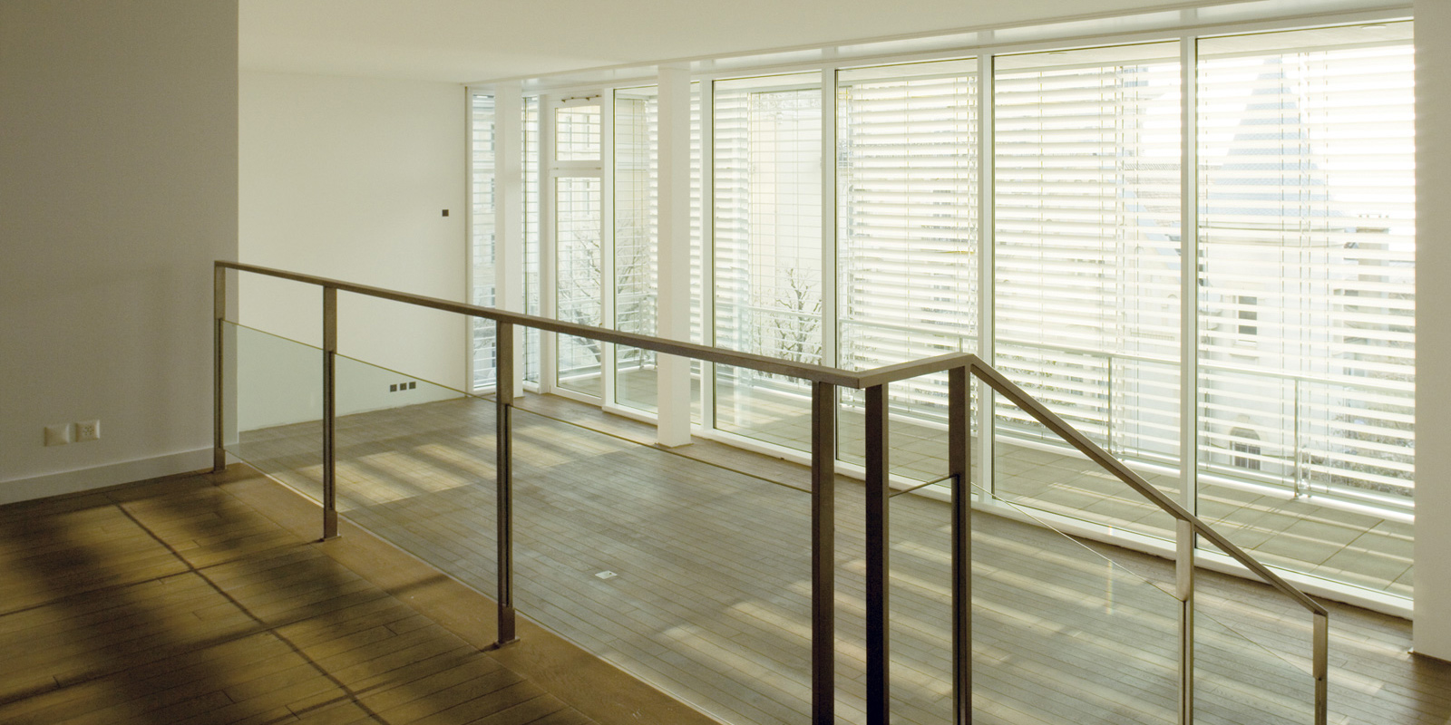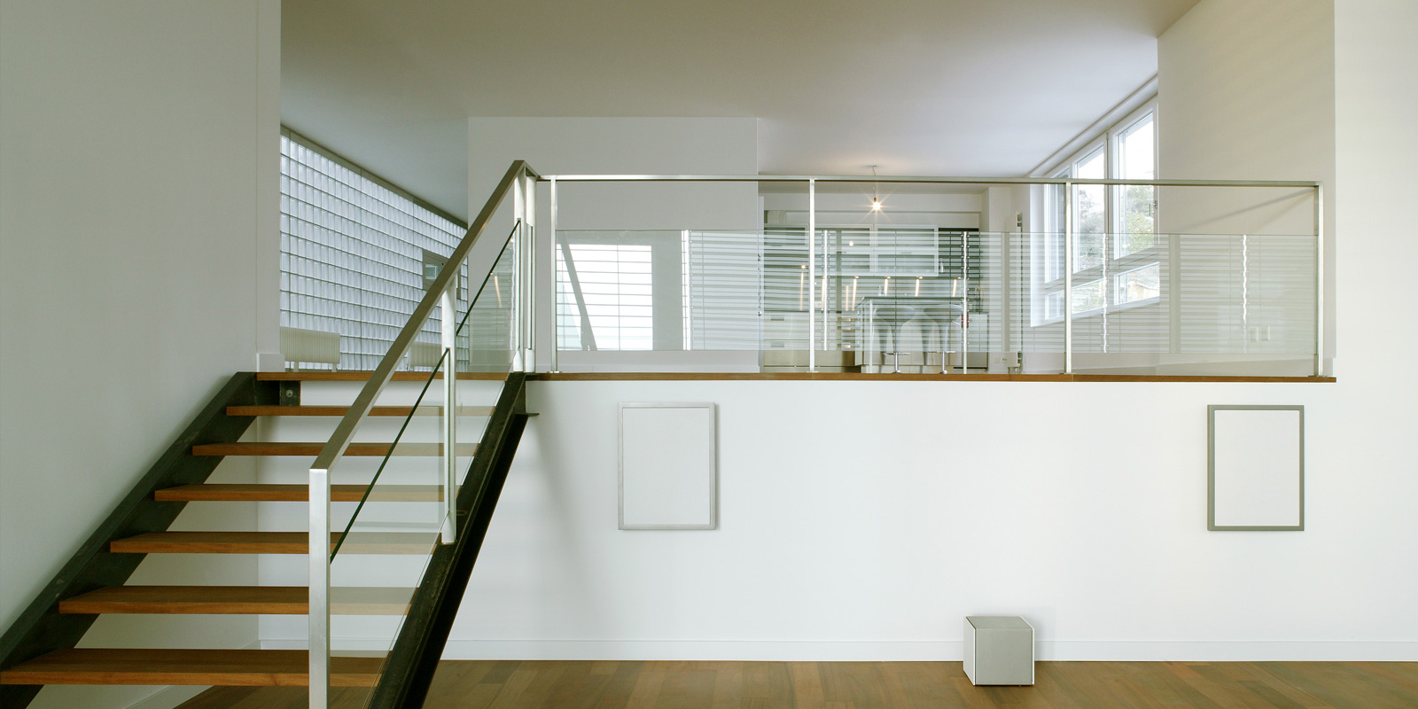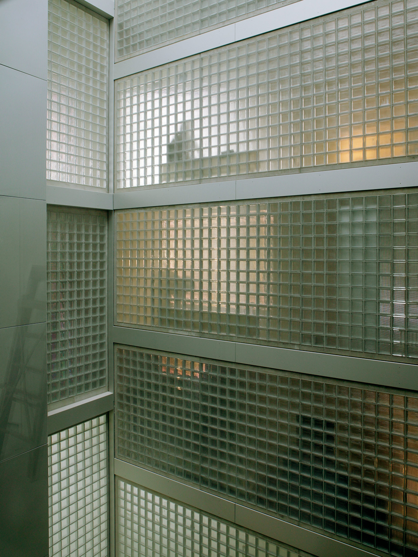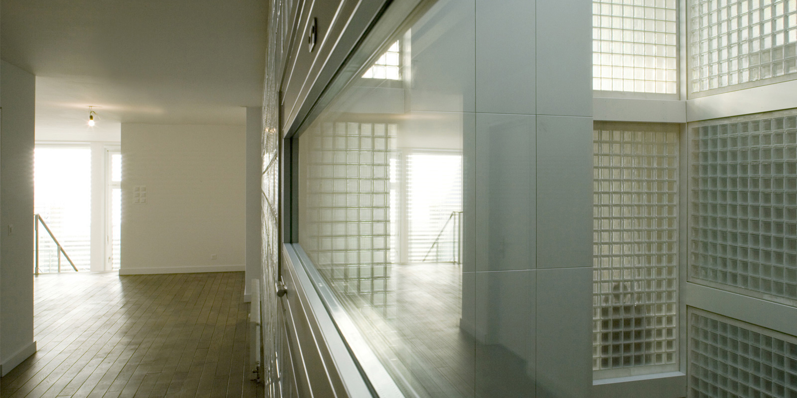 For these new constructions—two glass and brick volumes inserted into the sloping terrain and supported, at street level, by a series of concrete pilotis—the main architectural challenge was to break slightly from a traditional apartment typology of single-level dwelling units in order to provide floor heights appropriate to the proportions of living spaces. To do so, each apartment is composed of two different levels. Facing the lake, are living rooms with dramatic ceiling heights, while rooms surrounding the interior courtyard – bedrooms, baths kitchens, and dining rooms – have average ceiling hieghts. A series of two different typologies perceptible mainly through the project’s section thus overlap, both vertically and horizontally. In order to rationalize construction and articulate the “L” shape plan of each flat into a compact volume, all flats were distributed around a generous inner courtyard, the sides of which are composed of glass bricks to allow maximum income of light into the circulations and creating interesting shadows as the inhabitants move around their respective homes. The facade facing the lake, all in glass, is protected by a series of horizontal shades located at the edge of the balconies, blurring the distinction between inside and outside and conveying a sense of lightness to the whole.