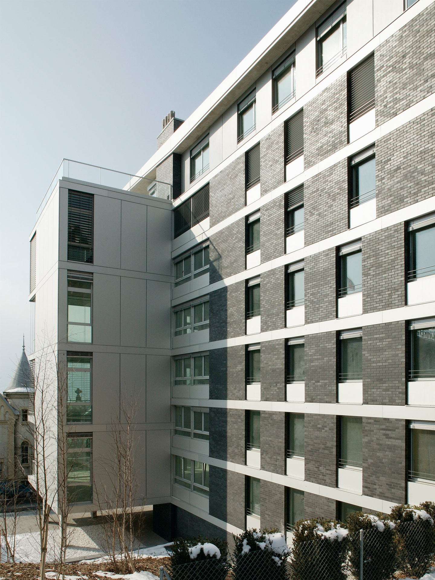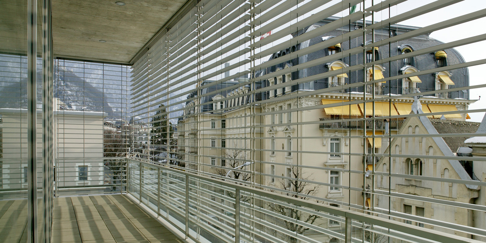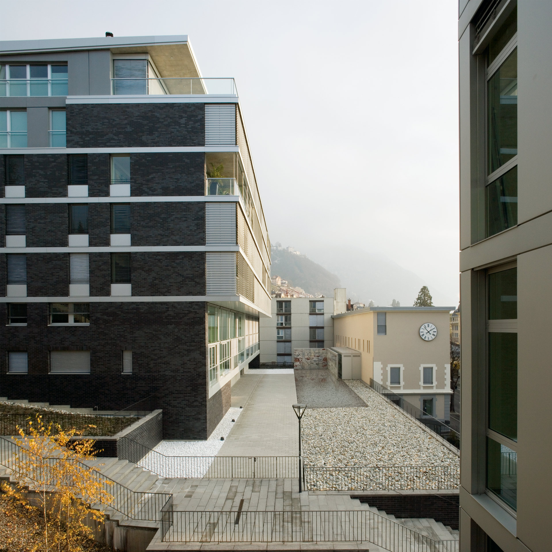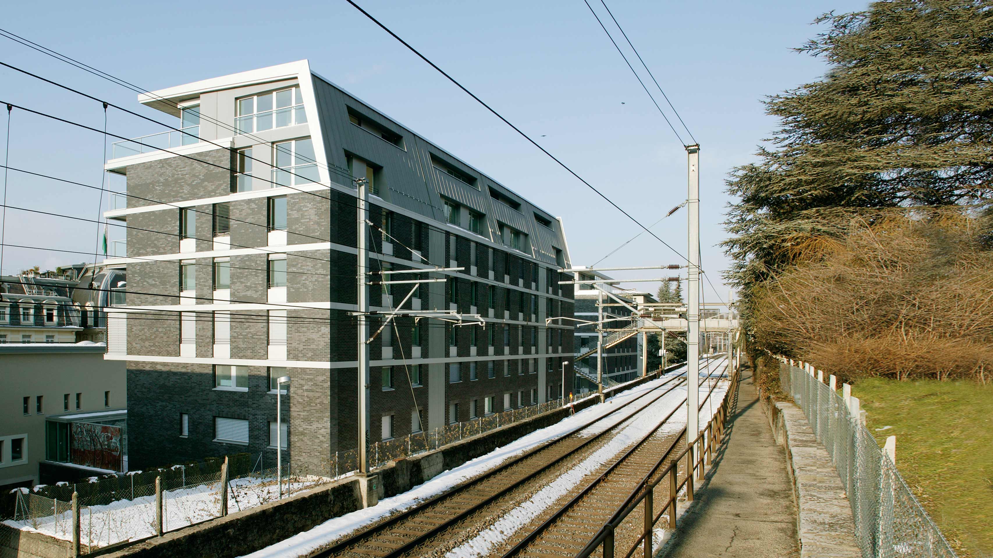 Located on the banks of Lake Geneva, the city of Montreux benefits from a particularly gentle climate giving it a Mediterranean character. It has become, since the 19th century, a popular tourism and pilgrimage destination, especially for a affluent international visitors. This city is well known for its elegant hotels and residences facing the Lake. The project called “La Verrière” consists of the renovation of a long and narrow existing building distinctive mainly for the glasshouse—an old winter garden located at its west end—that was integrated to the renovated part of the project. Inserted between this ancient masonry building, just behind the famous “Montreux Palace,” and the train tracks leading to the Montreux station, two tall residential buildings were erected, with their back leaning on the railway and their main façade completely open towards the lake.