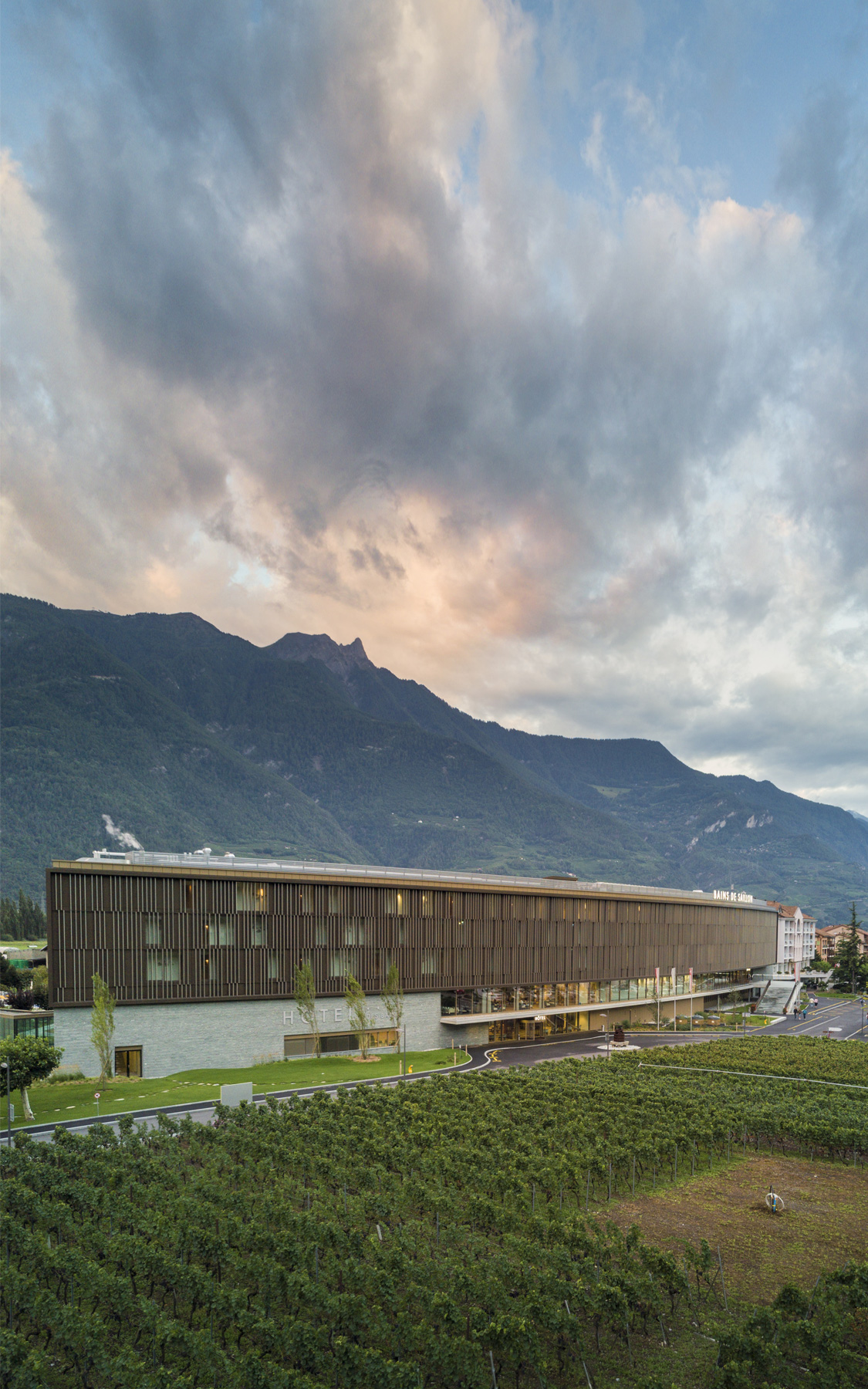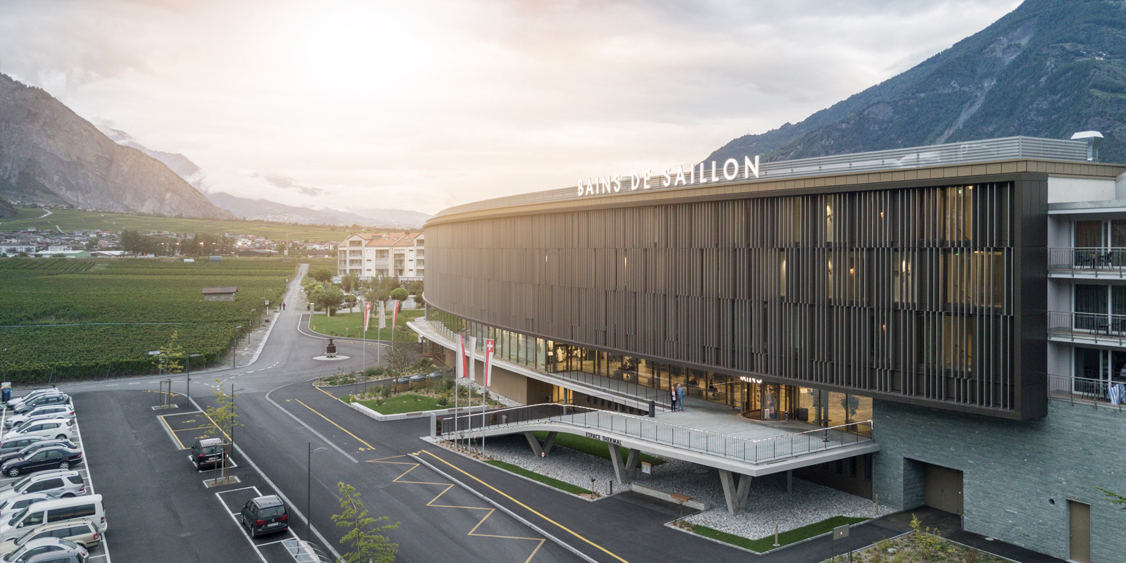 In 2008, when the Boas group decided to take over the Saillon spa centre, it launched a large-scale project lasting for almost seven years. The aim was to boost the attractiveness of the complex by modernising the spa and by building a new hotel. The project was designed to minimise impact on the existing hotel – the first four-star hotel in the Rhone plain – and on the thermal baths, which welcome an average of 1500 people a day, and as many as 3000 at peak times. The aim was to design a different hotel complex, modernising the image of hotel services in the Valais plain, and with a modern design, while continuing to ensure integration into the local environment. The new hotel is linked to the older one. It includes 78 new rooms, all facing south, adding to the 76 existing rooms, six restaurants, medical centre, physiotherapy centre, relaxation area, conference rooms and bar. Due to the complexity of the structure, a highly detailed study of the different foot-traffic areas for staff and visitors was carried out. The main flow of people (reaching into their thousands on busy days) leads through the building to the spa area. But access also needed to be provided to the same area for the staff in both hotels, and to organise access to restaurants, including the one in the spa area.