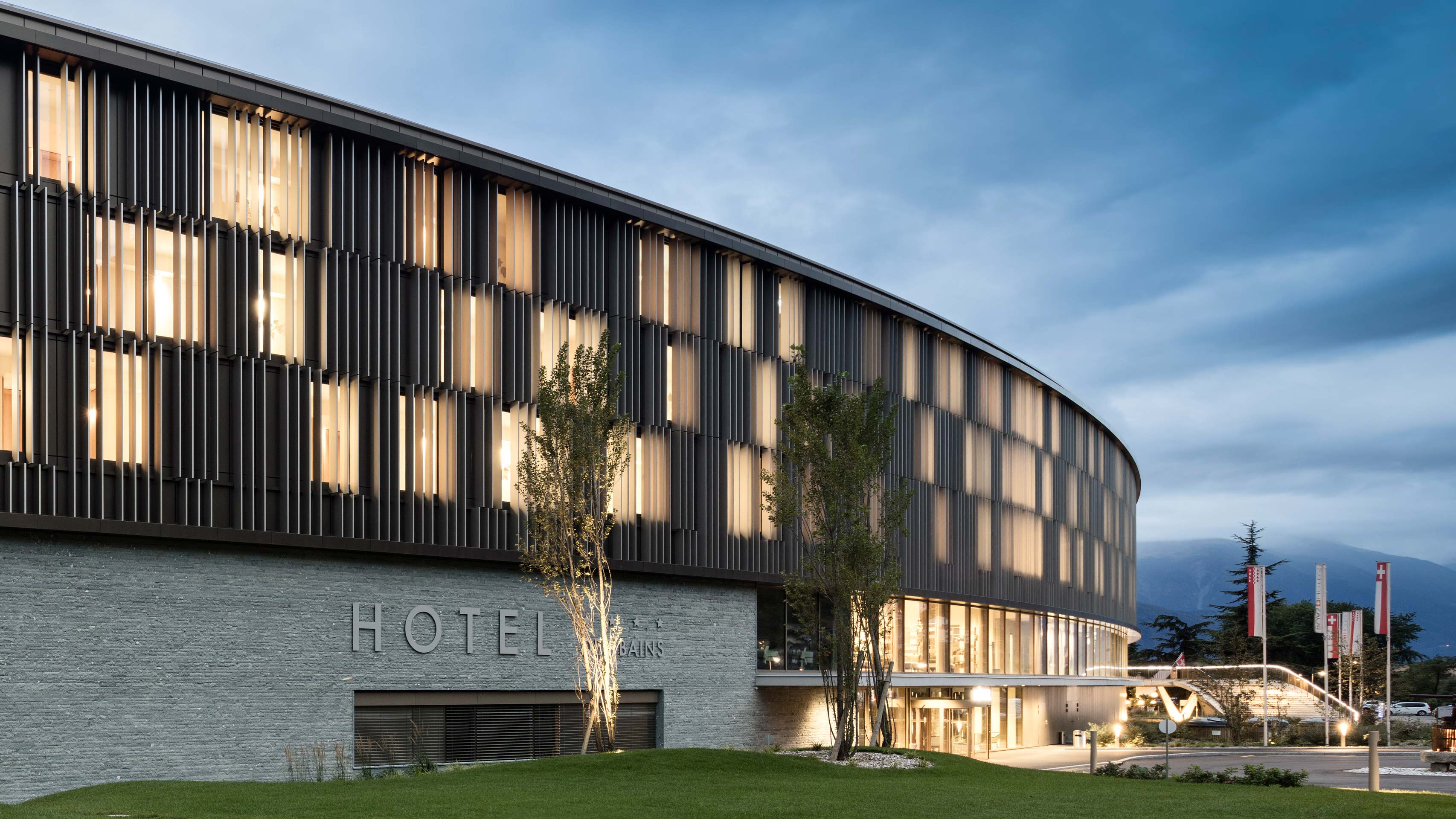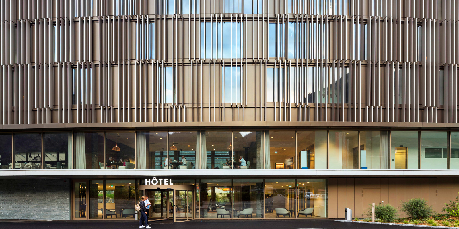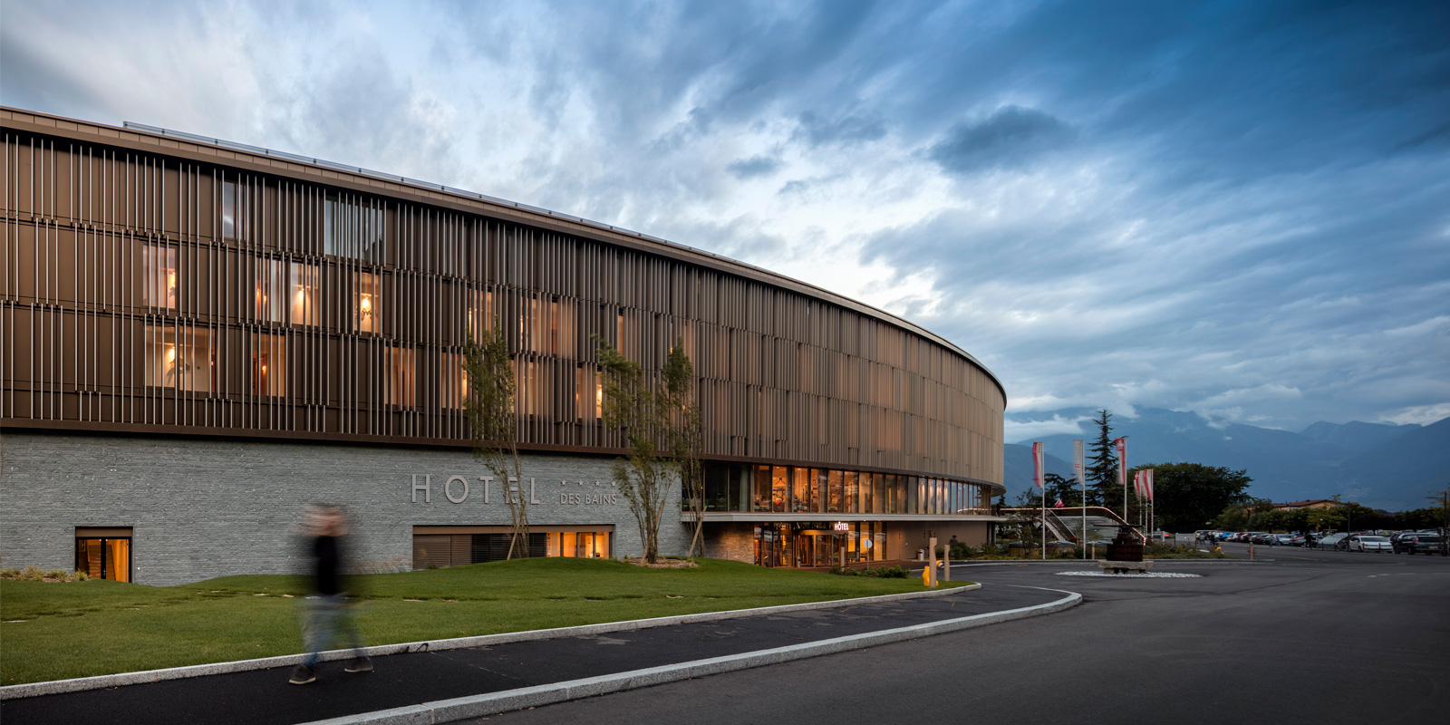 Materiality and expression: For the new hotel, the first sketch featured a wooden structure of the kind found in Austria. But building regulations at the time set a limit to the number of storeys. So a permanent structure was built in a semi-circle on five levels, displaying the 140-metre façade from the entrance. To reduce the monumental aspect of the building, a base on two levels decorated with Salvan stone was built below a three-level unit. The unit was softened and dematerialised by a light-coloured, open-work metal cladding with colours providing a wood effect. The stone base topped with wood recalls the spirt of a mazot chalet, expressing a traditional design but in a contemporary way. On the northern side, the first floor gives access to the hotel, while a monumental ramp leads visitors to the spa entrance in a natural way. Above the base, on three storeys, the walkways leading to the rooms receive light through openings. The openings are set in a random pattern, as are the vertical strips of thermo-coated aluminium that bring warmth to the façade and come to life as the sun shines on them. The southern façade is more linked to the mountains, with wood a prominent feature on the balconies: the floors are made from chestnut wood and the guardrail from larch. The use of wood extends into the rooms, with oak very much present, highlighting the specific character of an Alpine chalet and with an echo of Salvan stone on the wall.