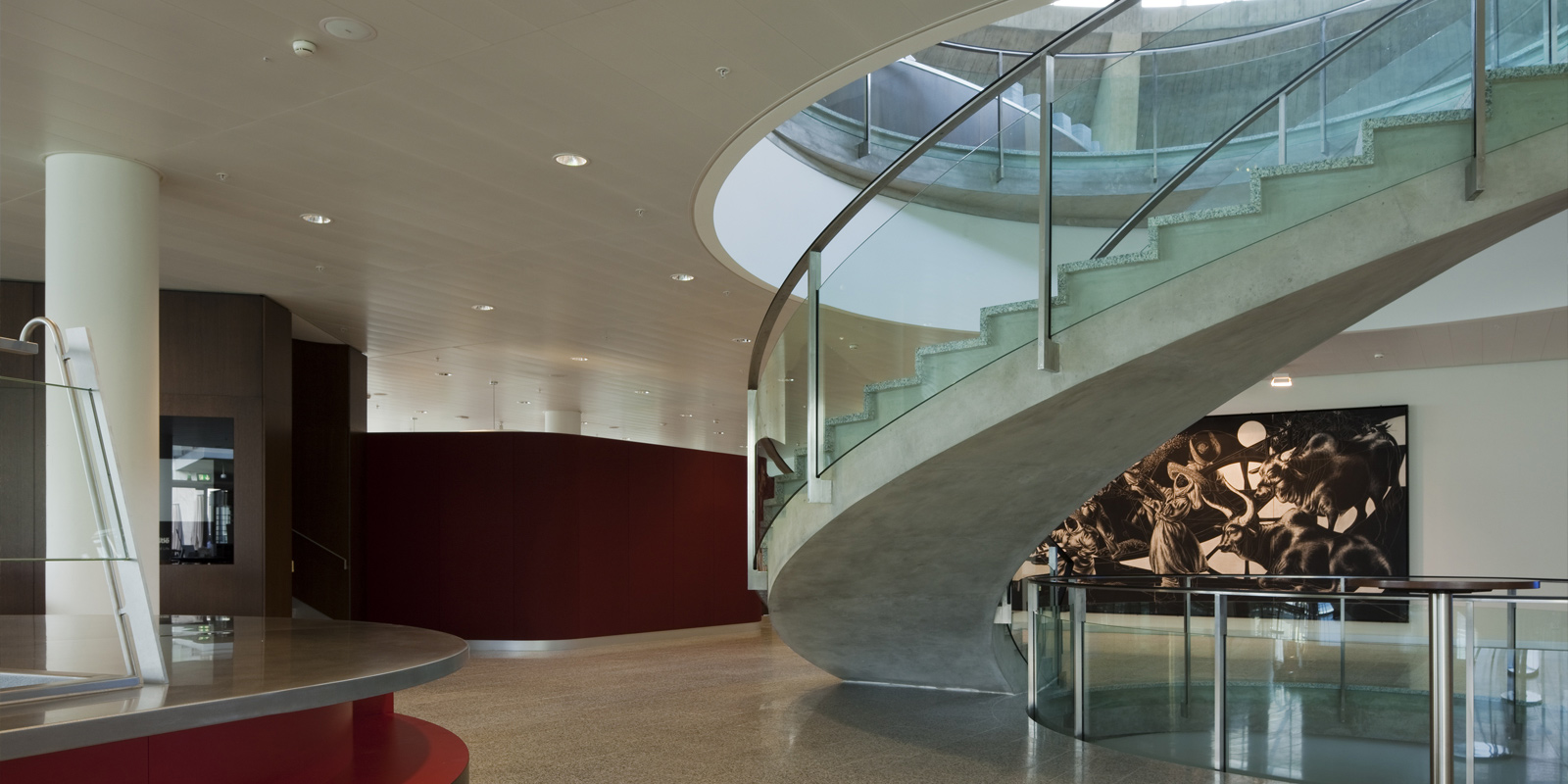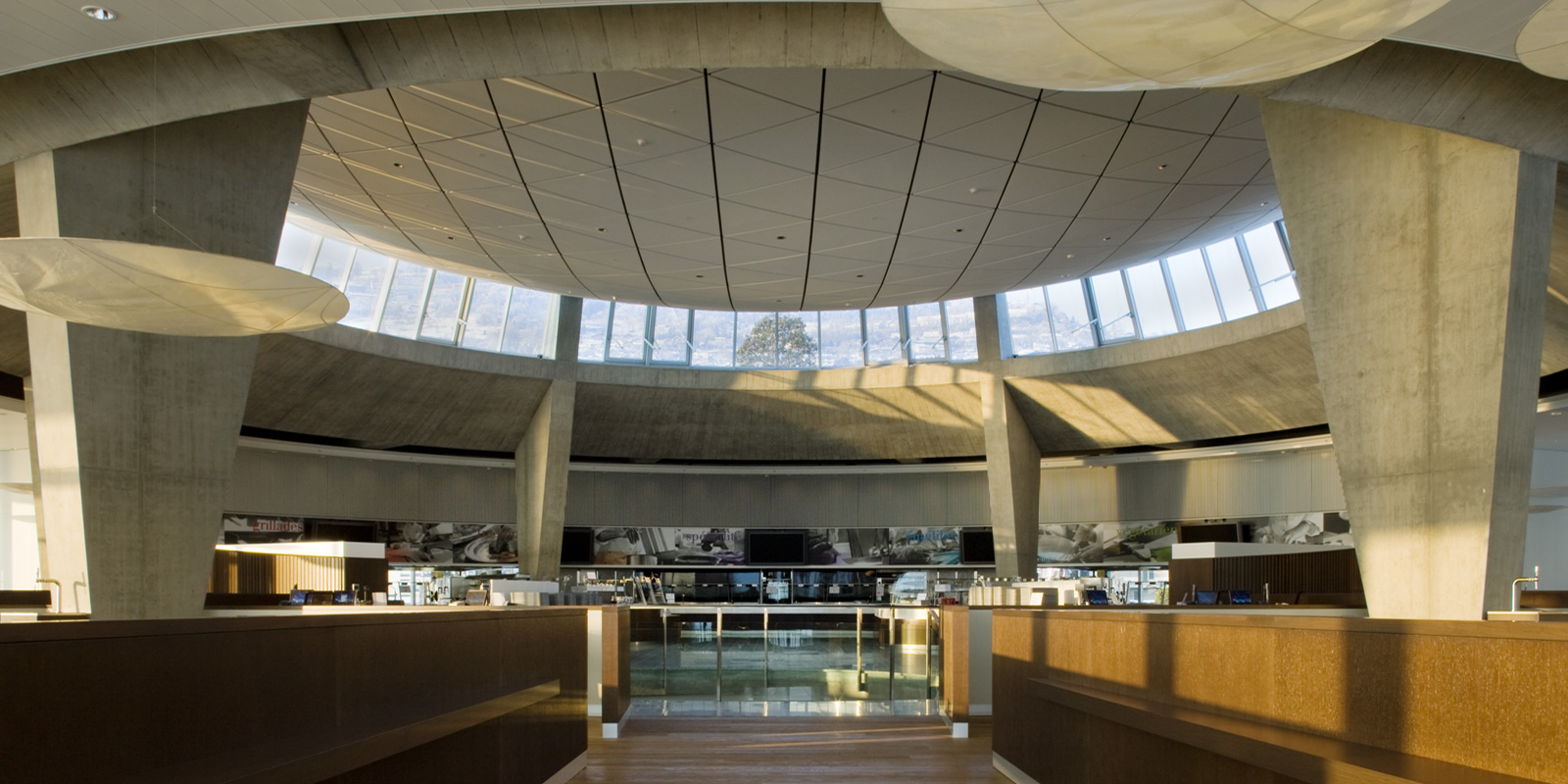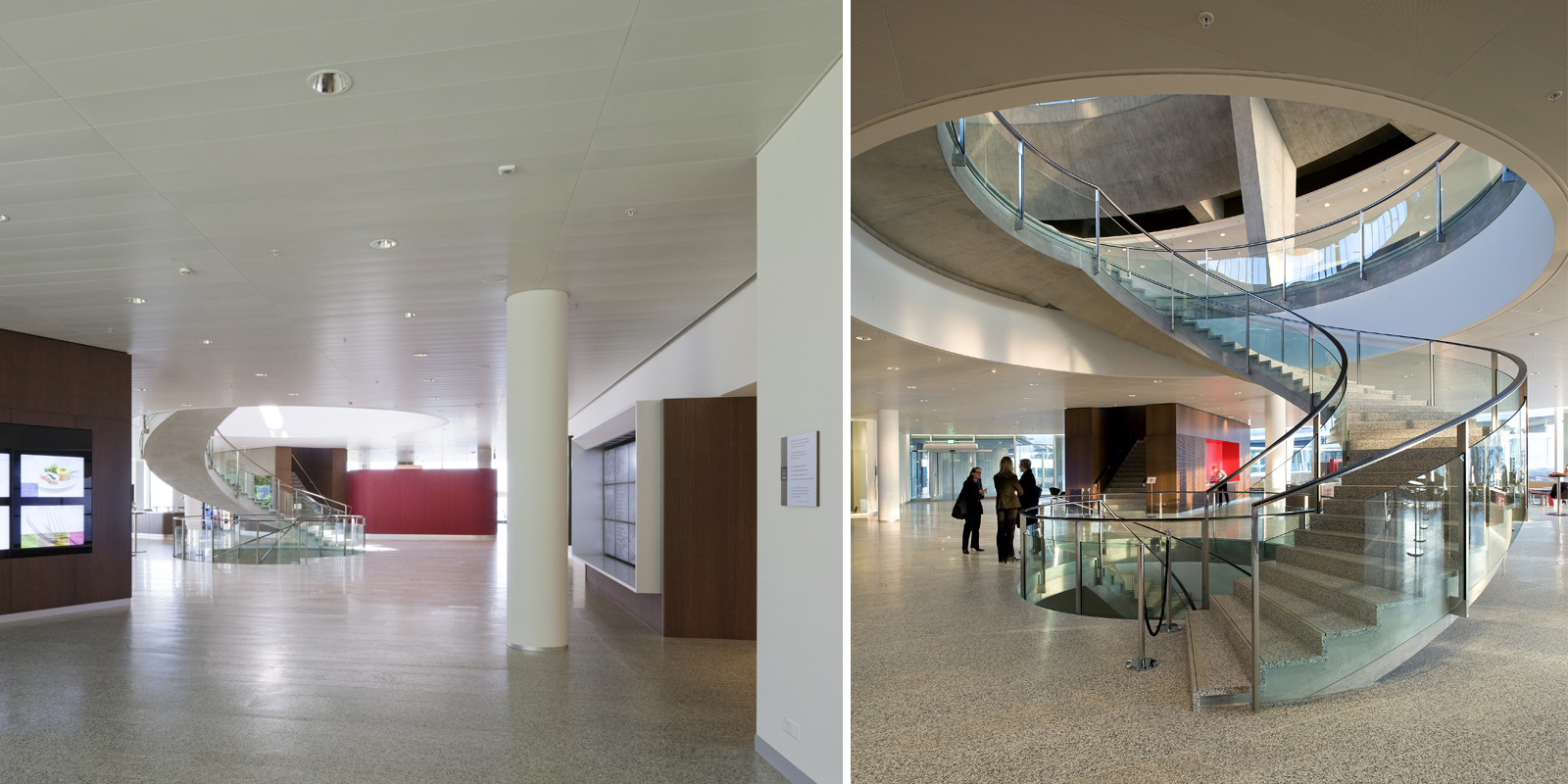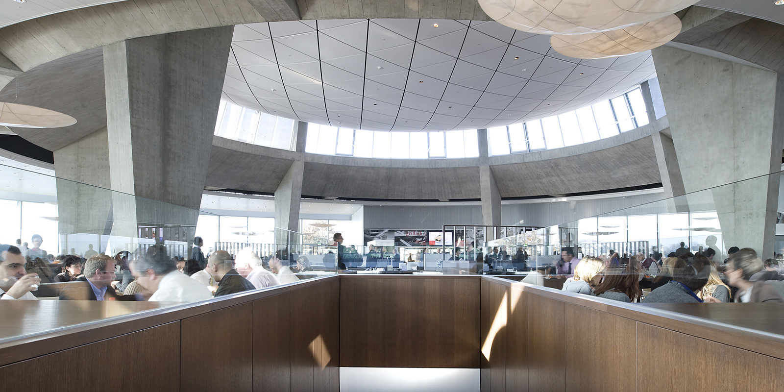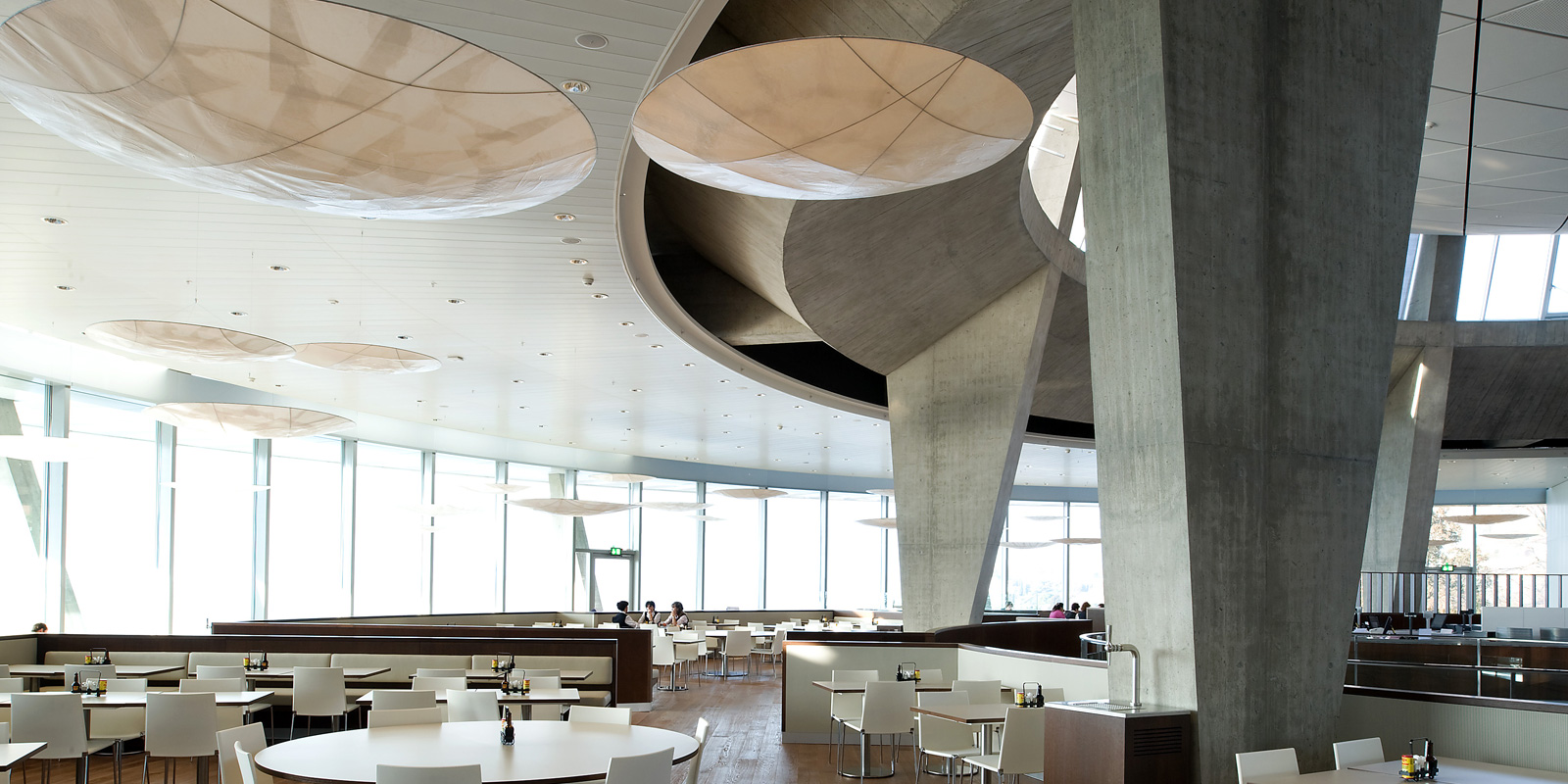 Corporate restaurants and cafeteria on two floors, self-service dining for 620, table service for 150, a cafeteria and a fitness center