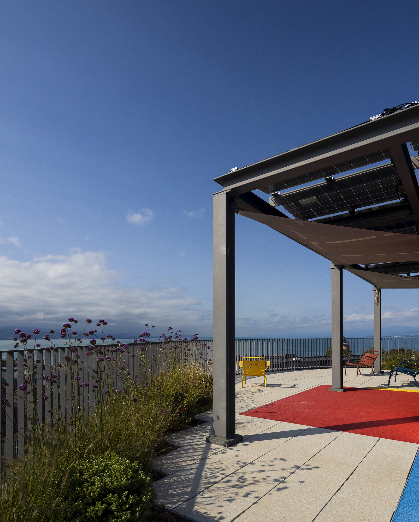 La toiture terrasse est aménagée en espace de rencontre et de loisirs pour les habitants de l’immeuble, grâce au financement du pourcent culturel de la SCHL baptisé « Plus SCHL ». Il comprend un jardin commun offrant une vue imprenable sur le lac, des jeux pour enfants, ainsi qu’une salle de 30m2 pouvant être louée par les locataires de l’immeuble.
