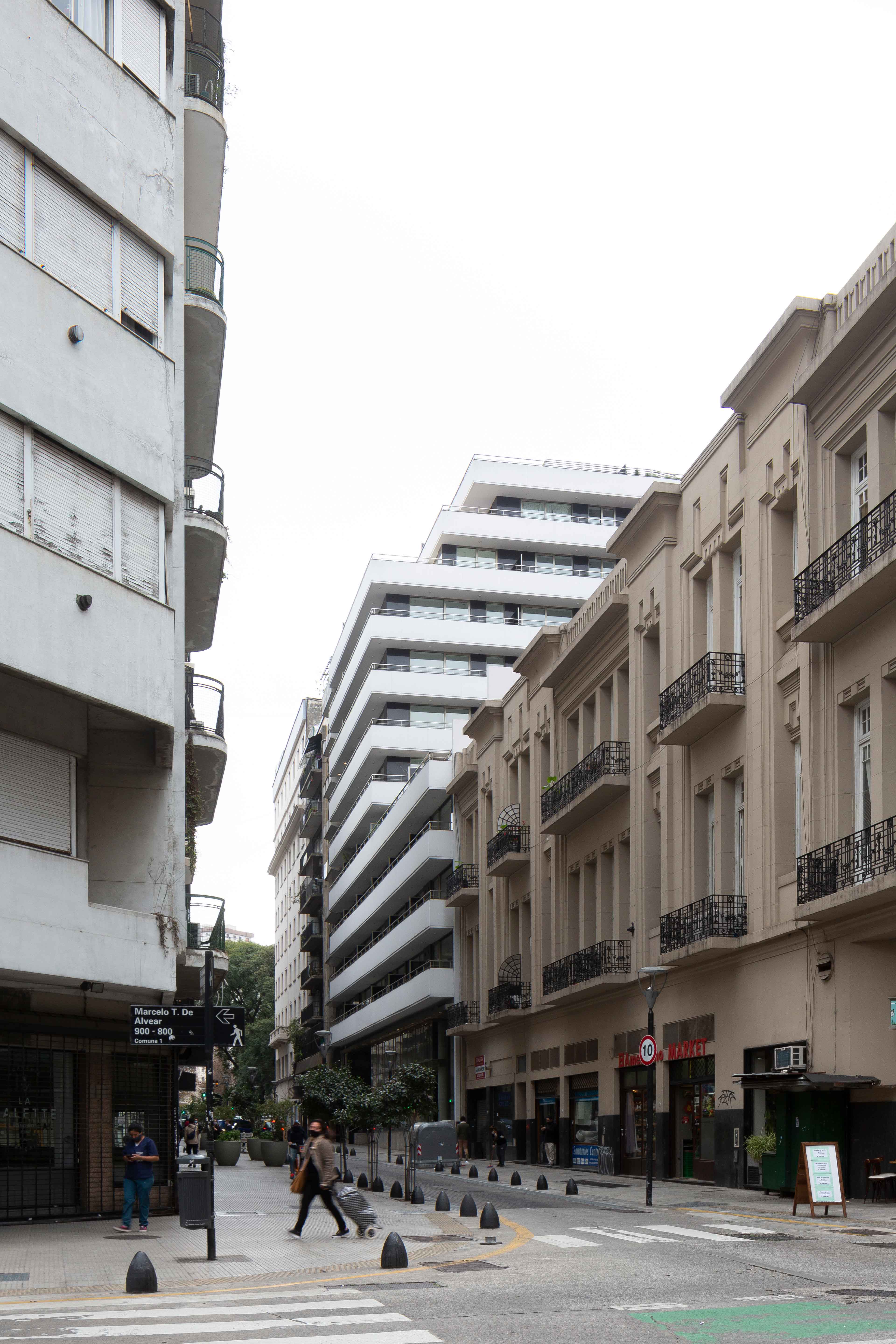 Palacio Paz XXI introduces a new mixed program with a construction that reorganizes the built volume of the block, based on a levelling operation that gives a new continuous urban facade to the set of buildings located towards Santa Fe Av., configuring a substantial improvement of the interior landscape. It replaces the sports club, which left party walls in plain view on both sides towards Esmeralda St., where its imposing blind façade collided with the narrowness of the street and did not provide activity or attractive views to public space. The new building faces the street with continuous balconies, which realignes the height of the existing buildings on both sides and models a series of horizontal bands that introduce great continuities between the different fronts of the building, opening the space to air circulation and natural light.
