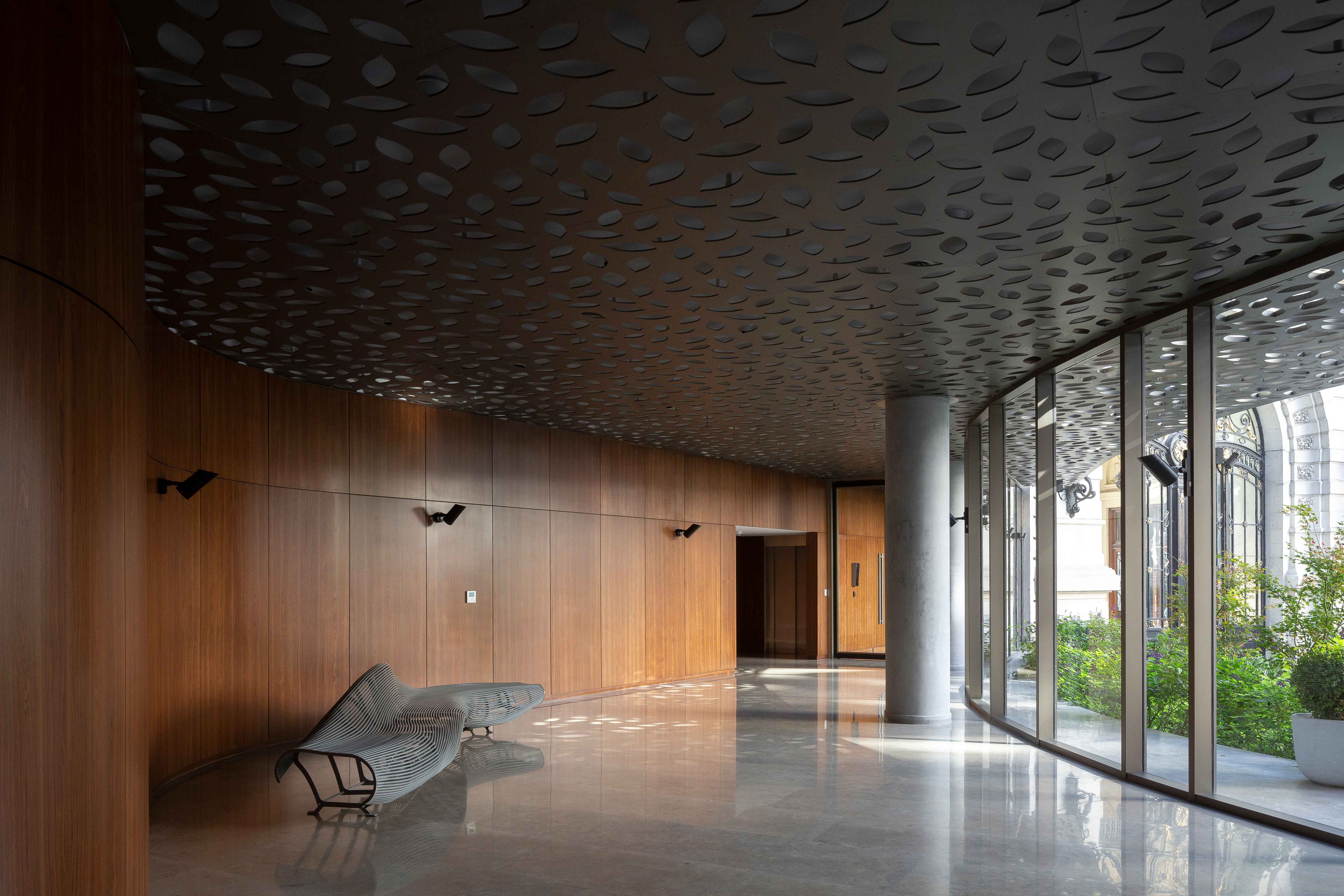 On the ground floor, the entrance gate and the commercial facilities stimulate the continuity of the public space towards the Palace garden with a large continuous canopy and a hall that articulates different accesses and circulations in a fluid and synthetic way and introduces a careful dialogue with the compositional system of porticos and great halls of the old Palace.