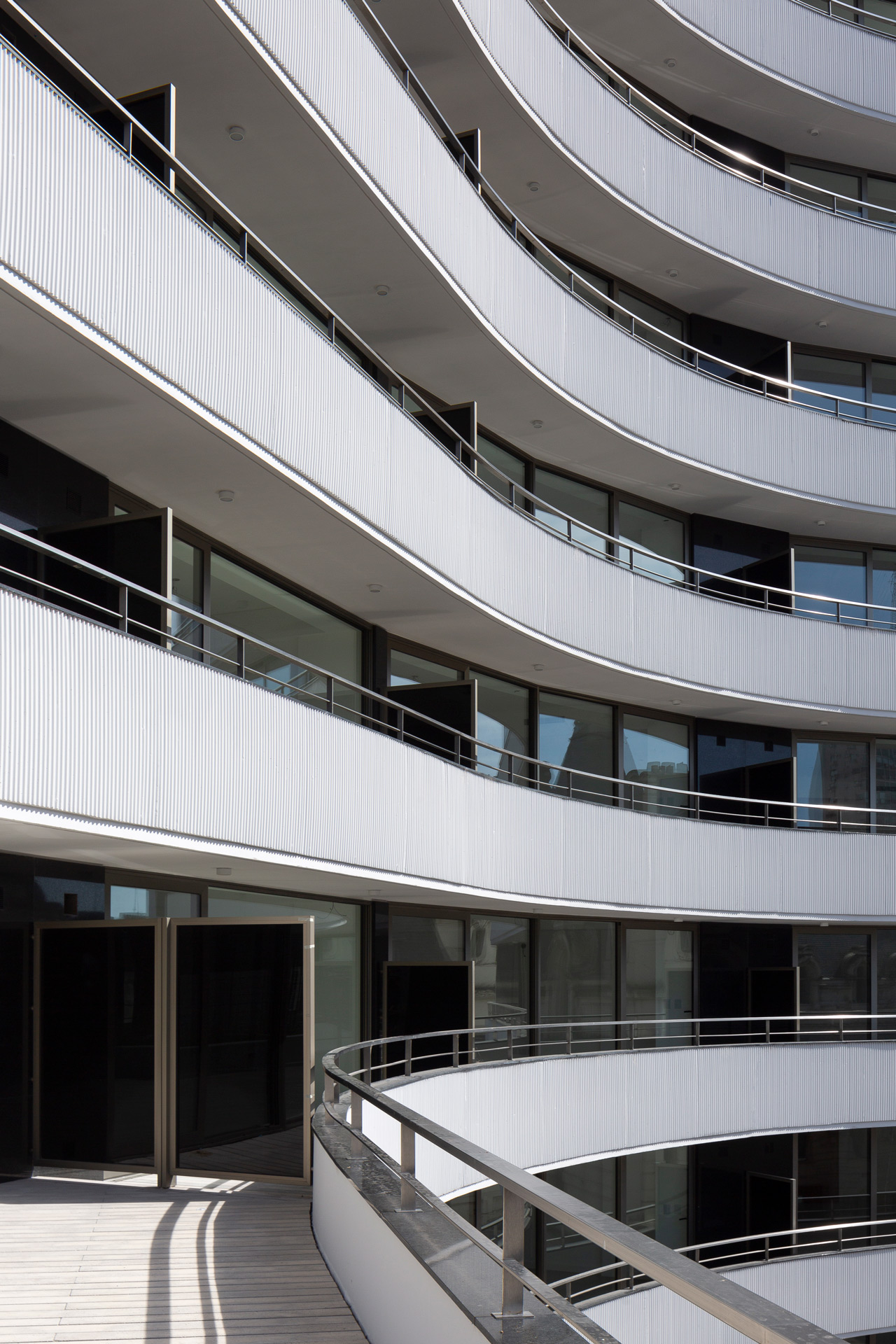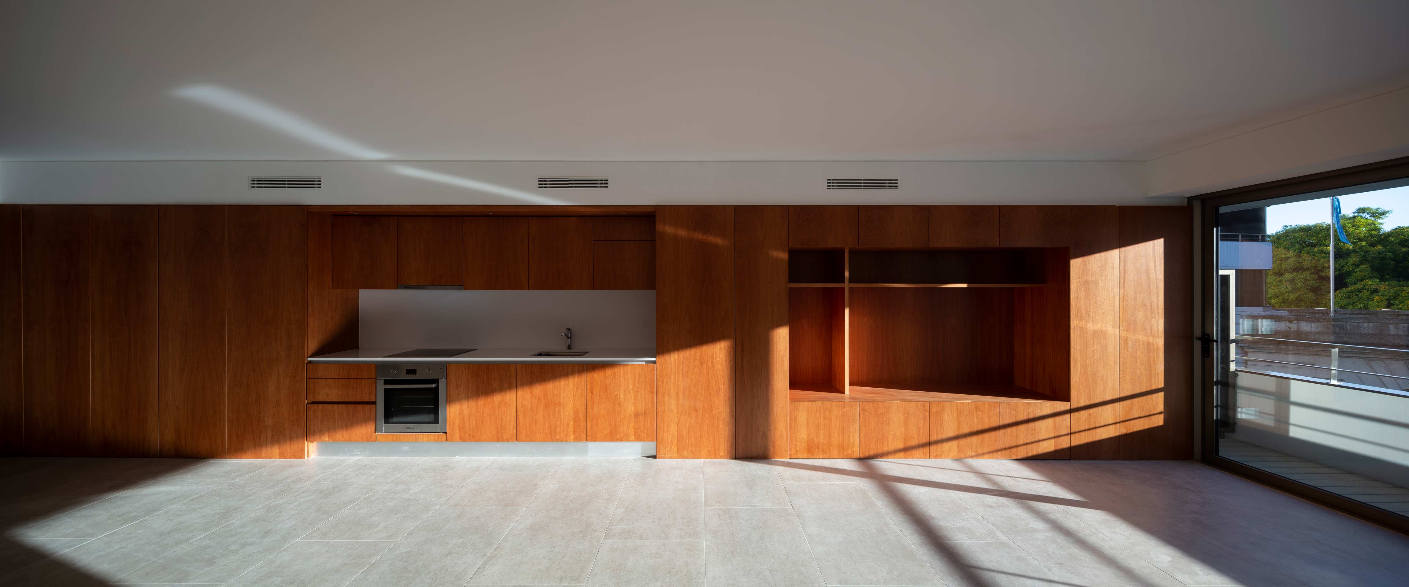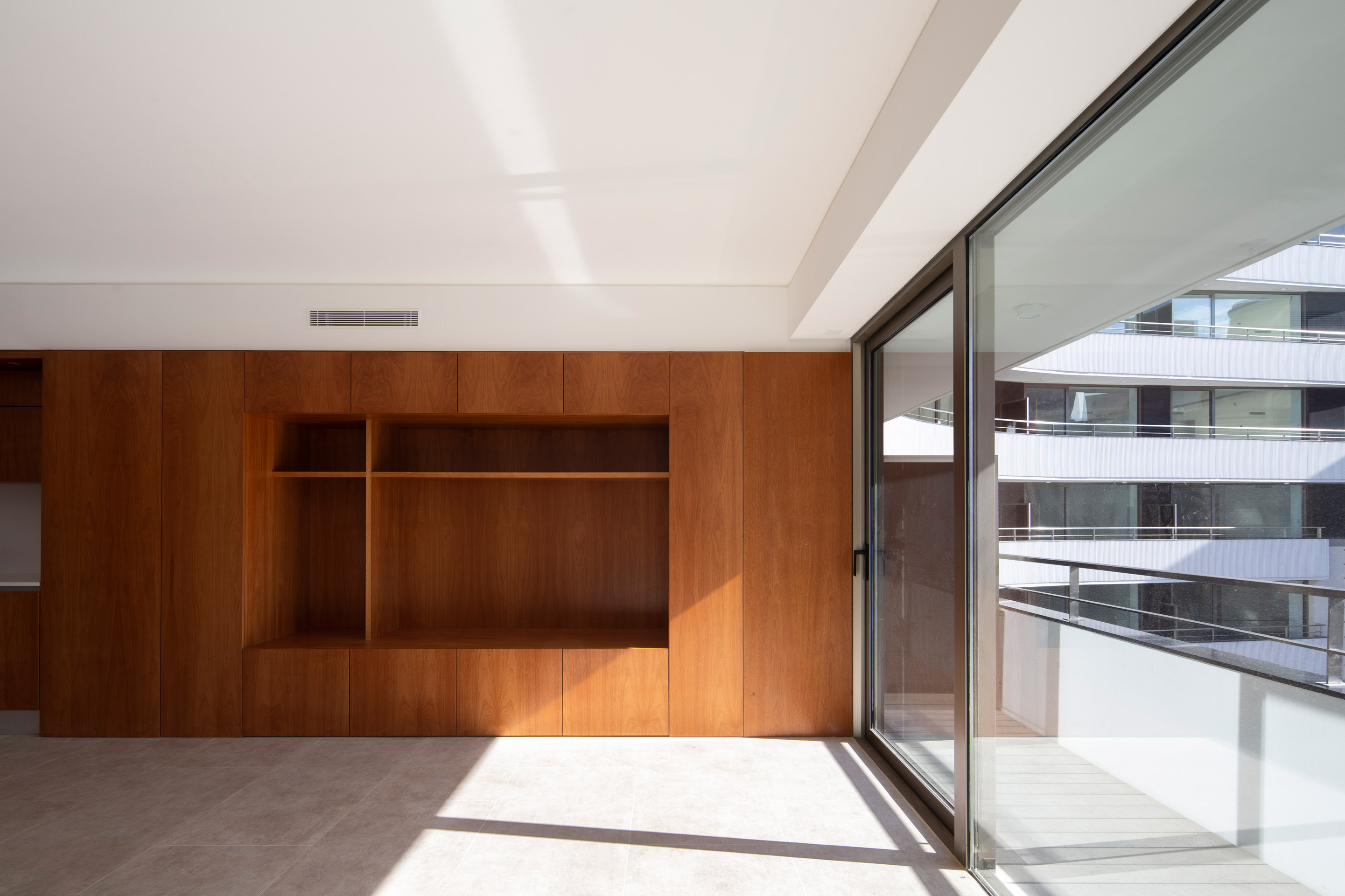 The housing units and offices are organized as unified and spacious environments, with services integrated in a compact and synthetic design. All of them are linked to outdoor expansions that regulate solar incidence and articulate their relationship with the city. The interior spaces are defined by a few selected materials: the direct expression of a carefully executed concrete structure, high-performance carpentry, and a block of cabinets and natural wood panelling integrating all the resources for air conditioning, ventilation, cooking, washing, and storage.