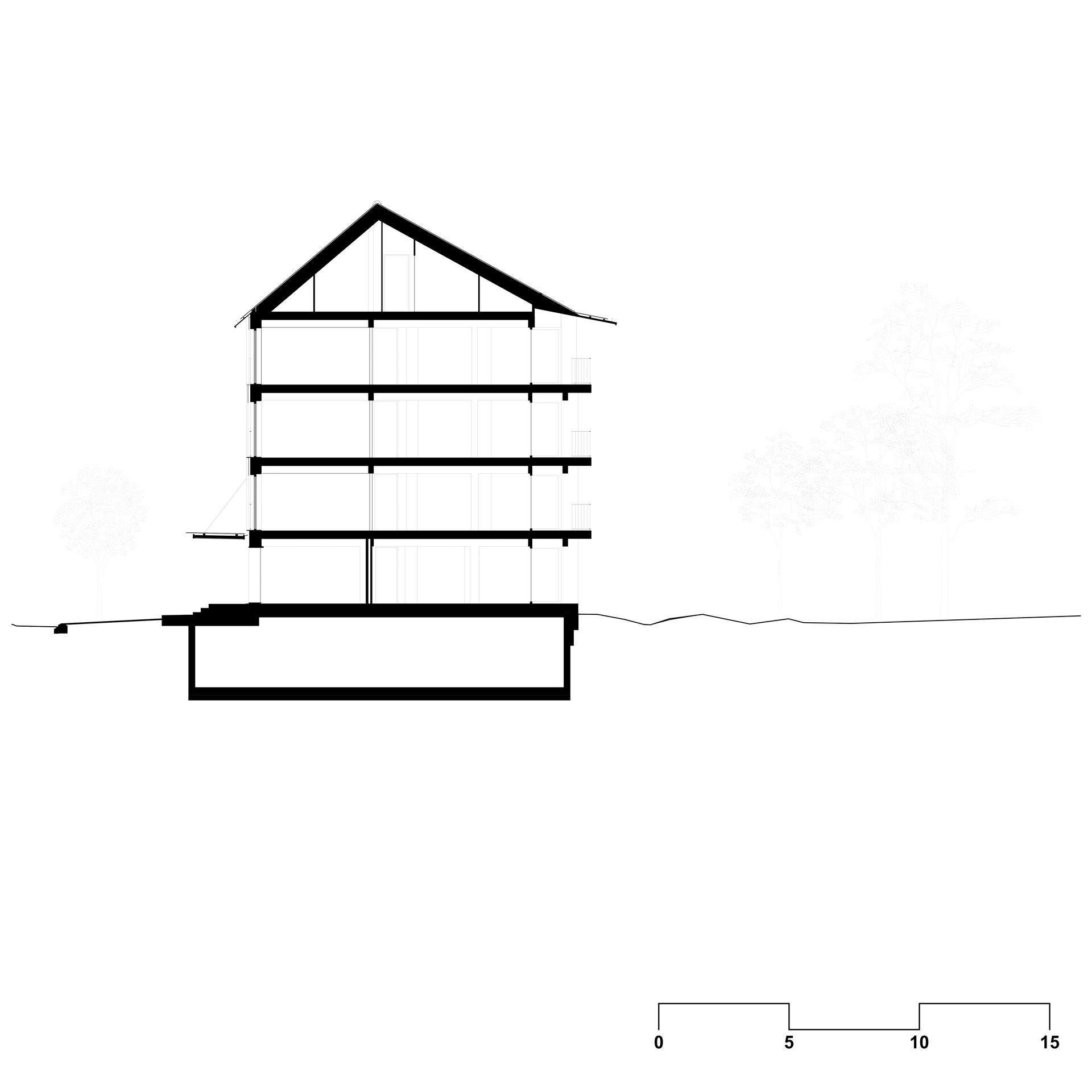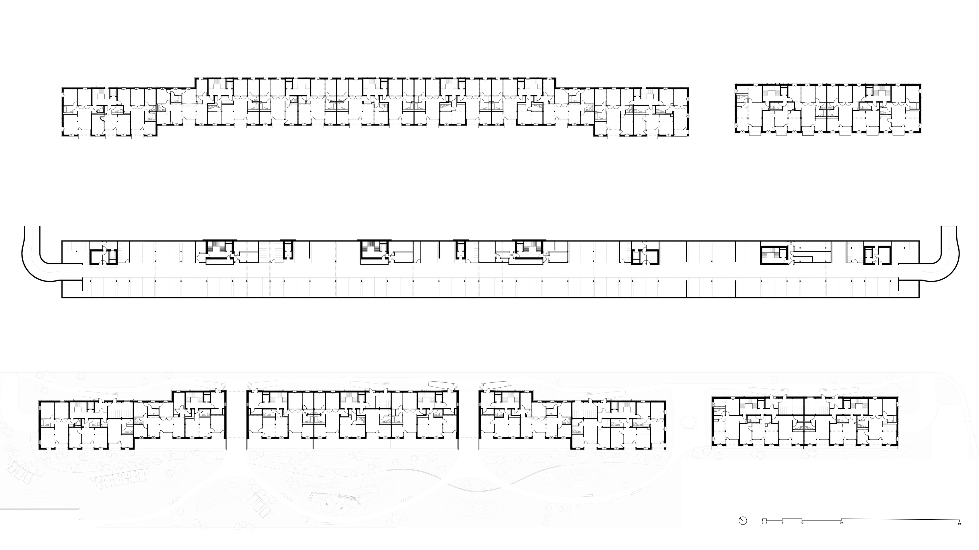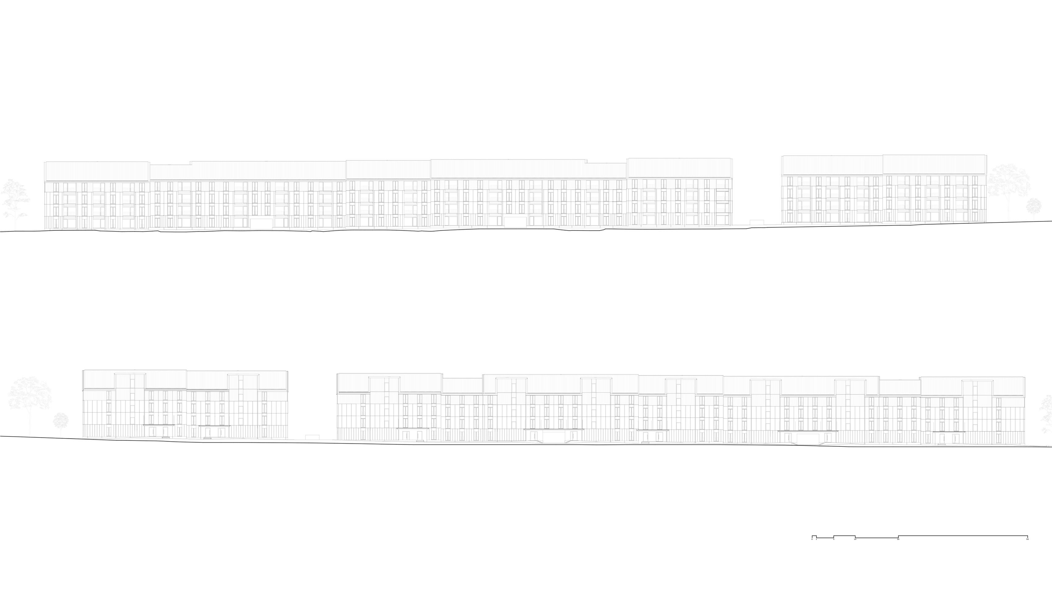 The project, which comprises 95 dwellings, consists of long, slightly fragmented linear volumes, reducing the scale of perception. The buildings are three storeys high with a ground floor and an attic floor housing storage rooms, laundry rooms and technical facilities, all built on a narrow basement. The entire above-ground structure is made of wood, with the exception of the stairwells and lifts, which reduces the load on the basement and considerably reduces the number of piles and the size of the concrete structures in the basement. These construction and structural choices provide economical and sustainable solutions, with a very interesting grey energy balance.