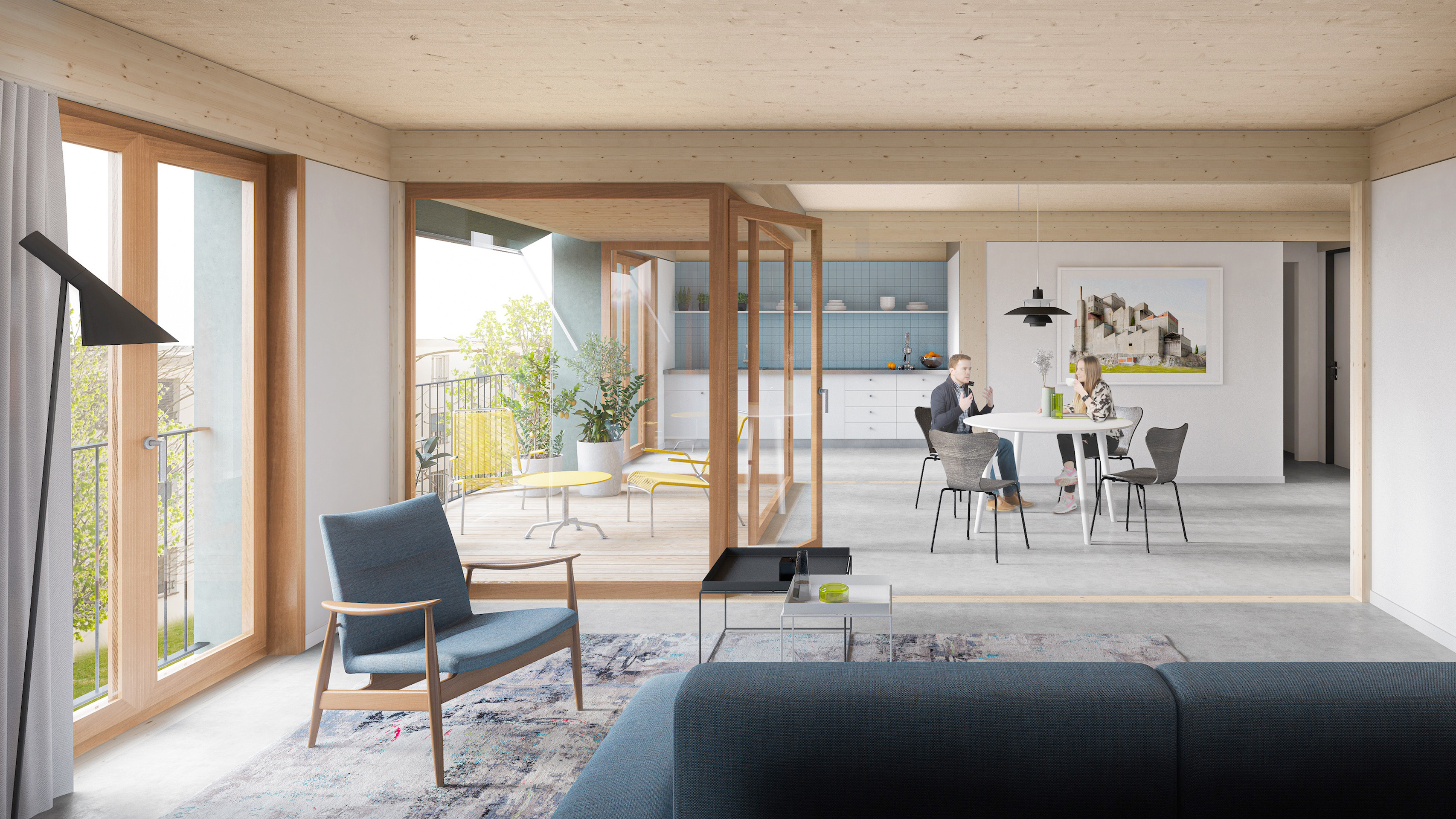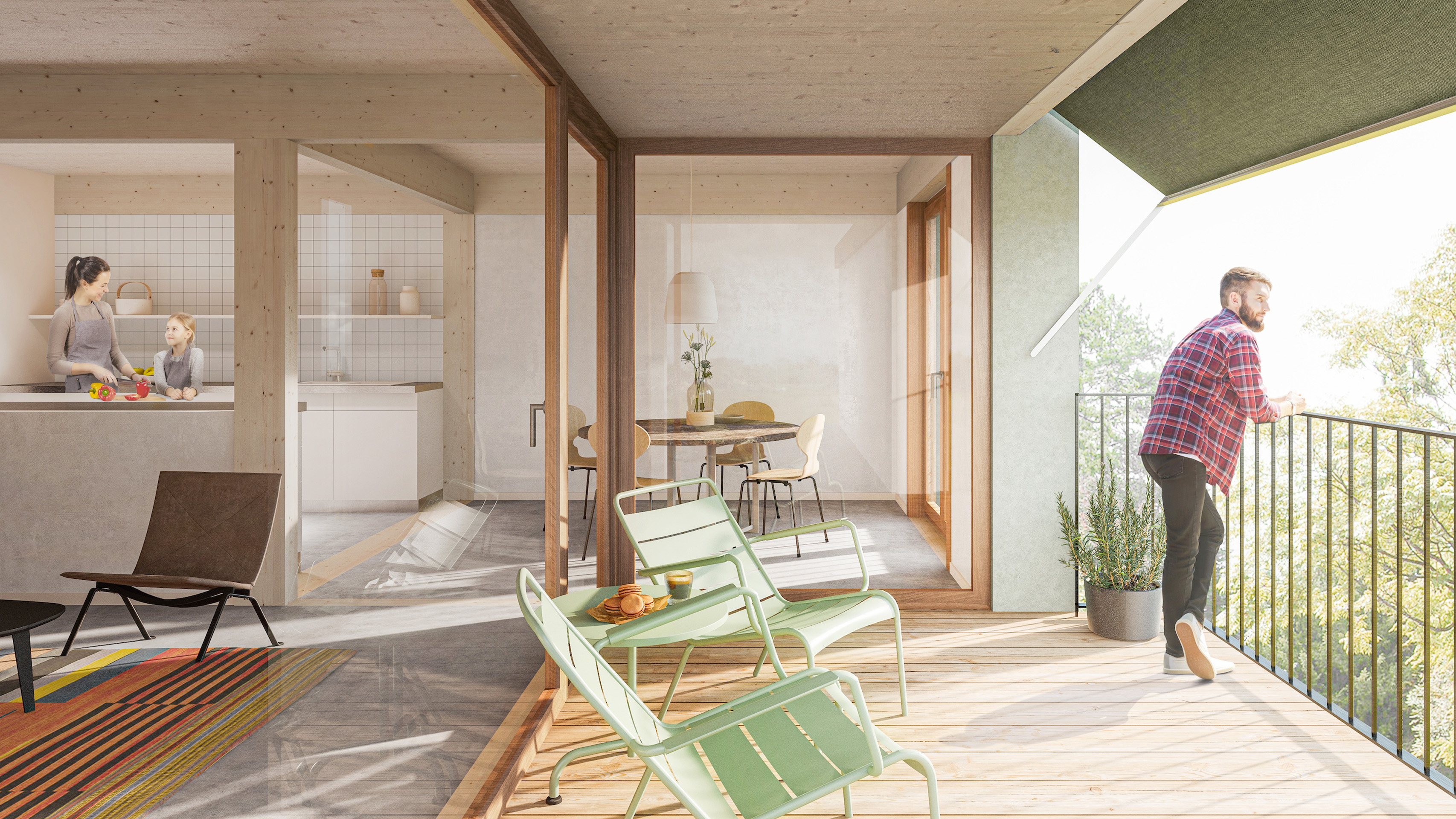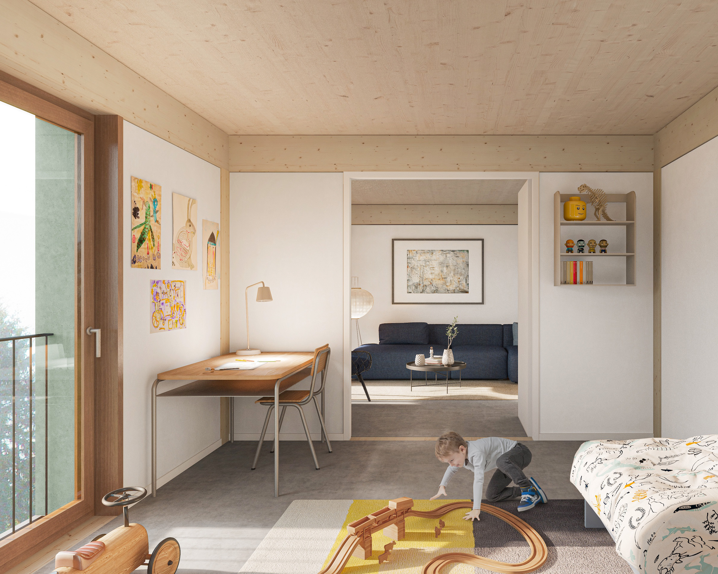 In addition, the construction system has become an architectural theme within the dwellings. Based on a strict structural grid, offering flexibility of use, the dwellings open generously onto a park-garden for community living and benefit from exposed woodwork, creating a warm and welcoming atmosphere.