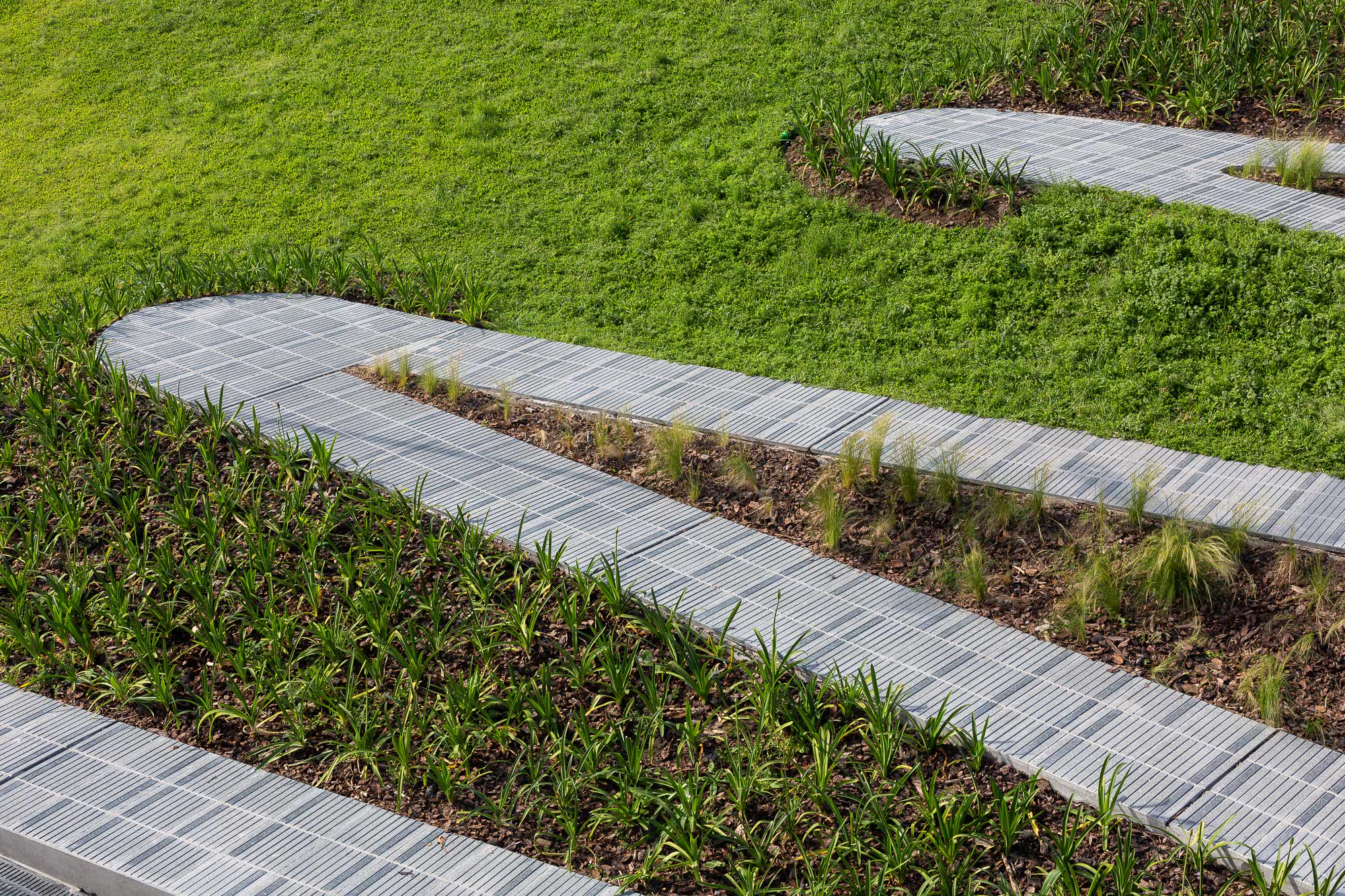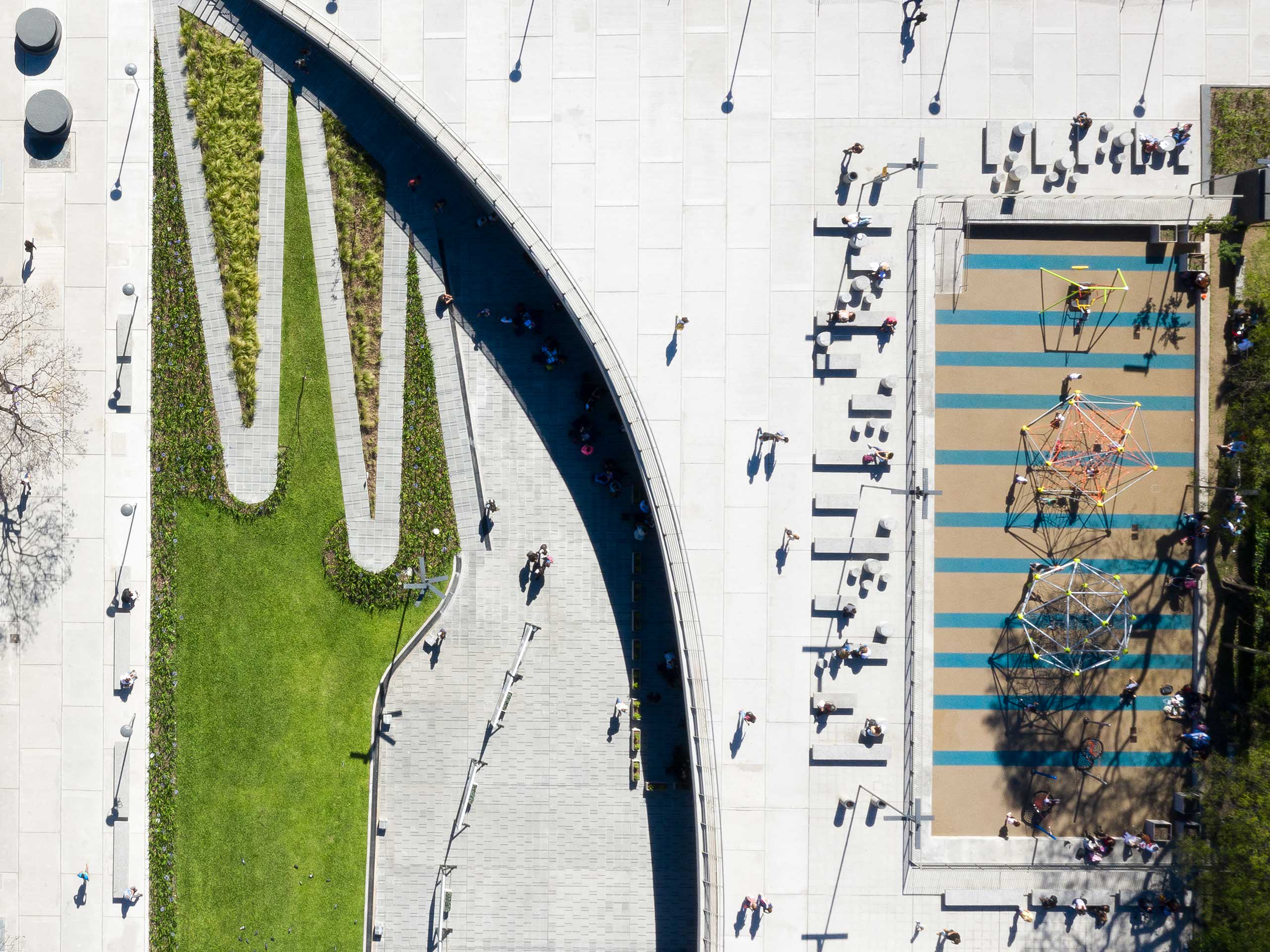 In terms of landscaping, the project proposes a low to medium maintenance park with vegetation that has proven resistance to urban use and the existing climate. The existing vegetation is maintained and incorporated into the landscaping project, with only the necessary phytosanitary treatment or pruning of the trees. Native or naturalised exotic vegetation (the latter in quantities of less than 10%) with low or medium water requirements is also incorporated. As all the landscaping will be developed on the slabs that house the underground car parks, second or third magnitude trees are proposed, suitable for growing in such conditions, with fast or medium growth, varied foliage and flowering, guaranteeing strong colour contrasts between flower beds throughout the year, favouring the use of large masses of the same species.